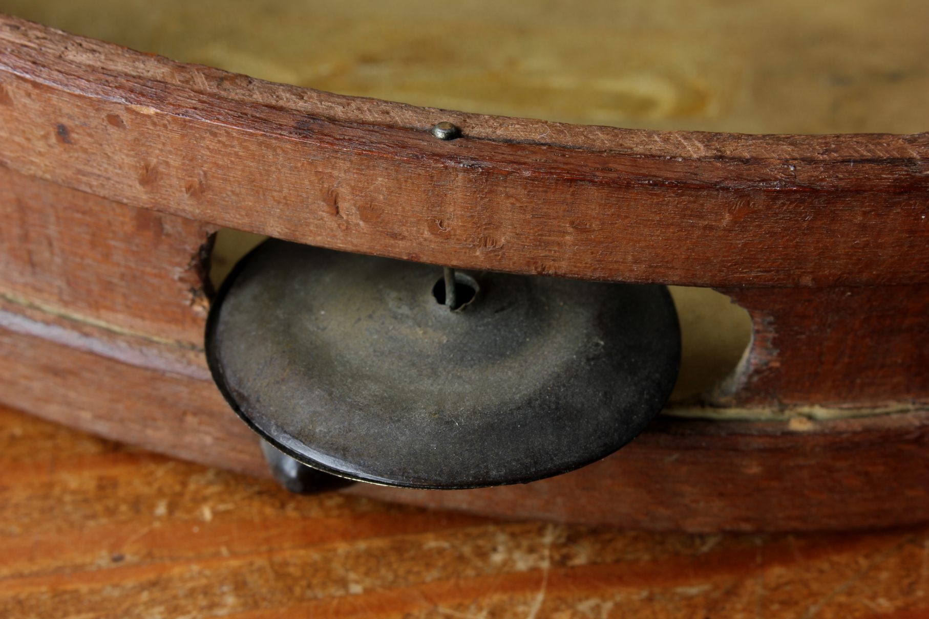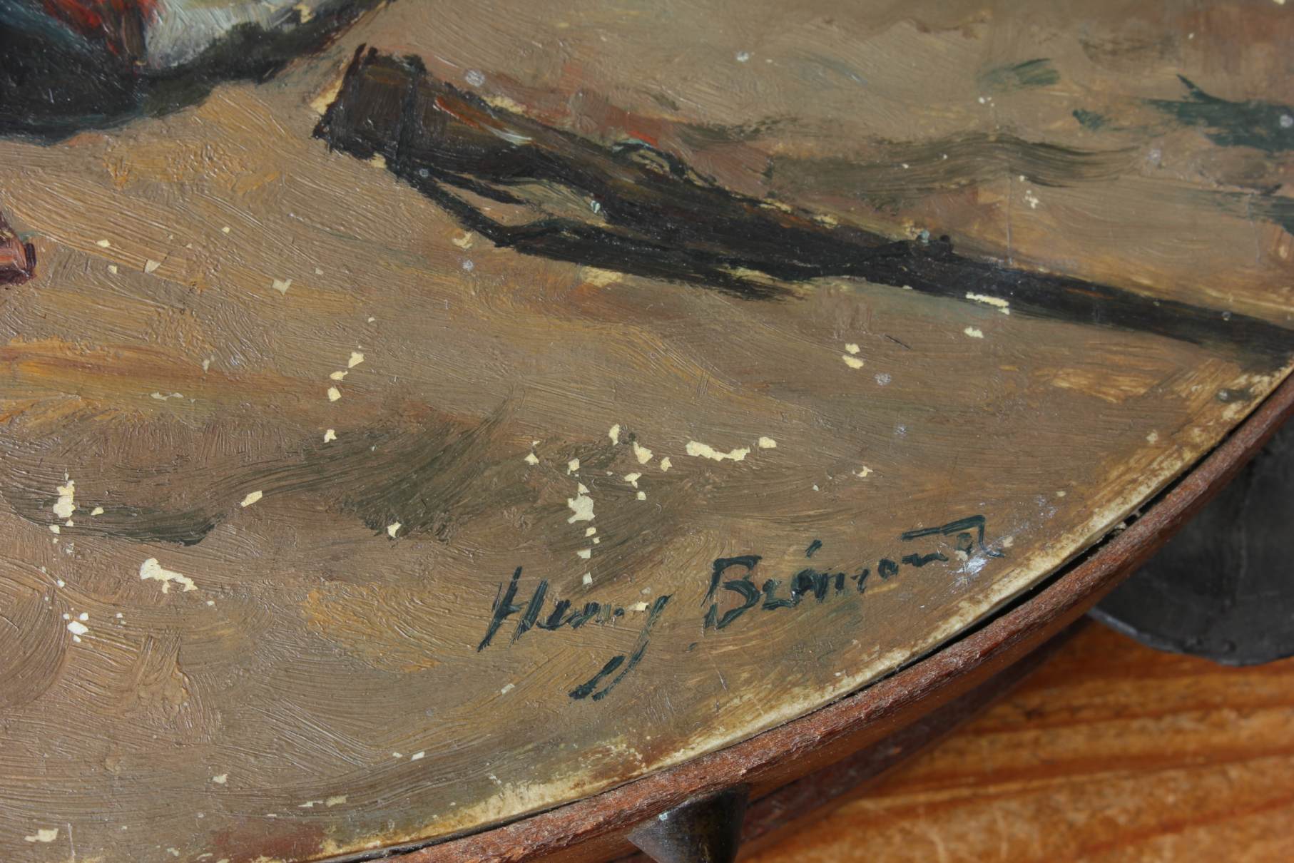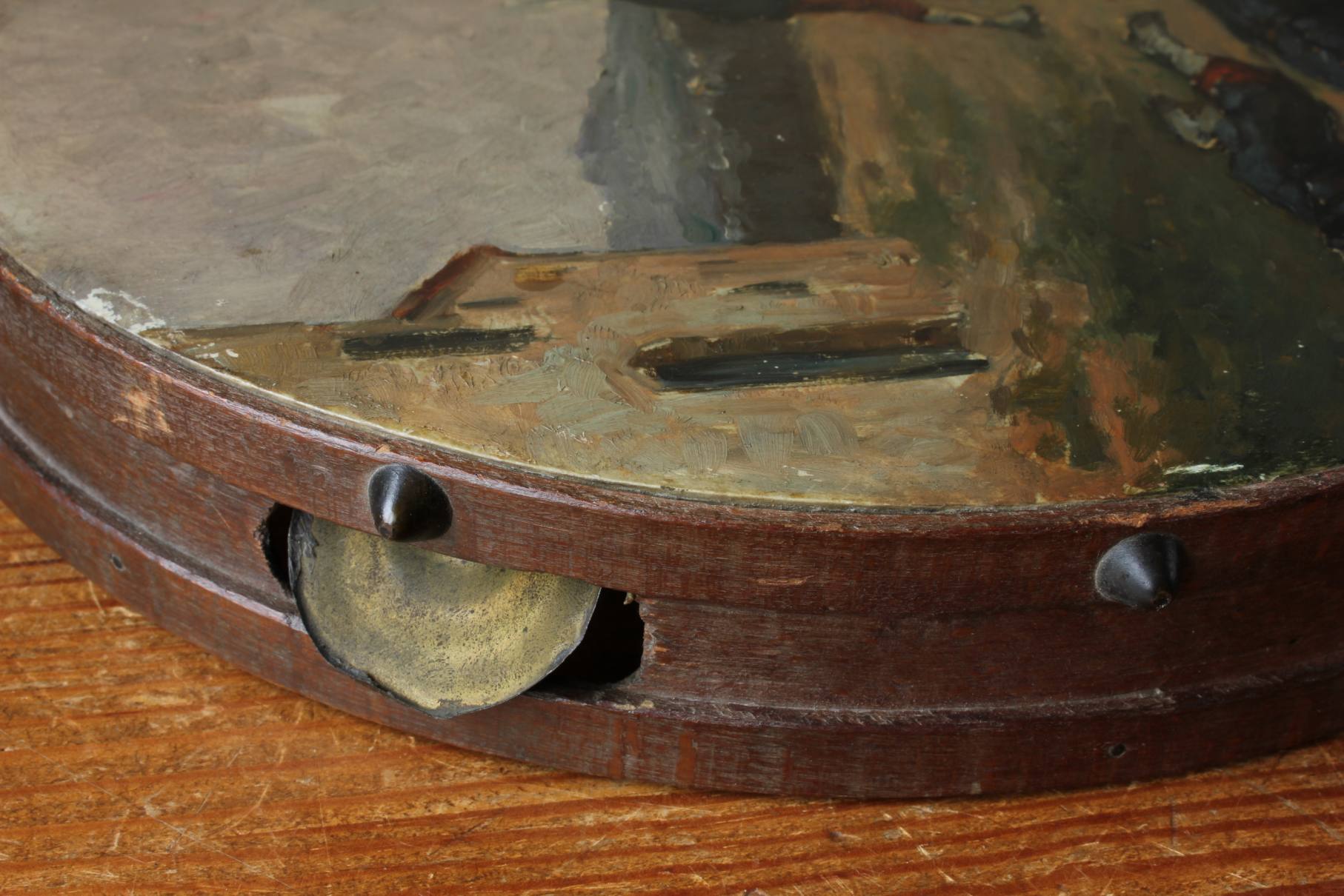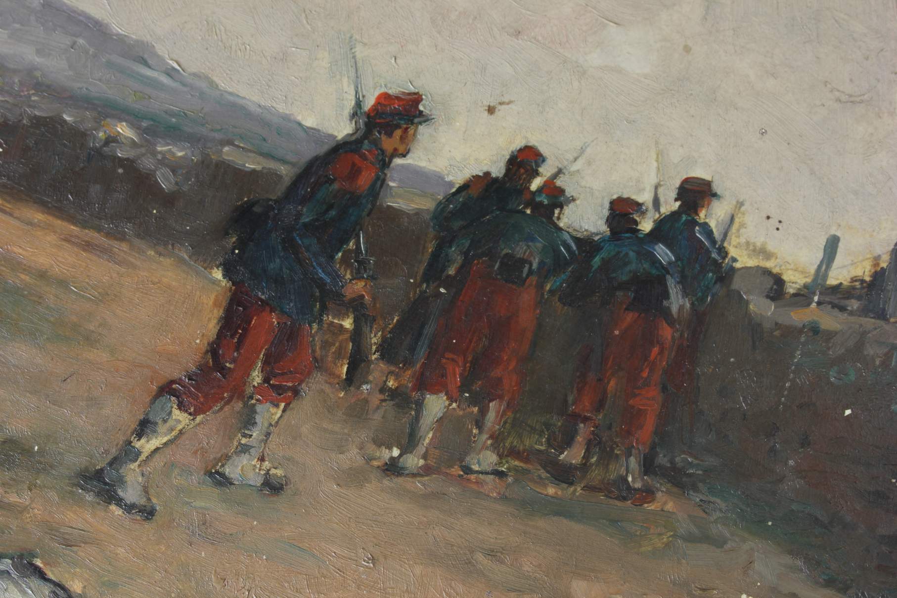 This antique French painted tambourine which dates from the late 19th century is handsomely painted by the artist with oil paints and features a French military scene with French soldiers in battle and is signed by the artist to the front.