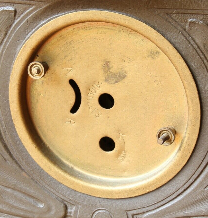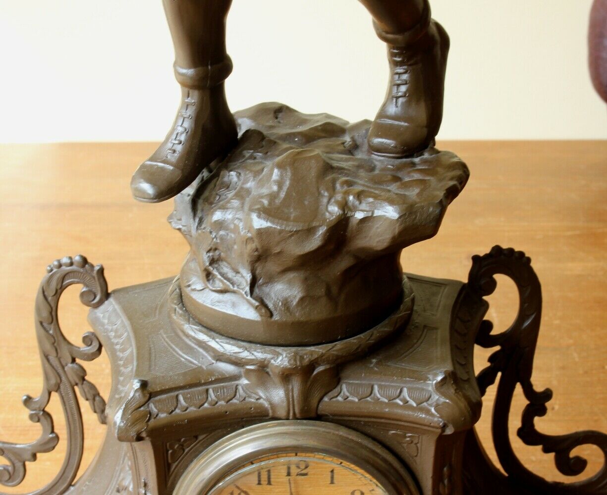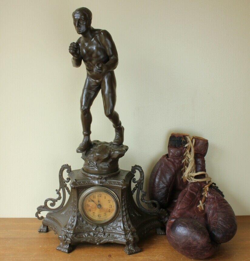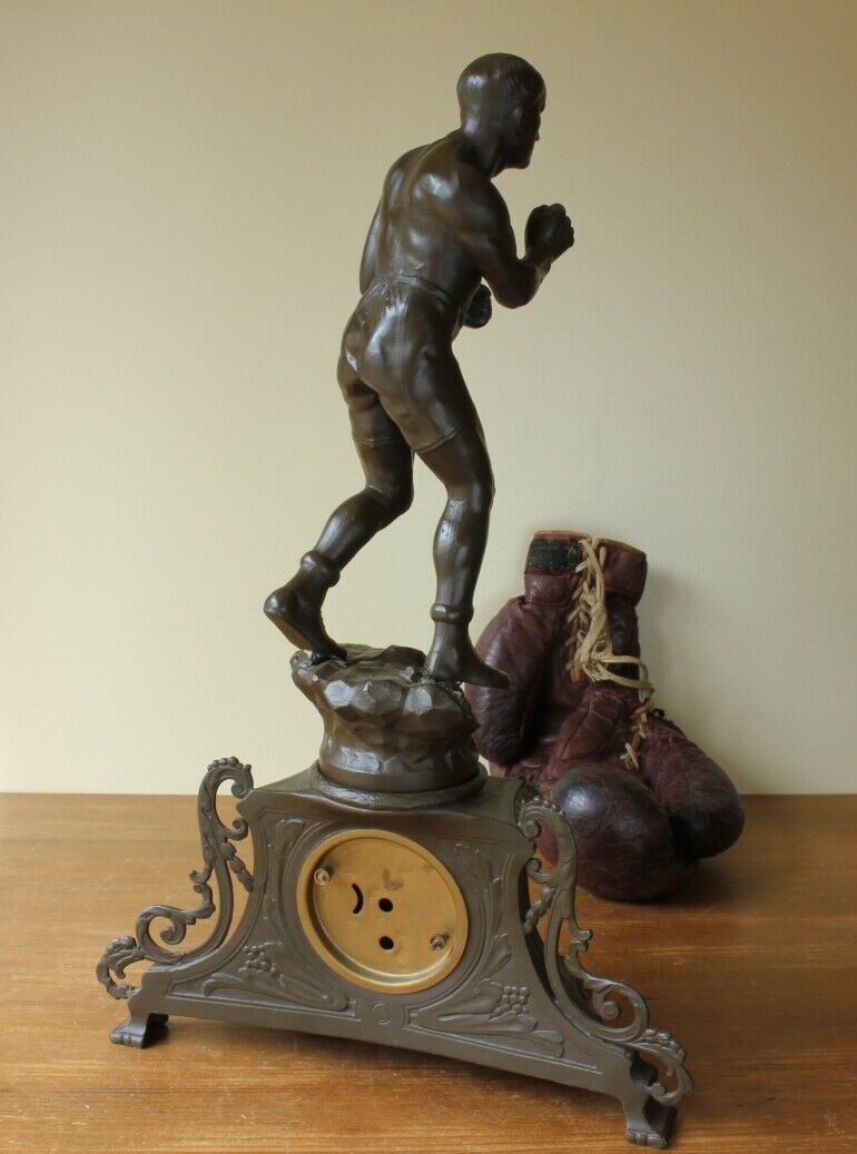 This large antique boxing statue which dates from the early 1900's is of an early bare knuckle boxer and has a clock in the base marked Aiguilles. This highly decorative figure which was part of a French clock garniture is made of cast metal with a brown painted finish.