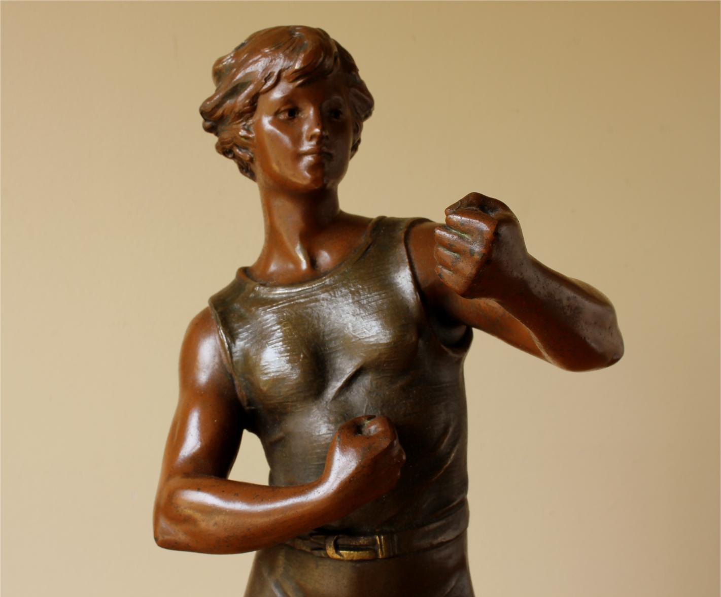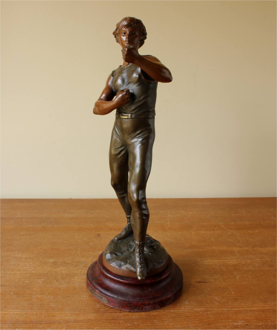 This boxer figure which dates from the late 19th century is made of hollow cast metal with bronze highlights, is a large size and is signed with the artist's name of Louis Moreau.