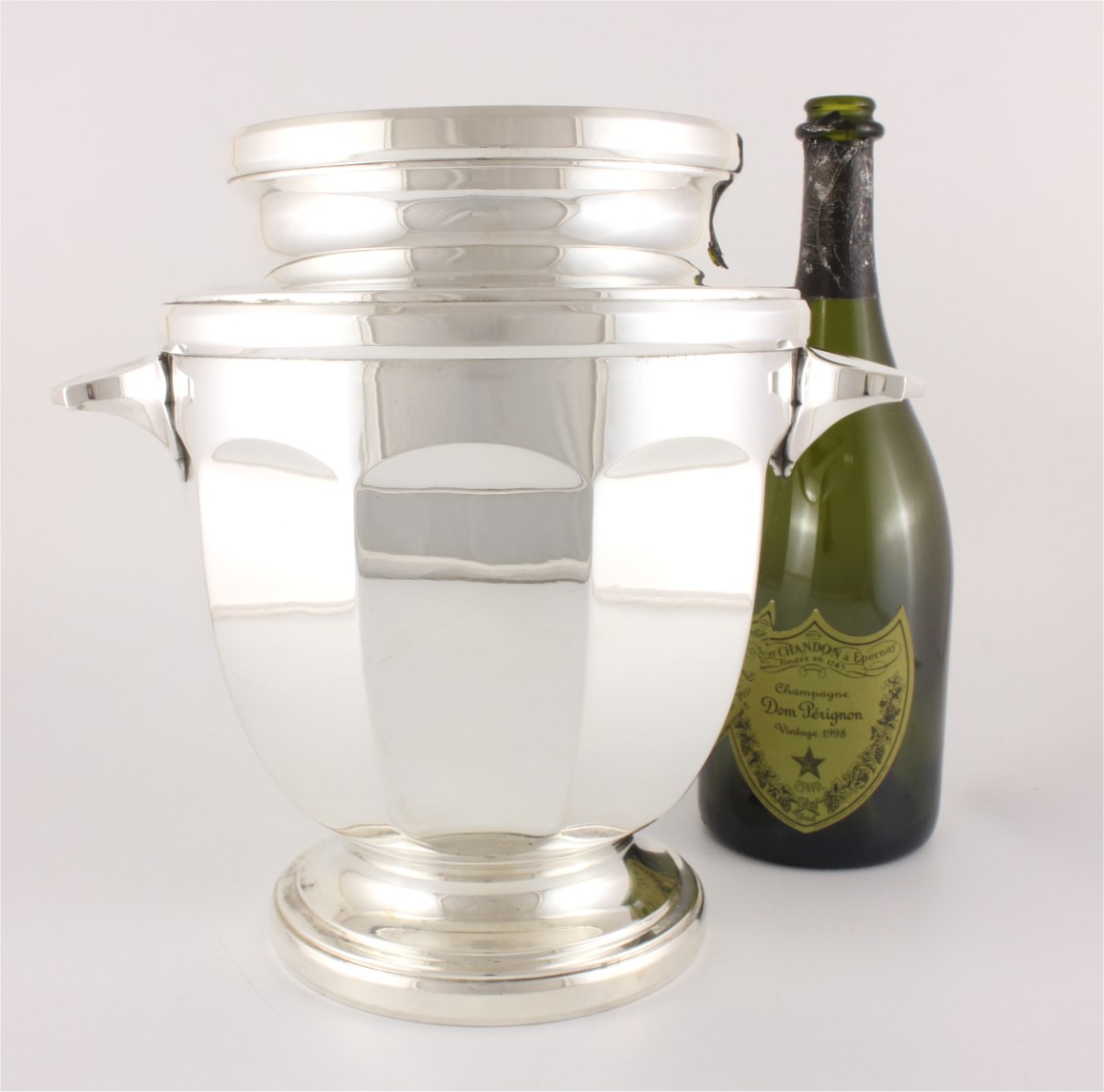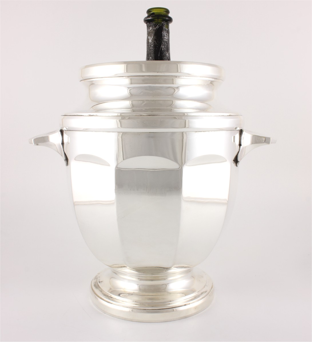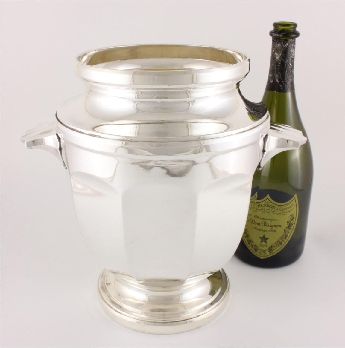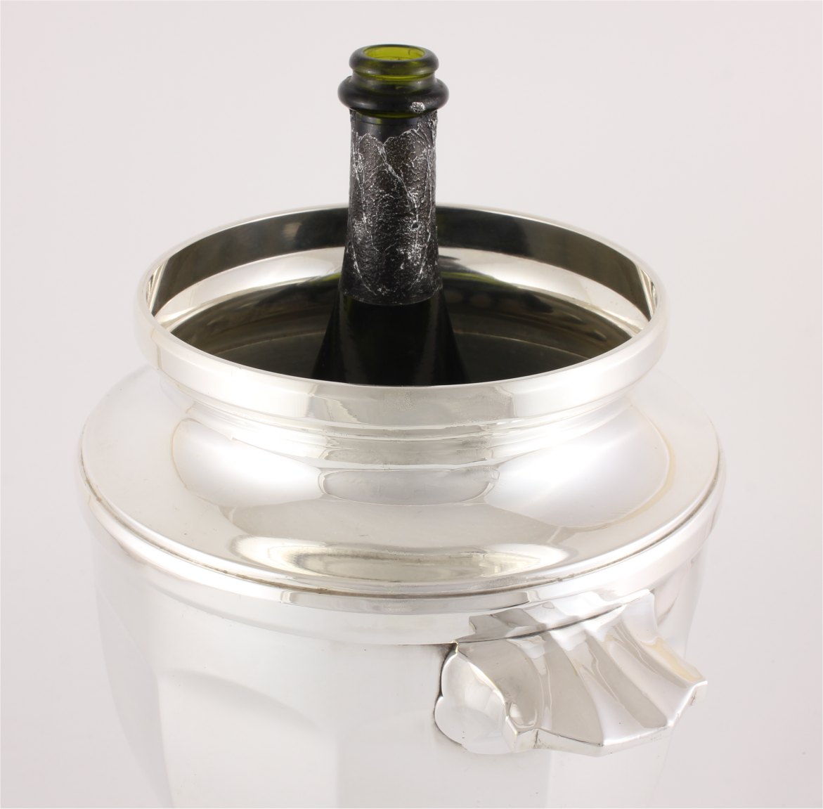 This wonderful antique French Champagne cooler which is made of silver plate has a beautifully shaped body, sits on a raised foot and has two side handles.