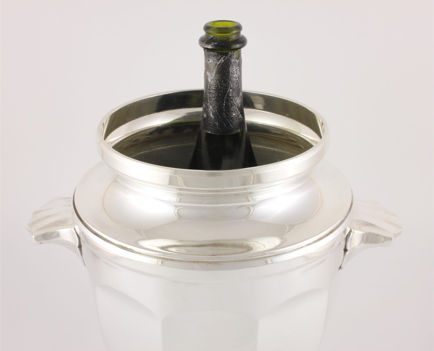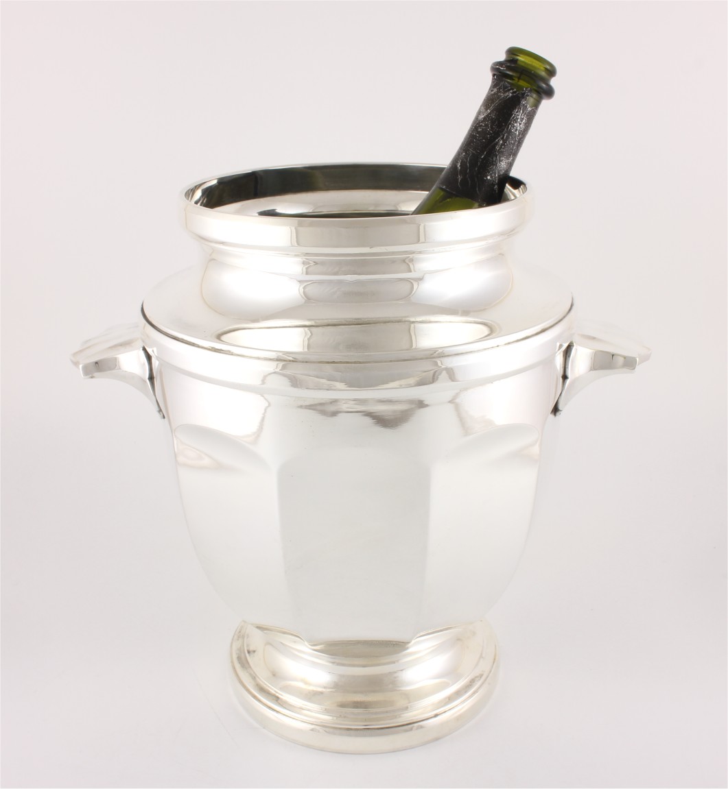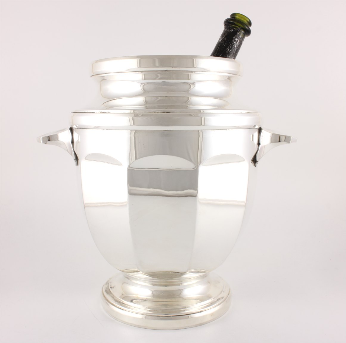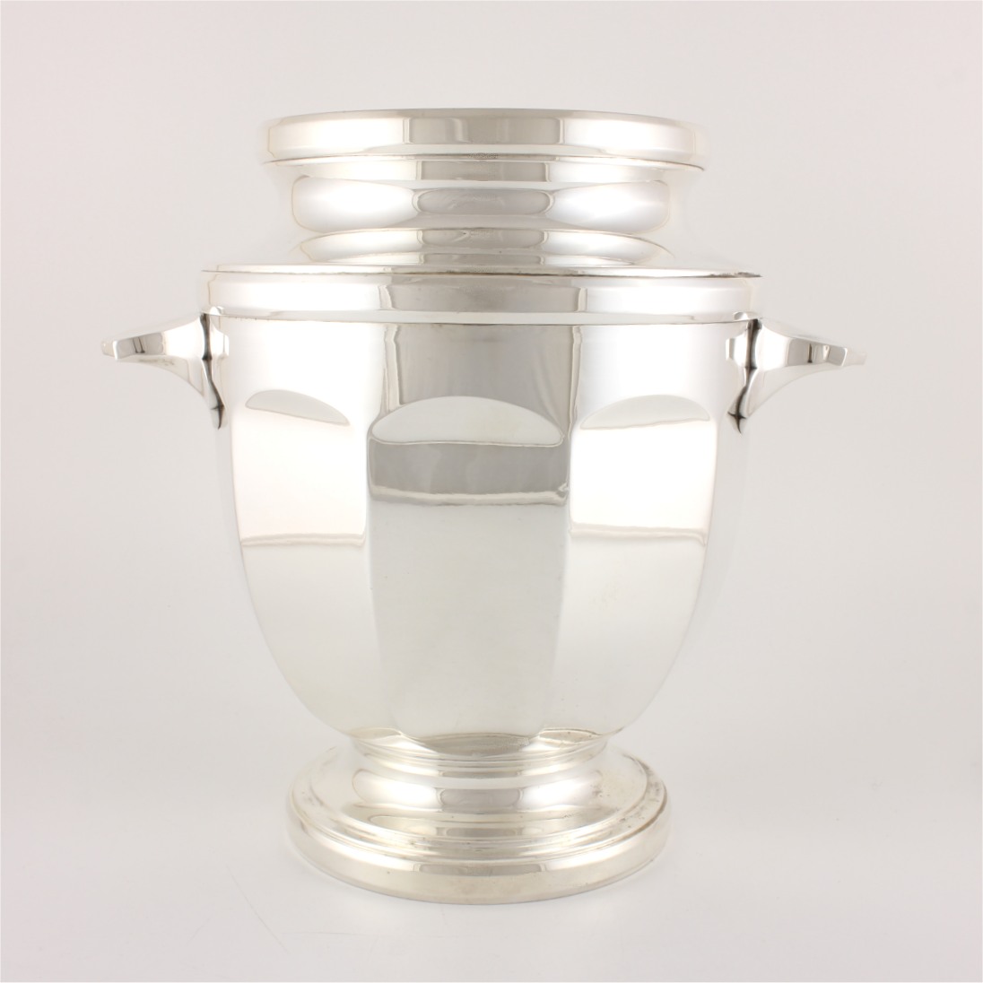 This wonderful antique French Champagne cooler which is made of silver plate has a beautifully shaped body, sits on a raised foot and has two side handles.