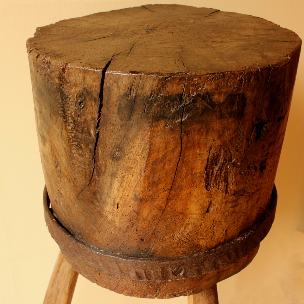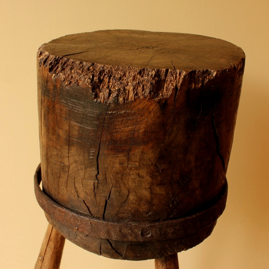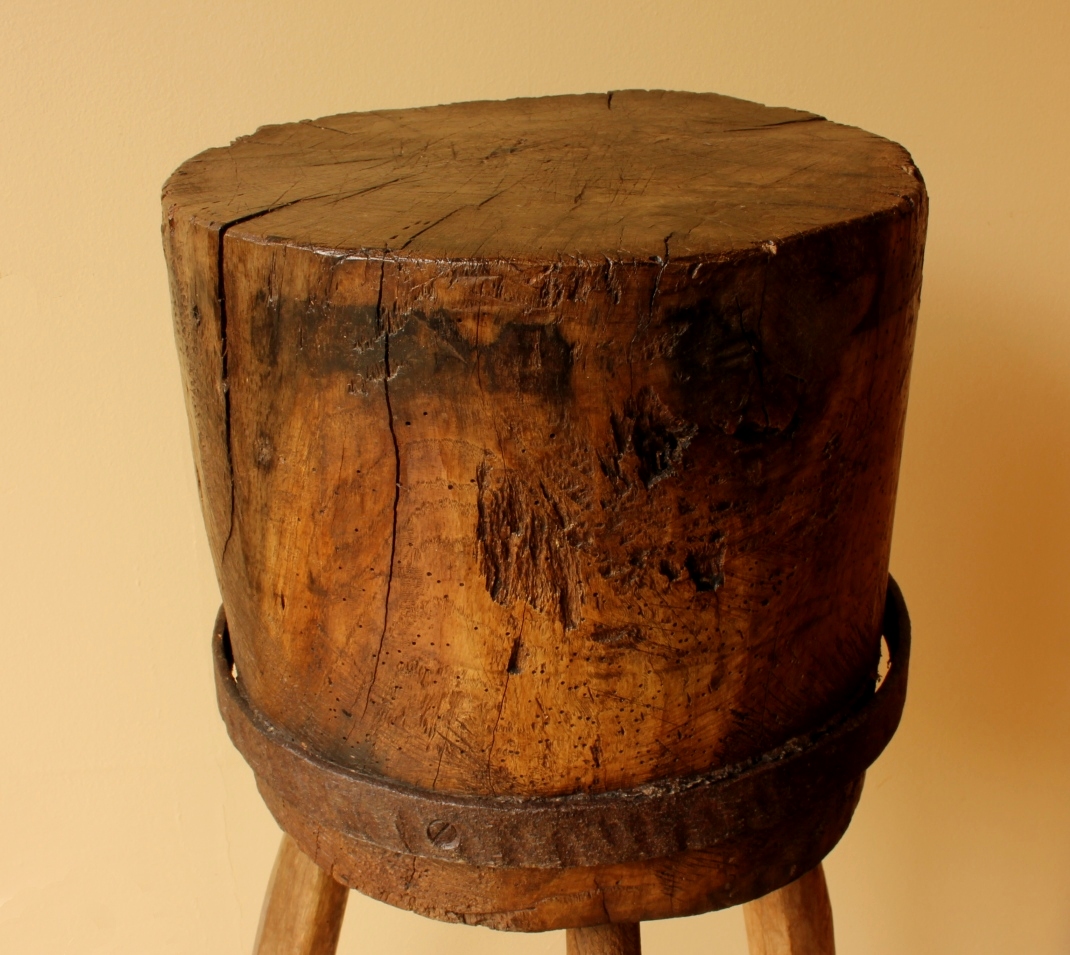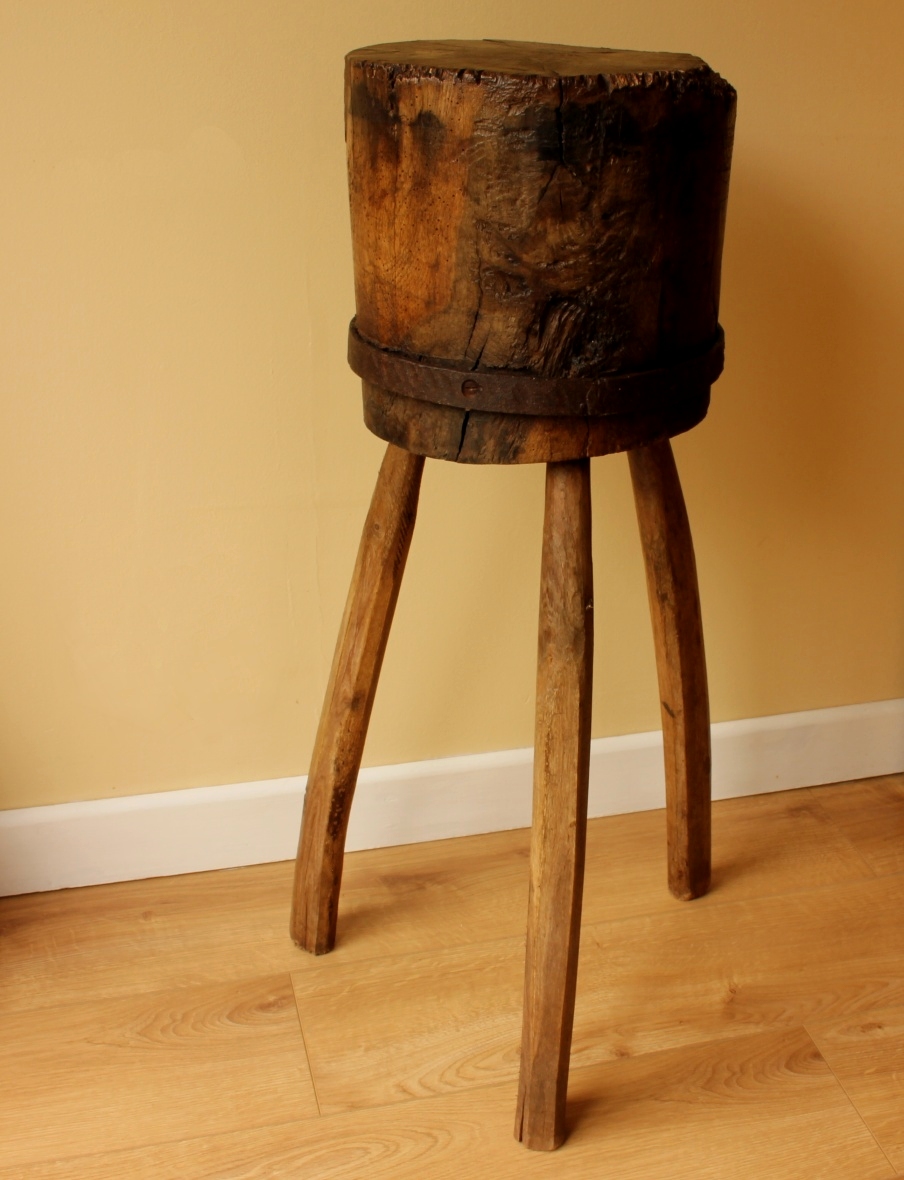 This highly decorative antique butcher's block has a wonderful rustic look with a log block, three chamferred legs and iron banding.