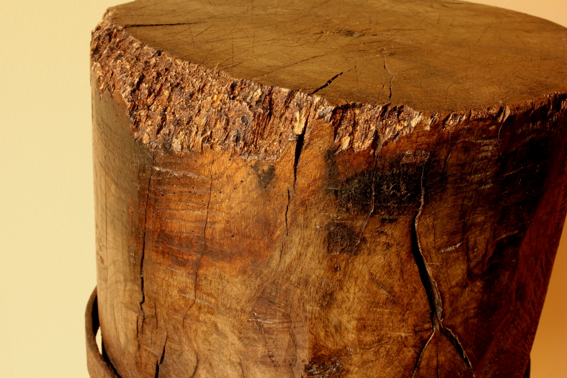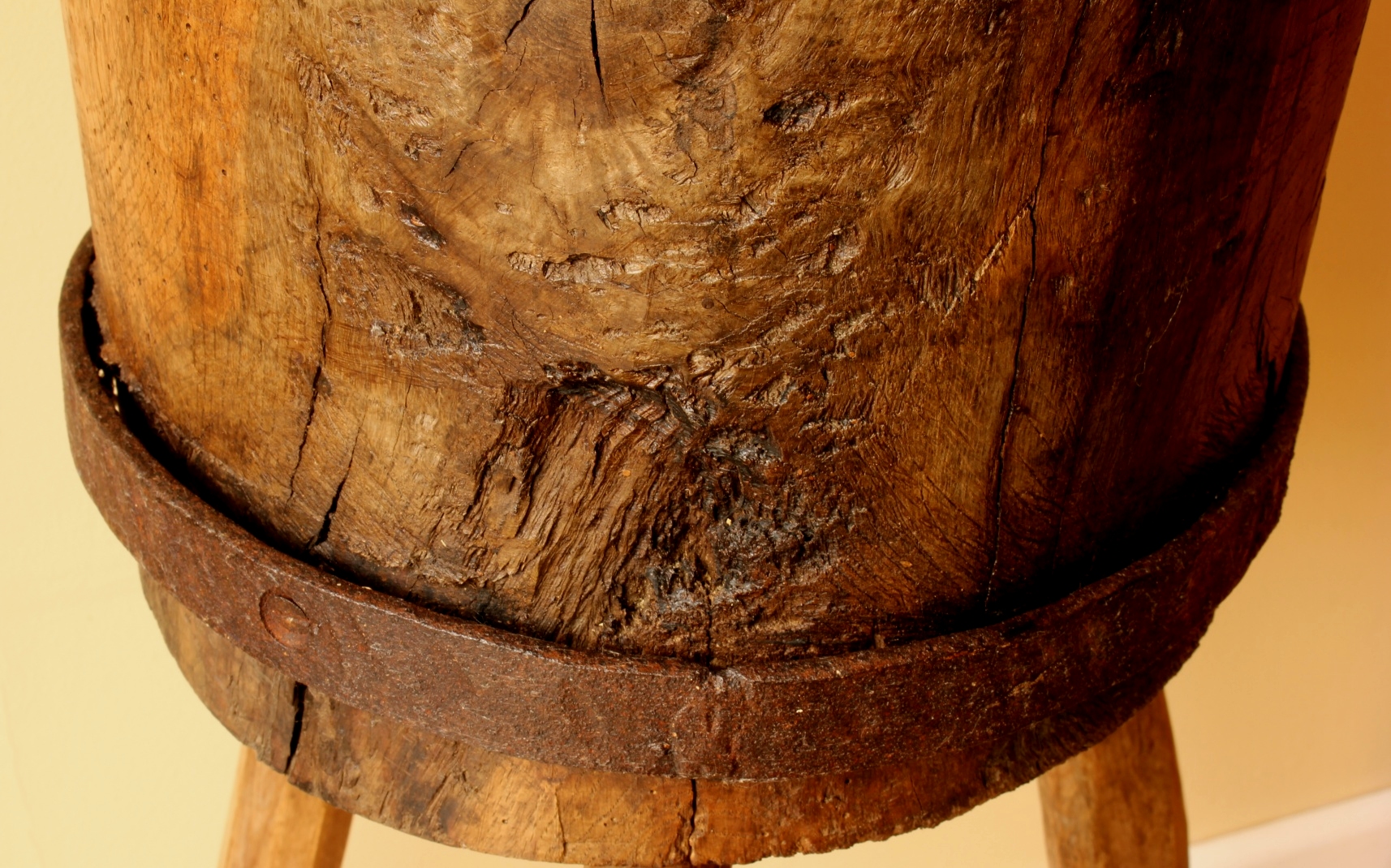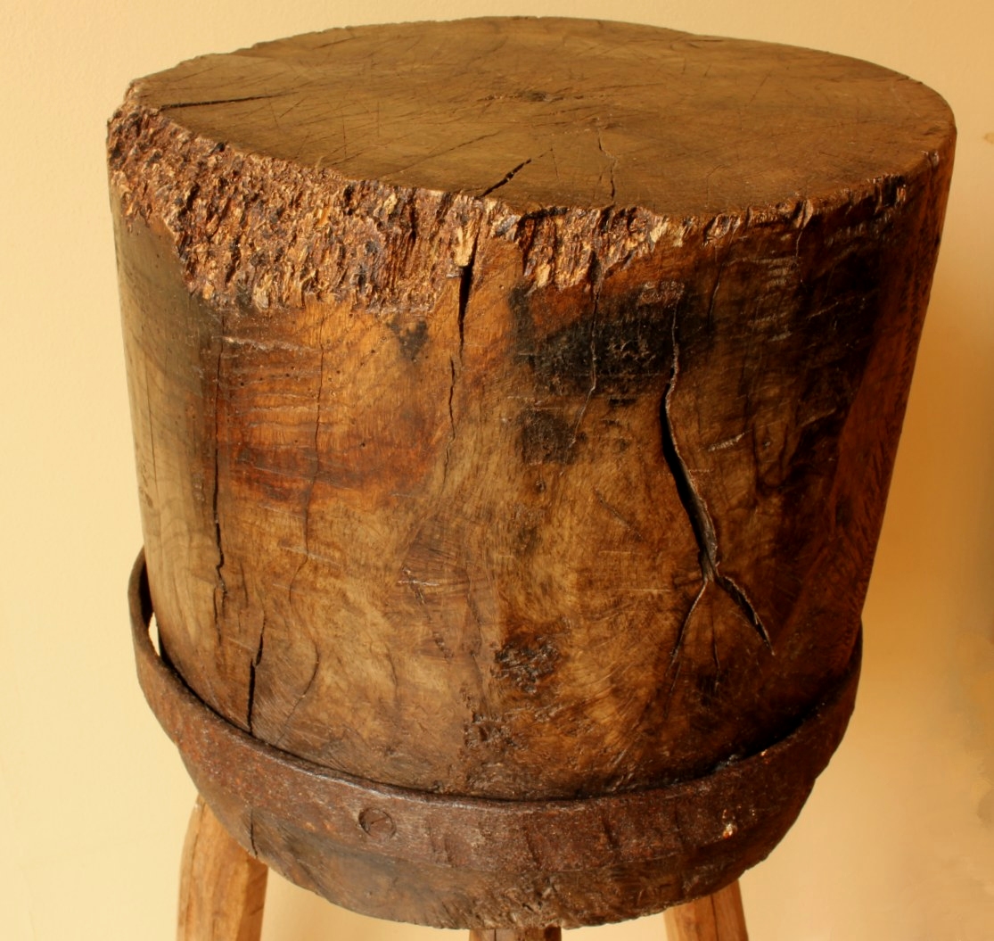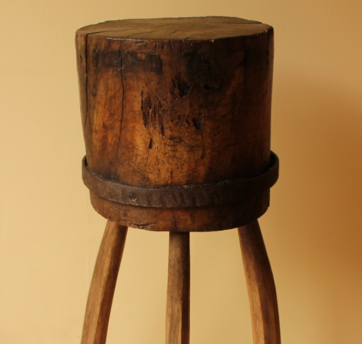 This highly decorative antique butcher's block has a wonderful rustic look with a log block, three chamferred legs and iron banding.