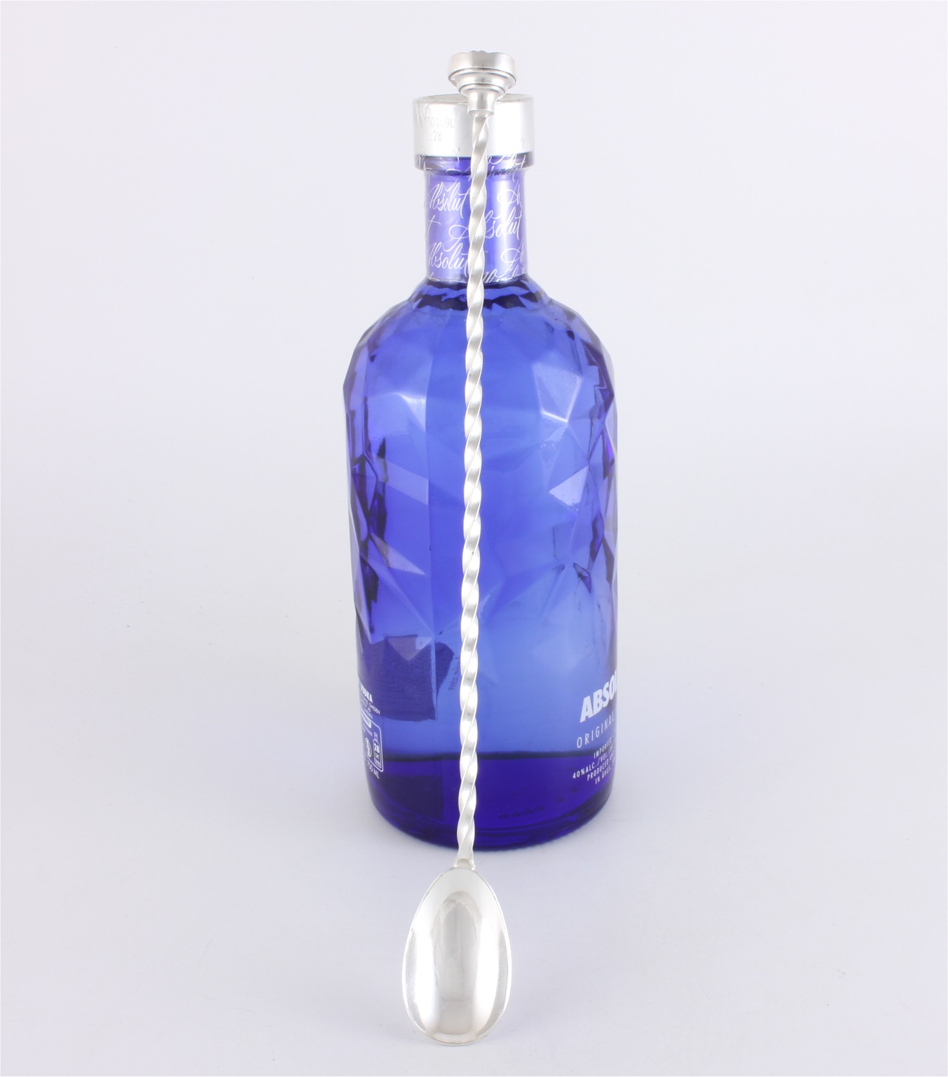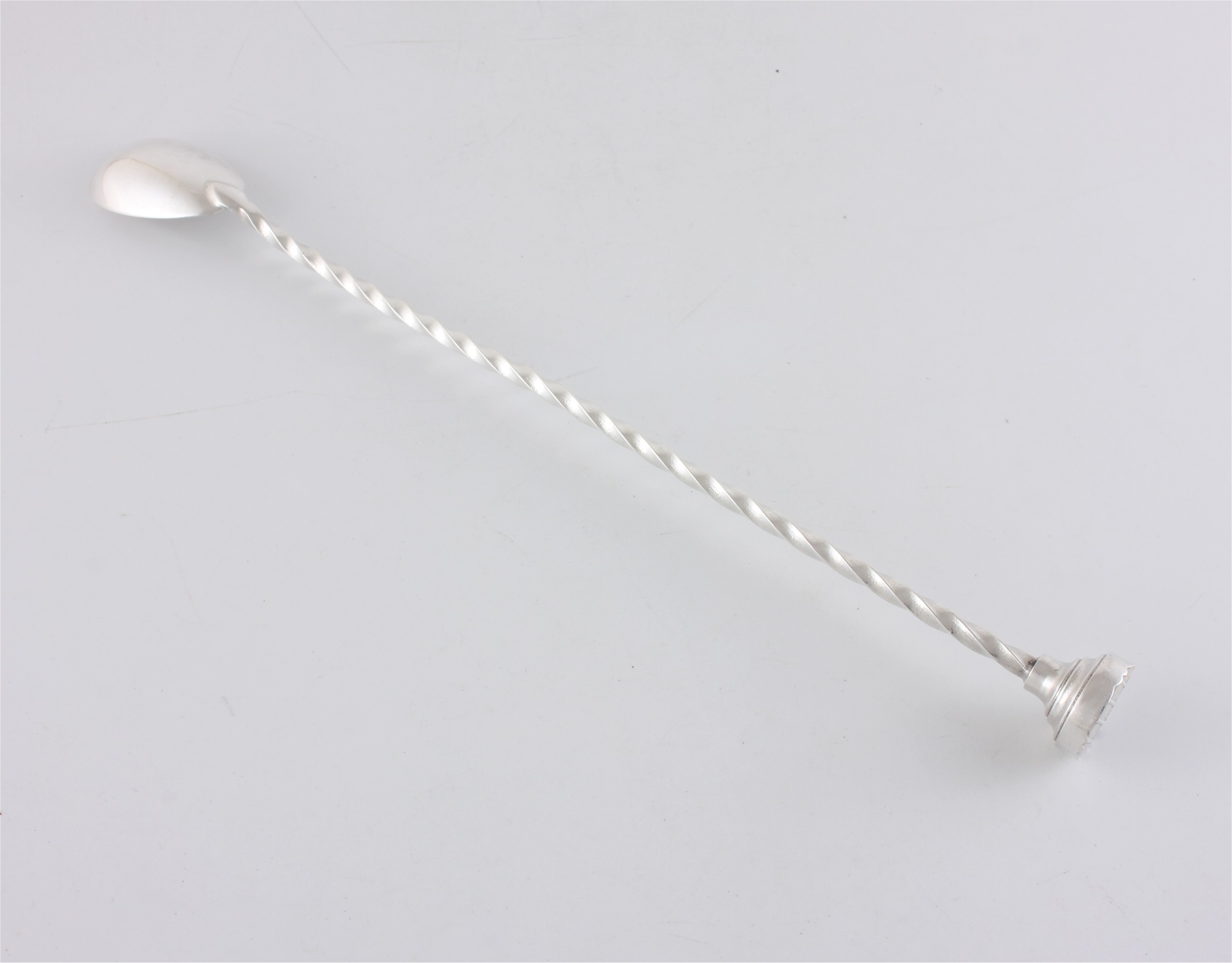 This stylish antique French silver plated long cocktail stirrer spoon which dates from the 1920's has a twisted design with a large spoon to one end and a round muddler which has a criss-cross pattern at the other end for crushing your cocktail ingredients.