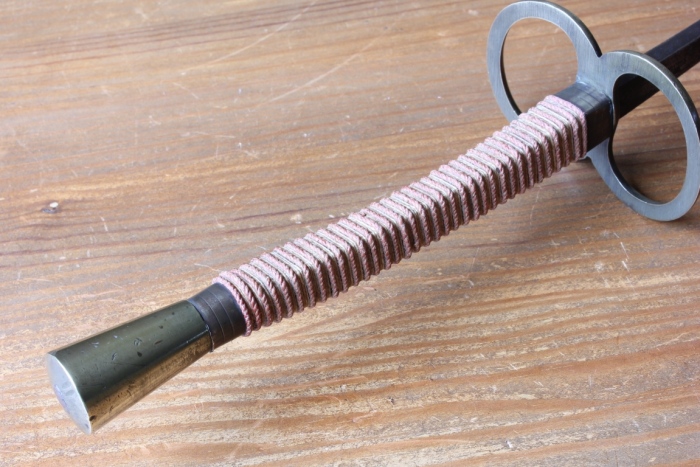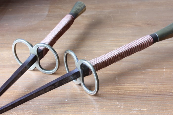 Antique Pair of French Fencing Foils by Louis Rochetir the blades are made of steel, with brass guards, bound grips on rectangular wooden handles and brass pommels.