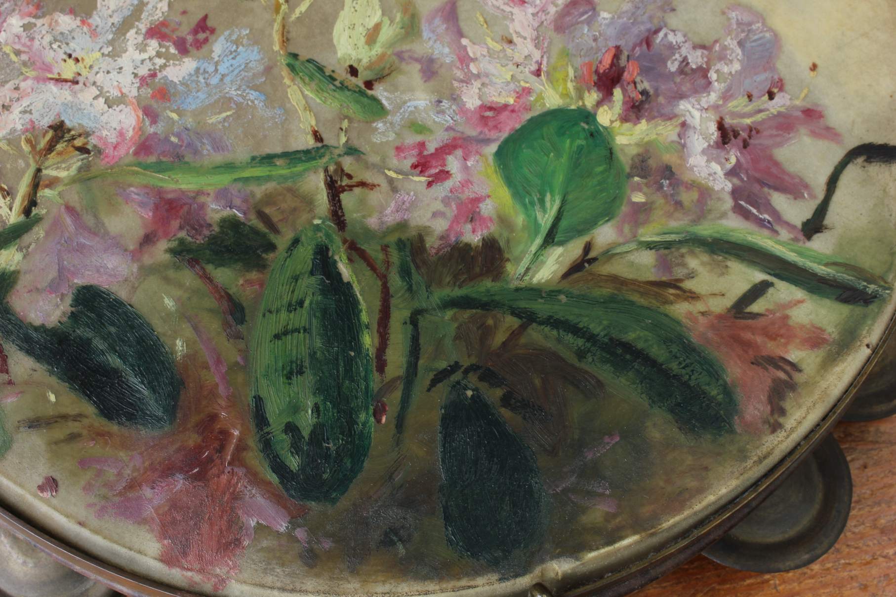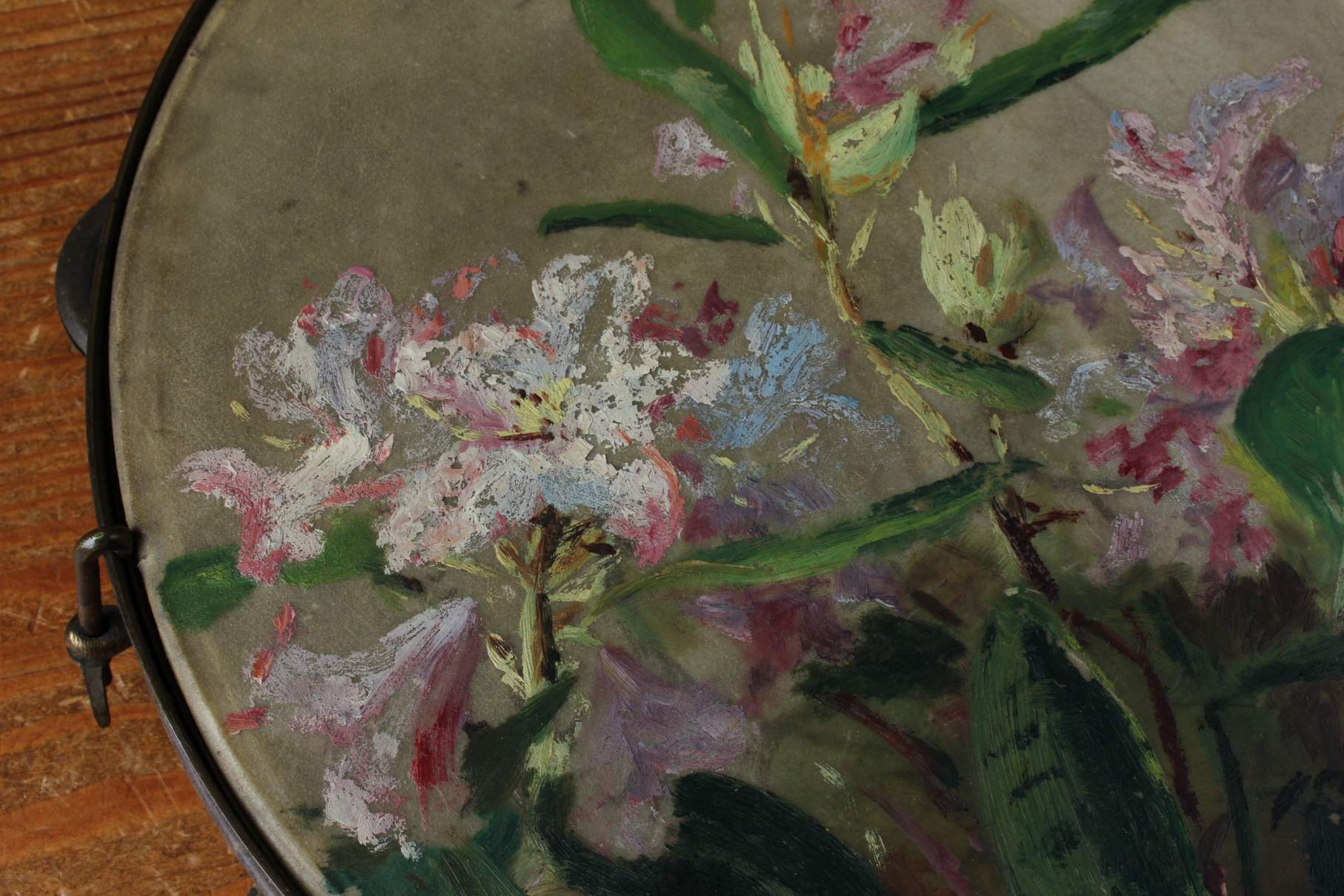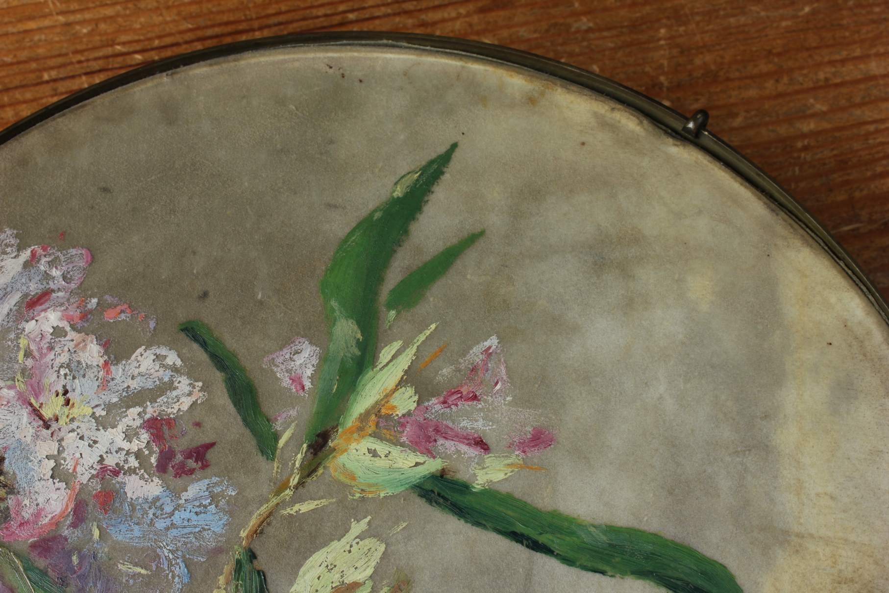 This charming French oil painting which was nicely painted by the artist using oil paints is on an antique wooden framed tambourine, has metal side tightener fitted and features a beautiful purple, yellow, blue, white and green flower display to the front.