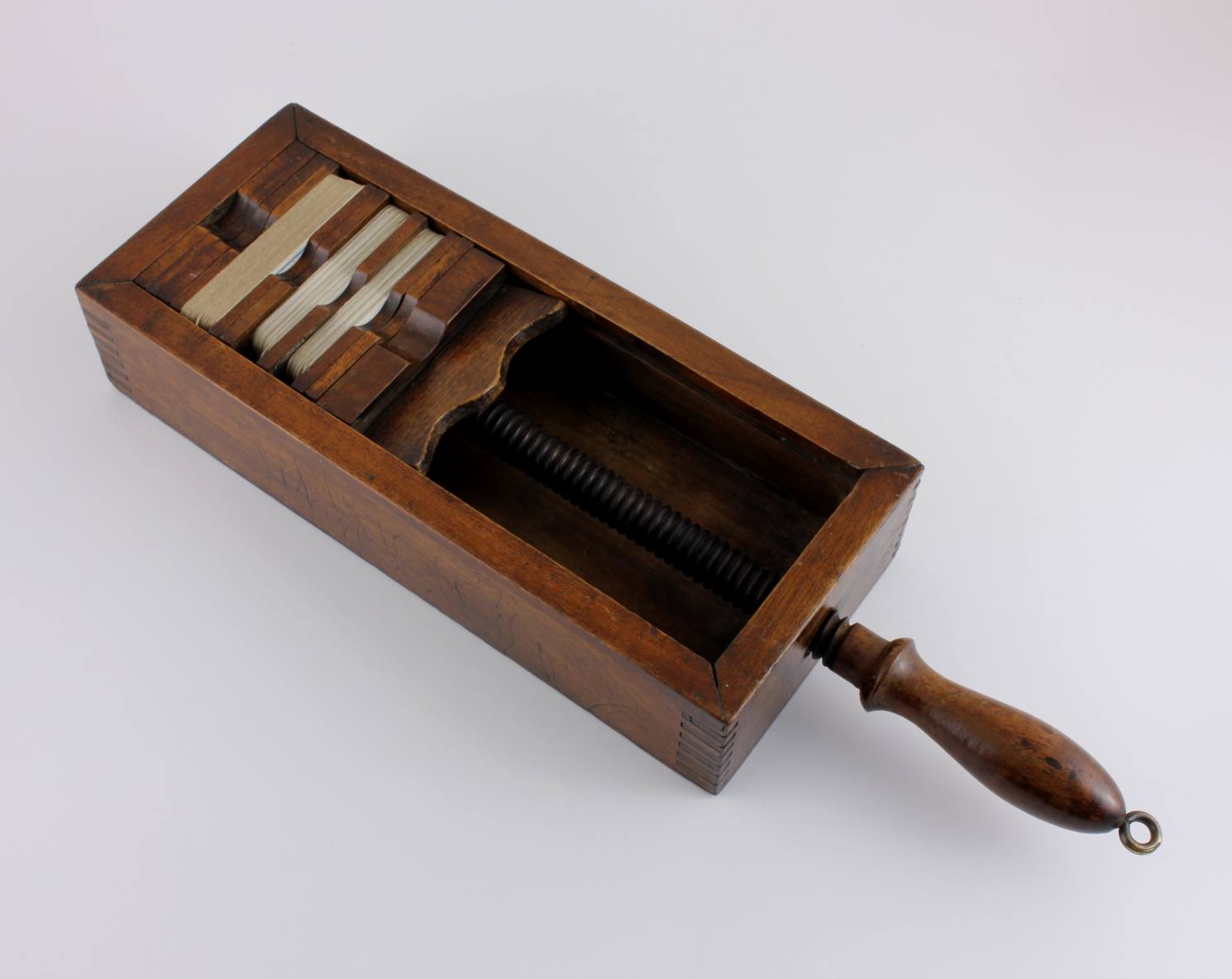This scarce antique playing card press which dates from the late 19th / early 20th century originates from France, is made of wood and has 10 compartments in which to store and press playing cards to keep them in perfect shape between use.