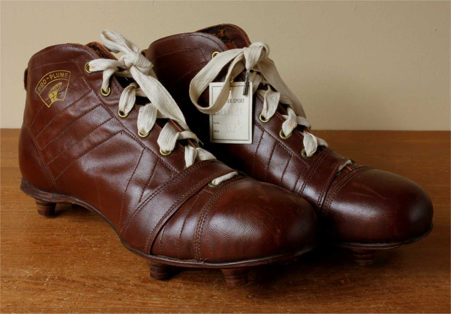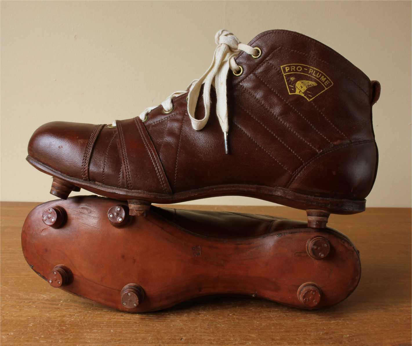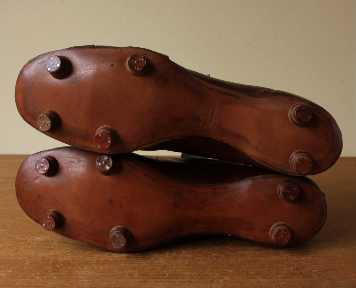 This fabulous pair of French Henry Ours football boots which date from c1950 are made of brown leather with leather soles and nailed on studs.