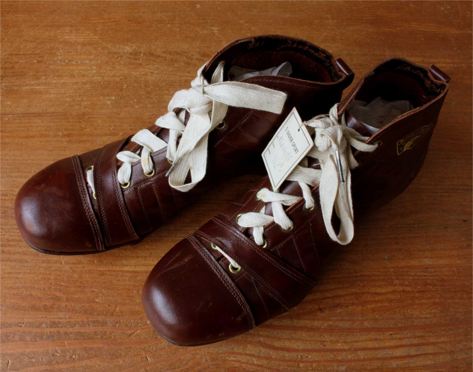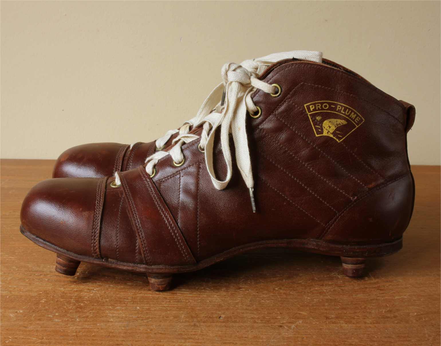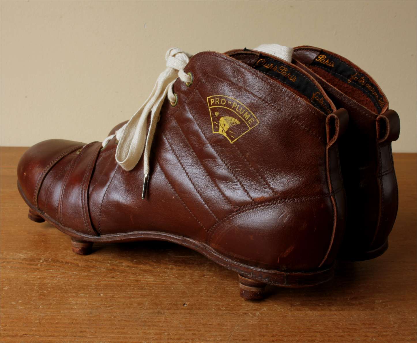 This fabulous pair of French Henry Ours football boots which date from c1950 are made of brown leather with leather soles and nailed on studs.