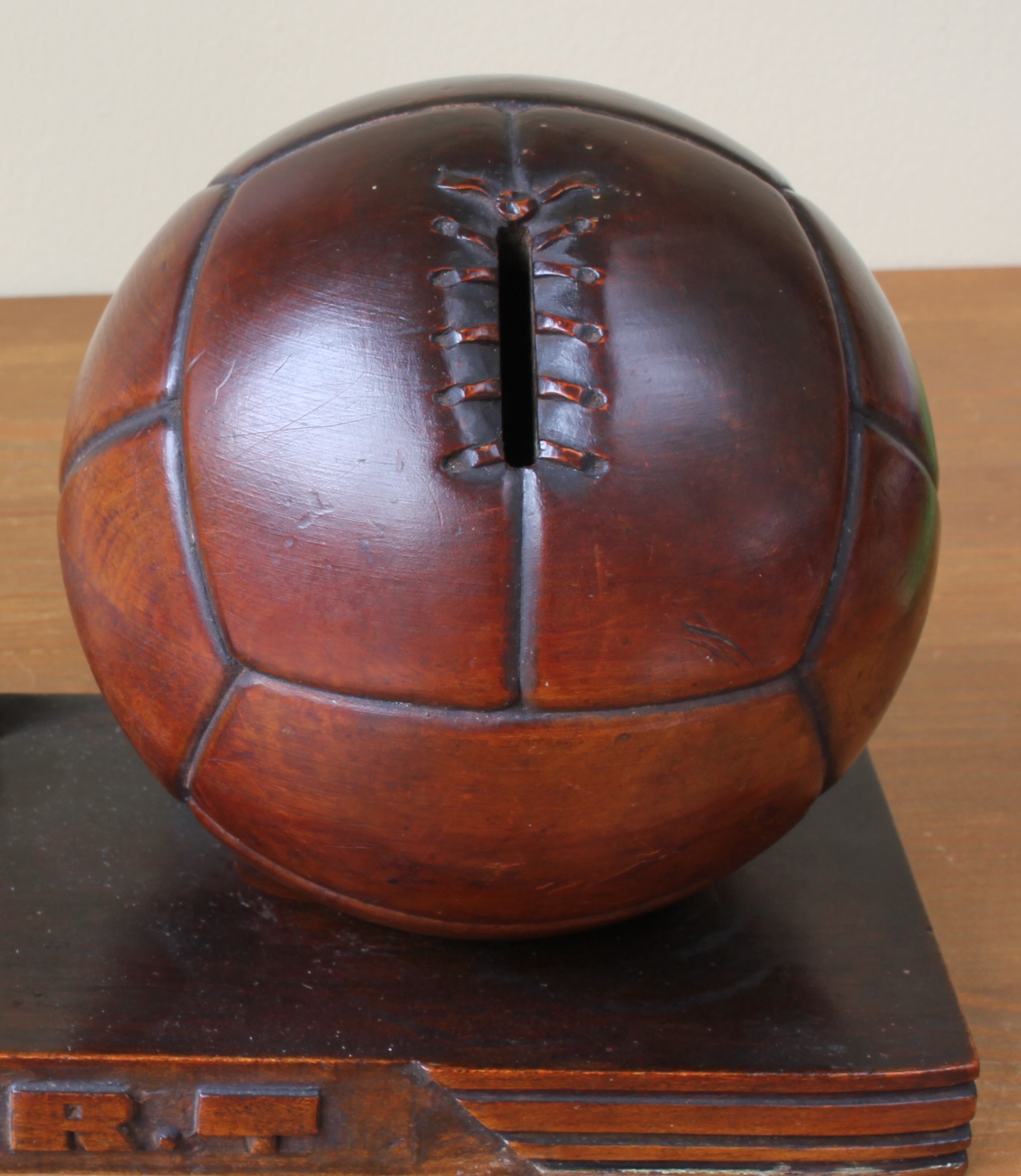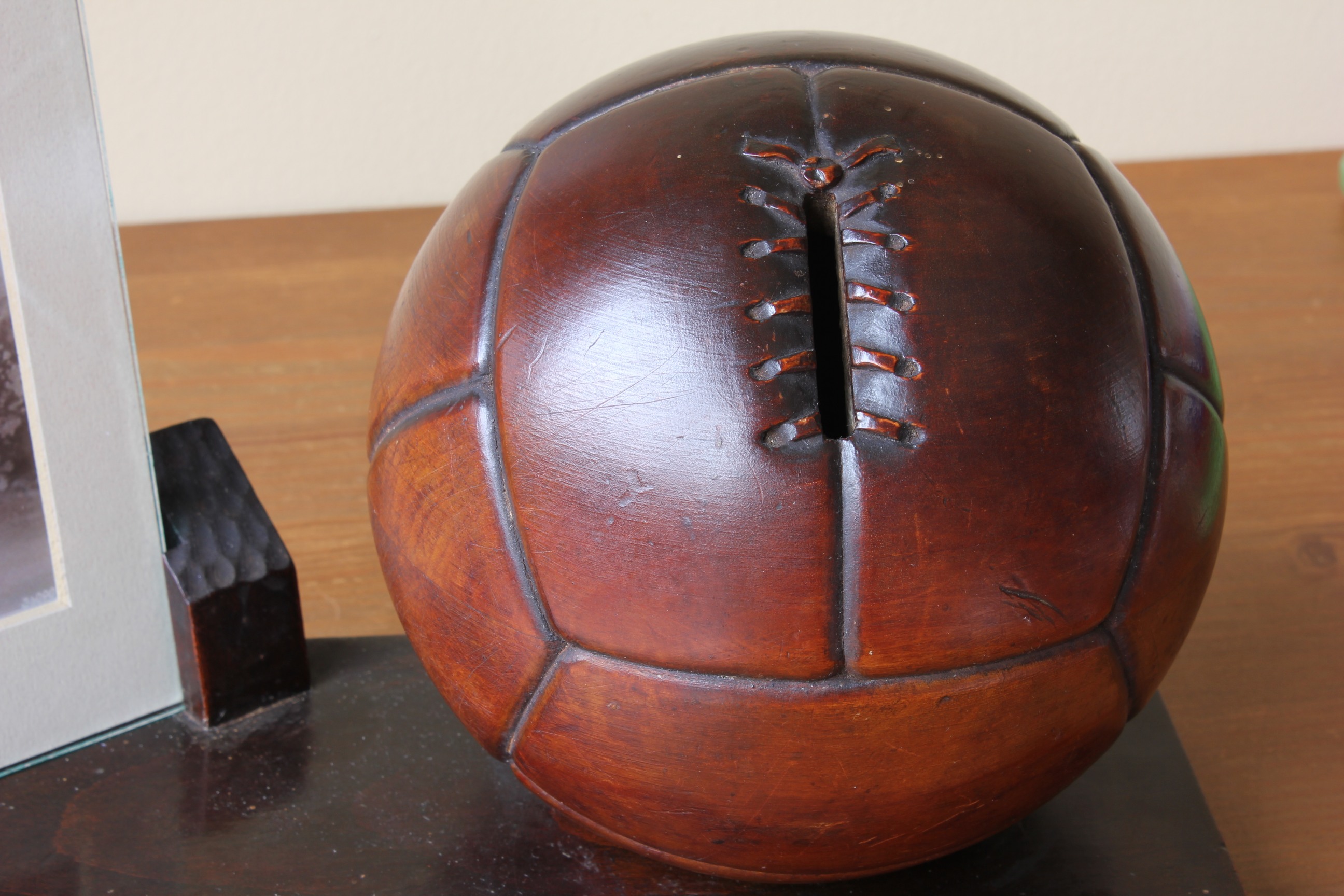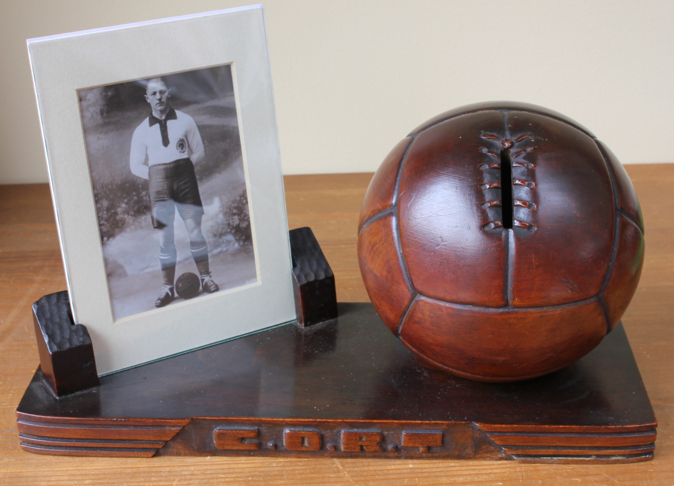 This unique hand carved wooden soccer ball is a piggy bank / money box and mounted on a wooden base which also features a picture frame. The front of the base is hand carved with "C.O.R.T". There are 2 screws which attach the base to the ball and these can be removed to take out the saved cash.