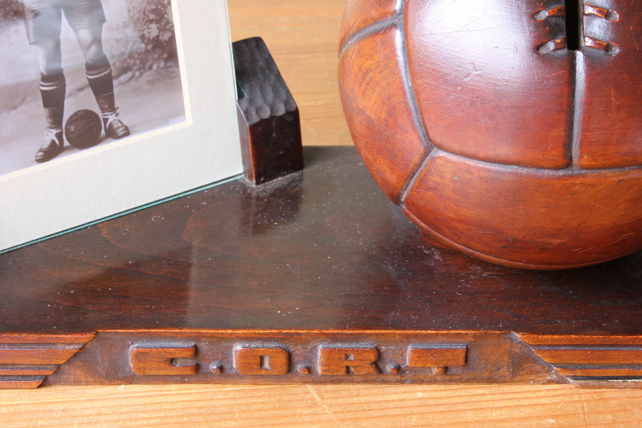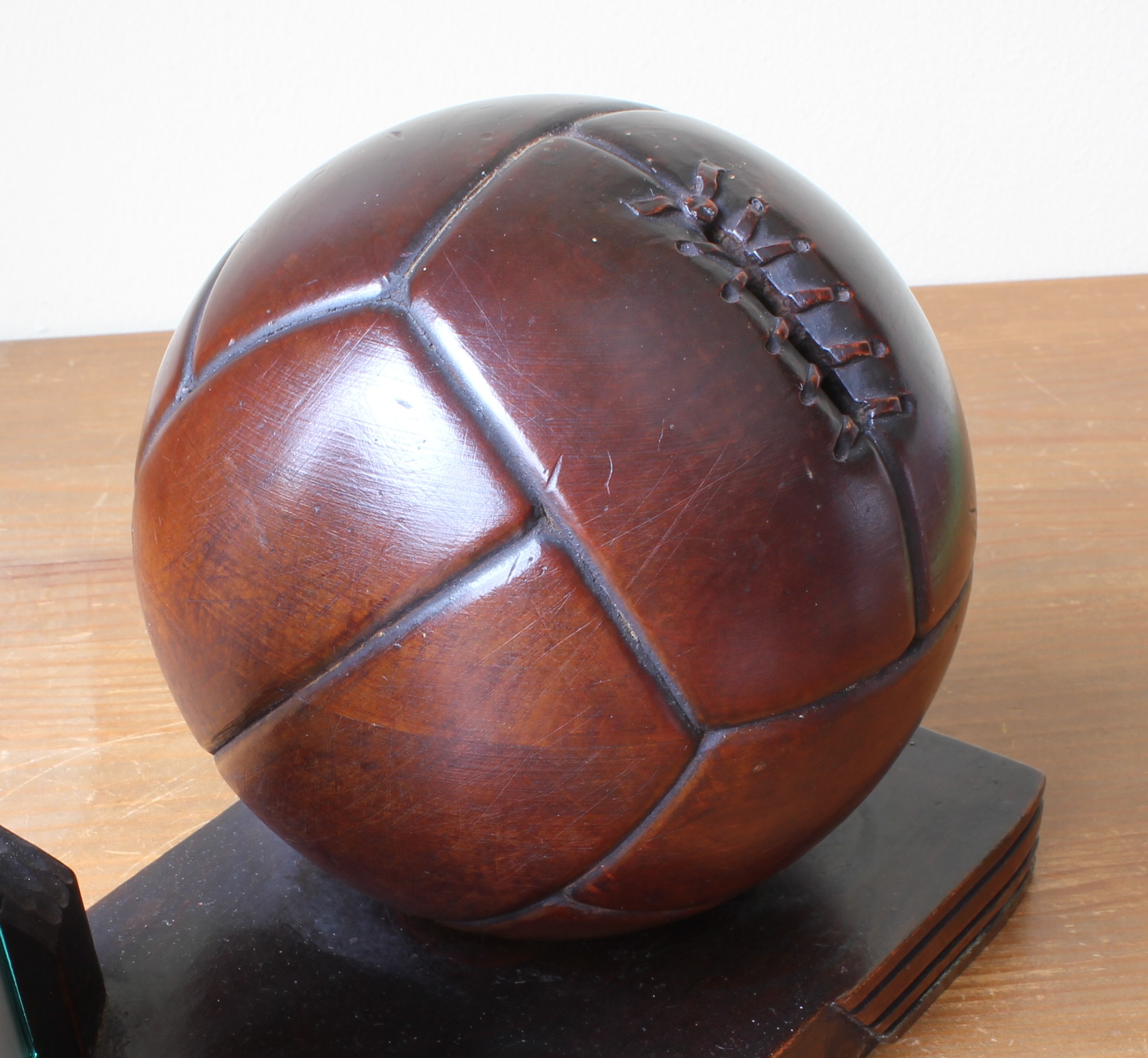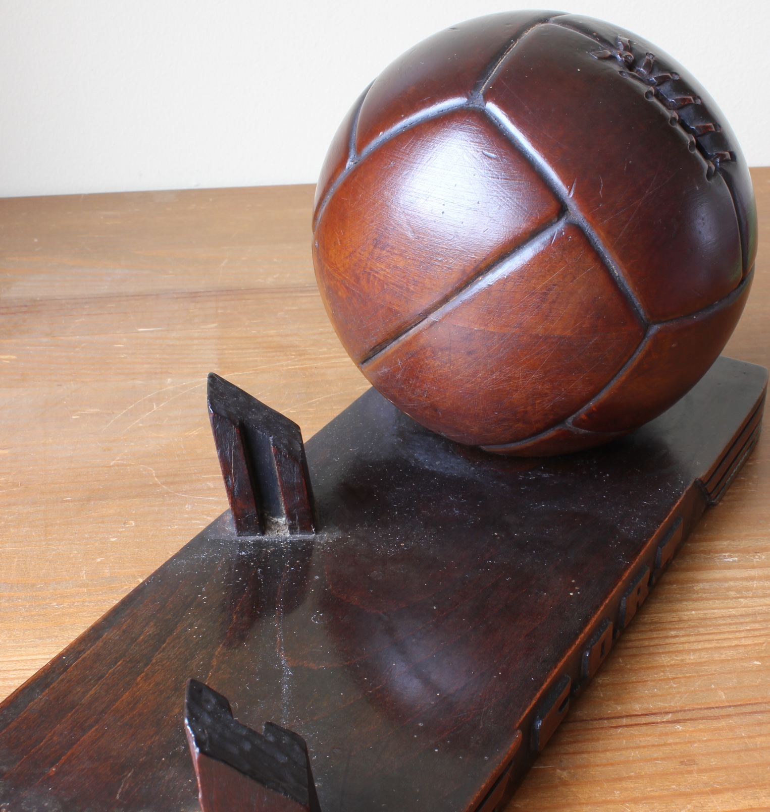 Dating from the 1930's the ball is excellently carved and has a wonderful patina. This unusual item of football memorabilia would look fantastic displayed on a desk, shelf or part of a display.