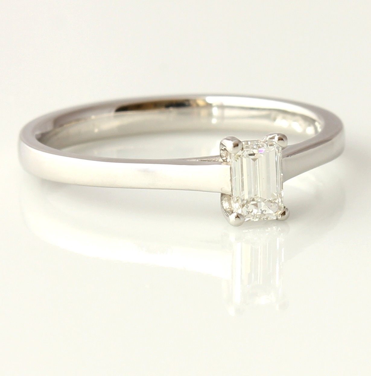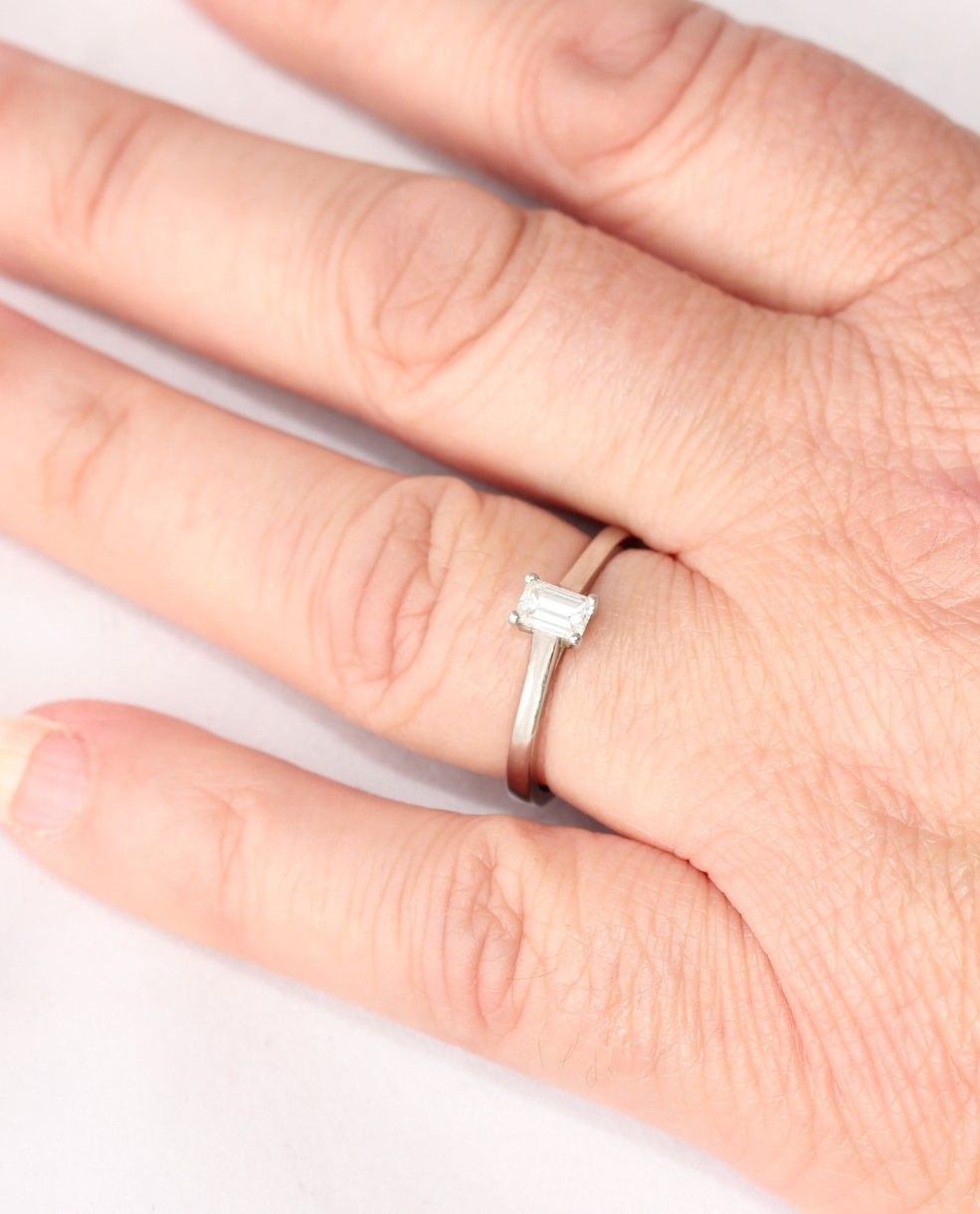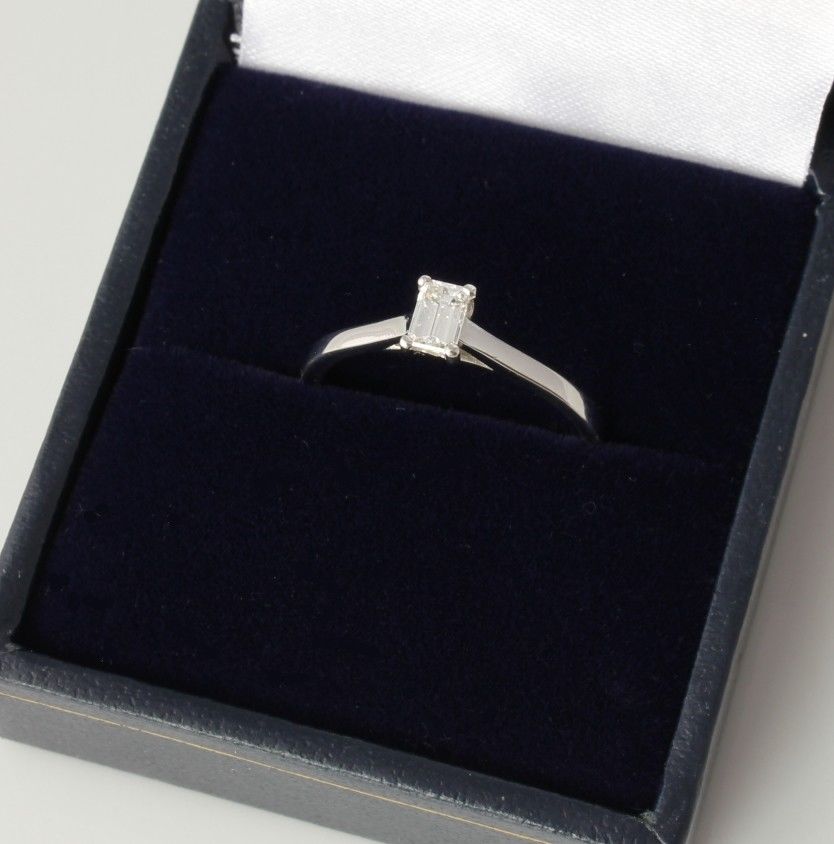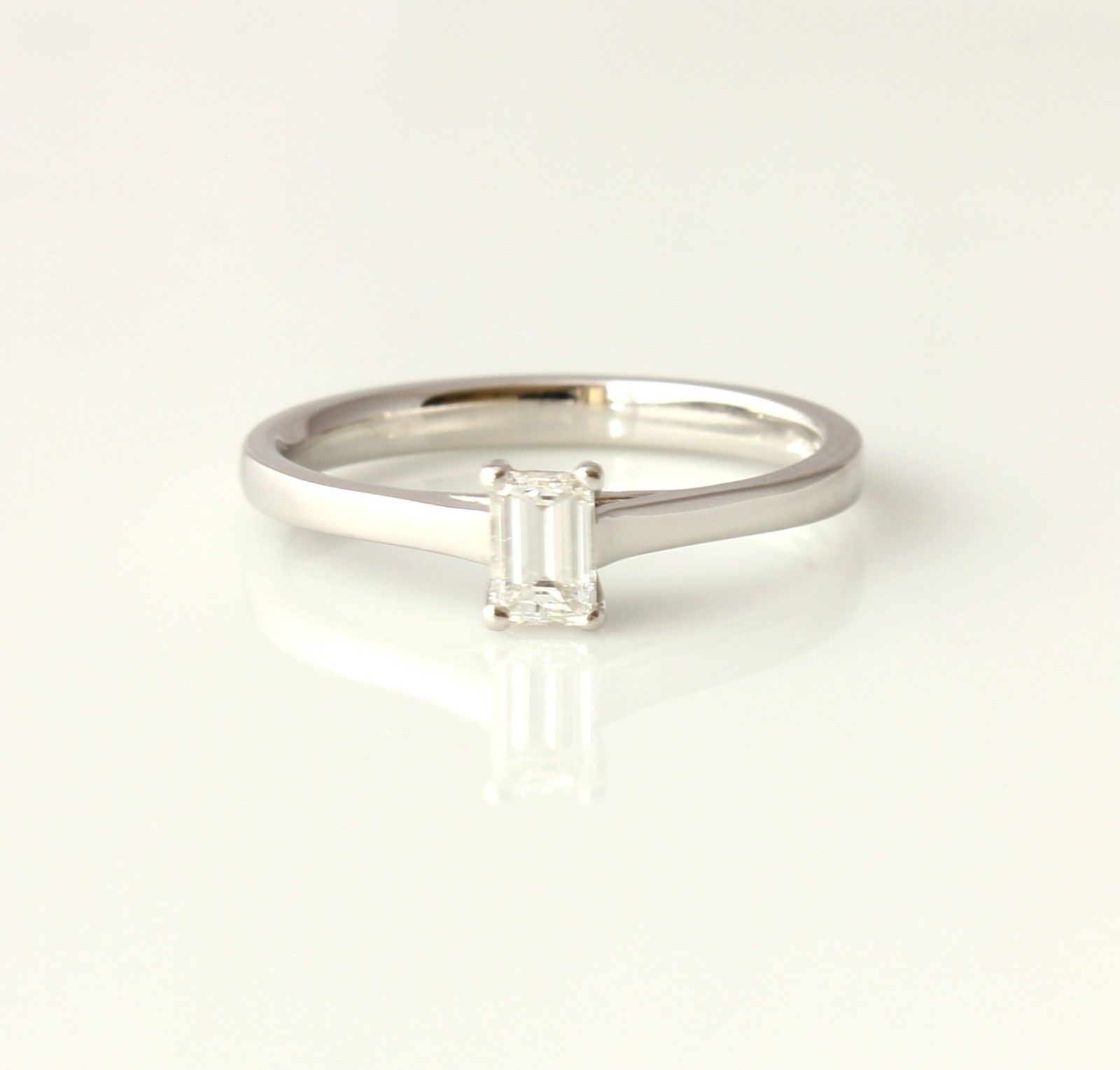 This stunning ring is wonderfully crafted in Platinum, has tapered shoulders and is set with a rectangle natural VS diamond of 0.30 cts. The diamond which is fully certified is clear, sparkly, bright and would make a really wonderful Engagement ring.
