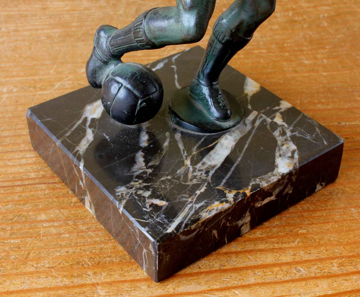This Art Deco style French football statue which is made of cast metal sits on a square marble base and dates from the mid 20th century.