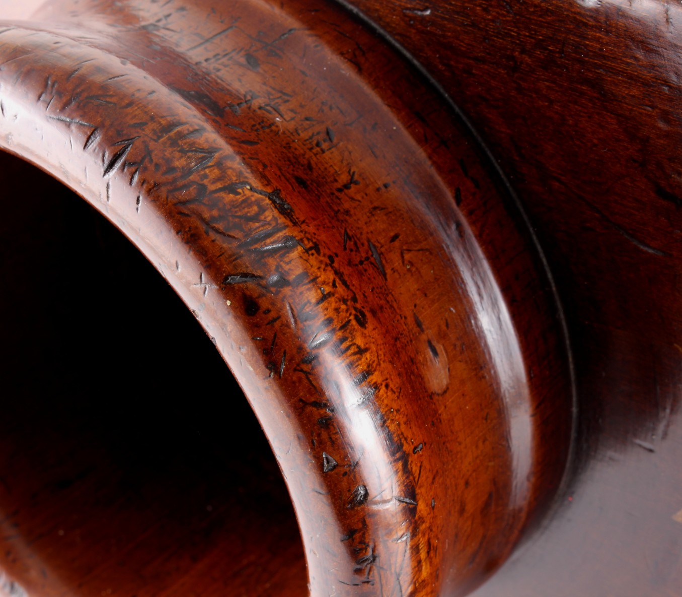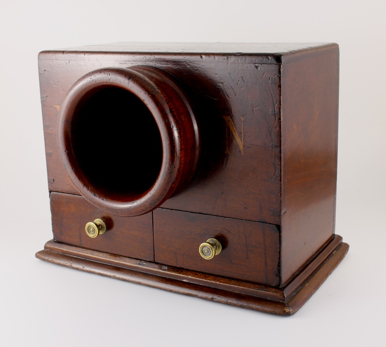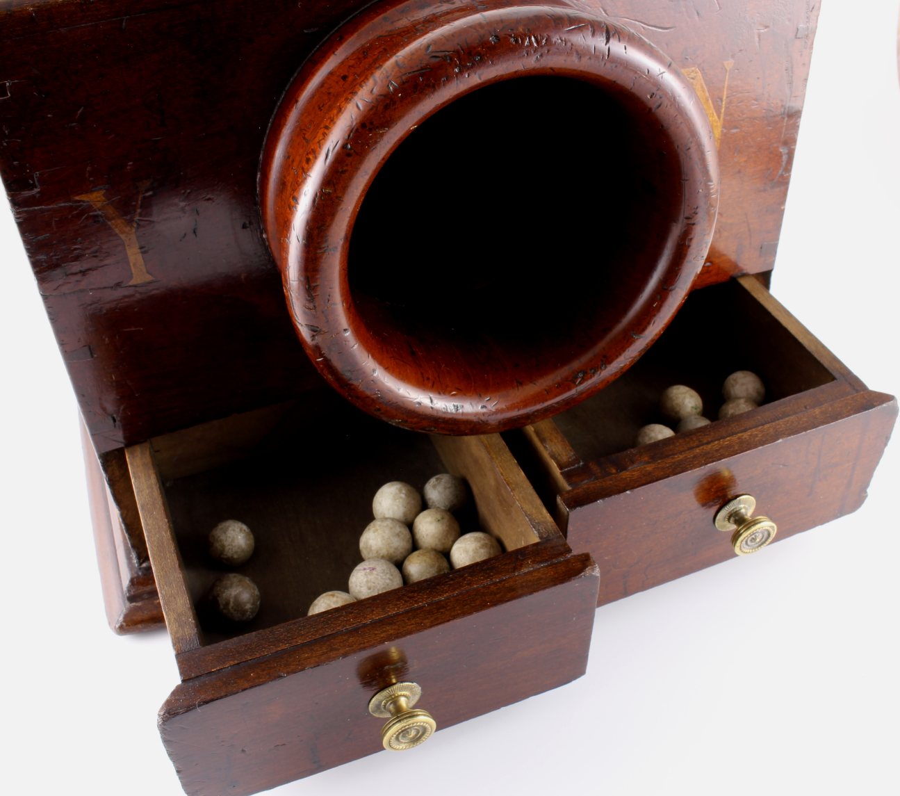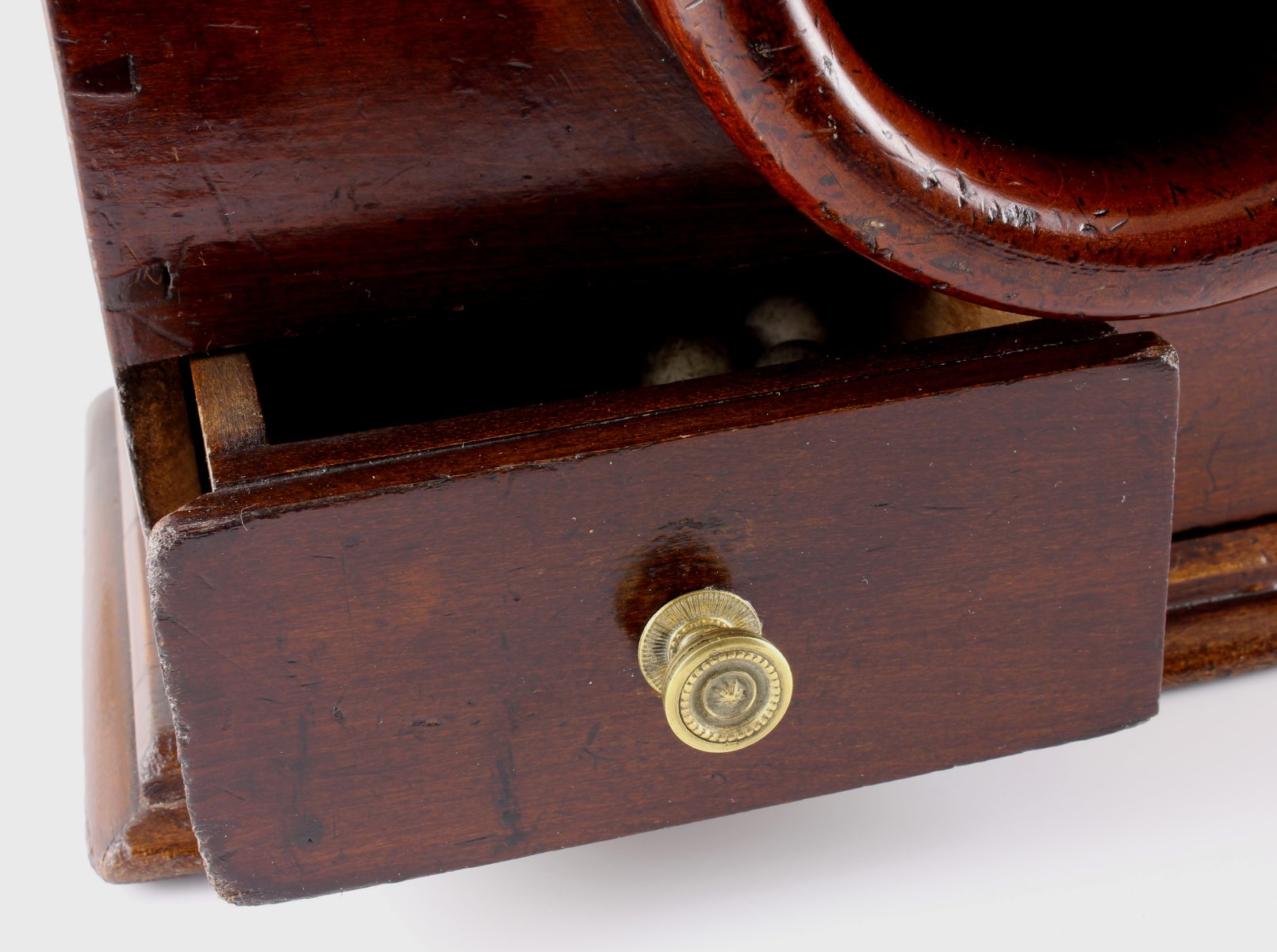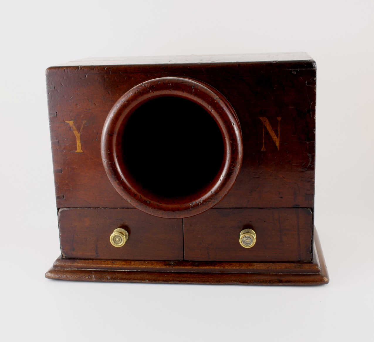 The handsome Georgian box has a circular funnel in which voters would place their hand and discreetly drop a clay ball into either the left or right side to cast their vote. The two drawers are fitted with decorated brass knobs and are beautifully made with dovetail joints.