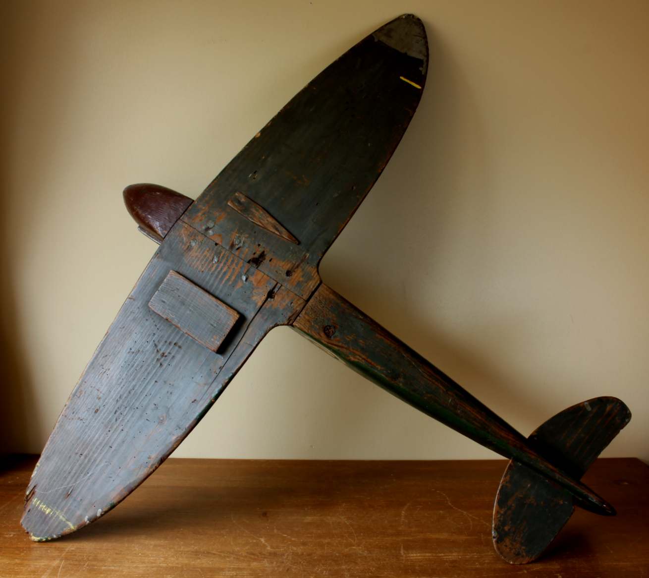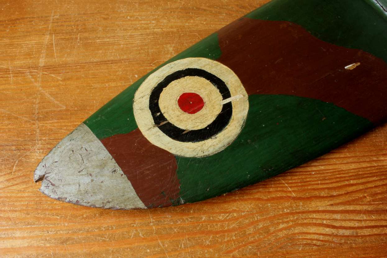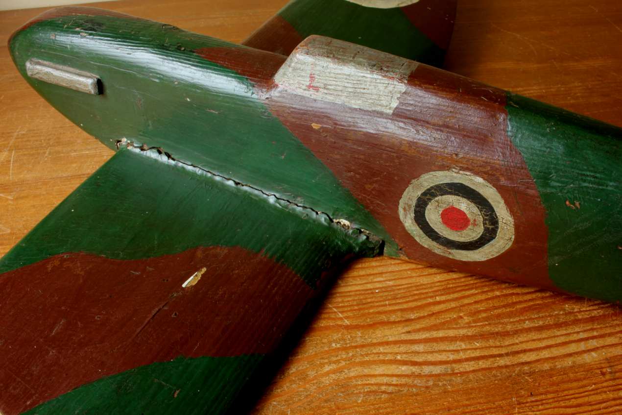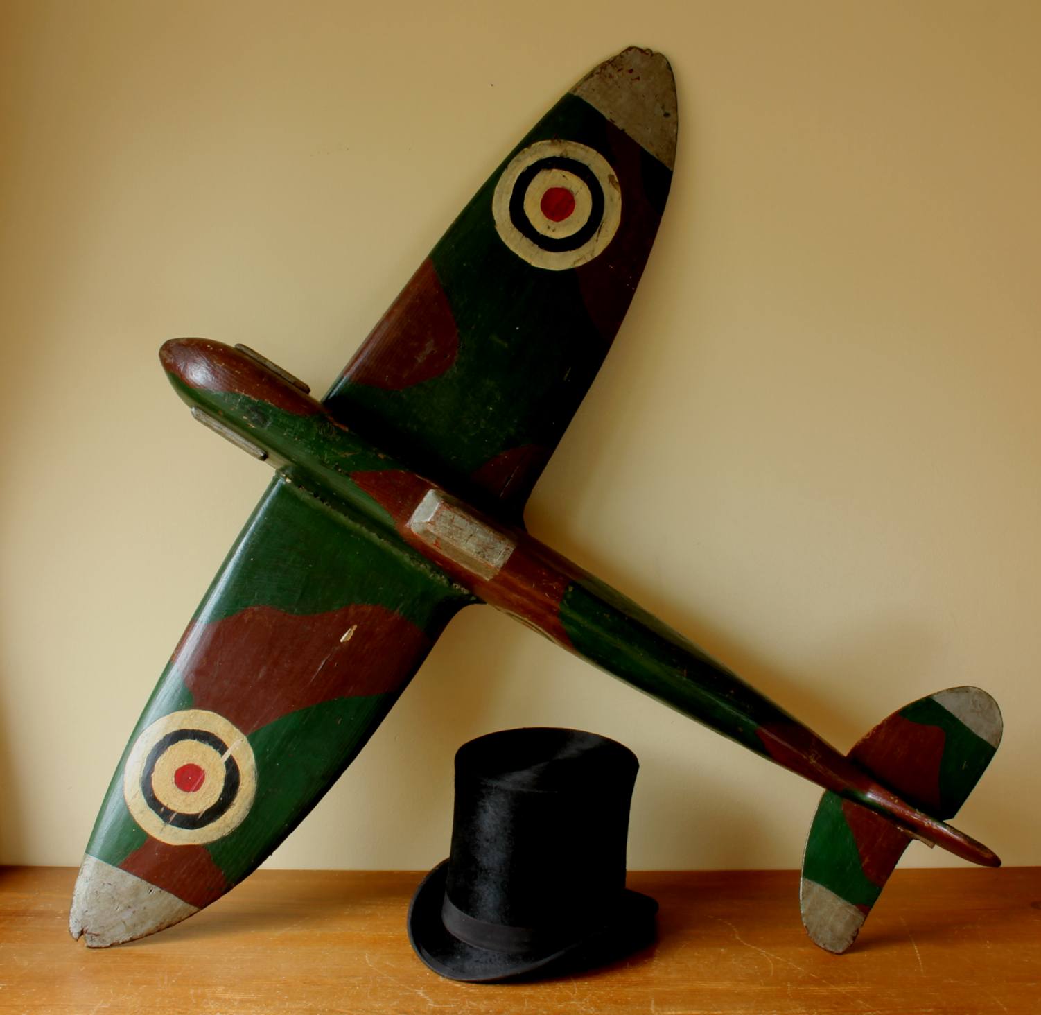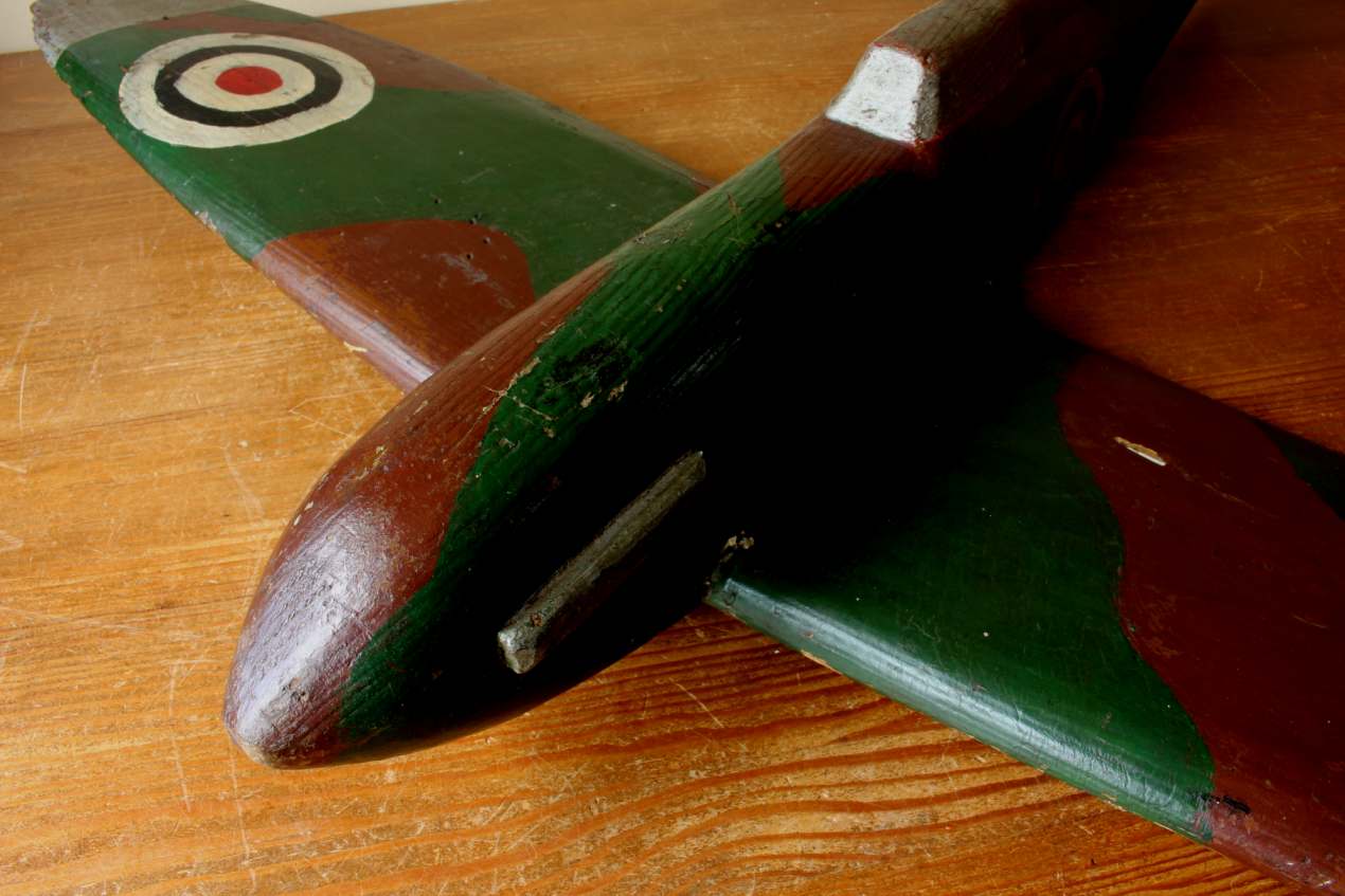 This large and impressive vintage model of a Spitfire which would have been lovingly made by hand around the middle of the 20th century is made of wood and painted in green & brown paint. Details include red, blue & white Royal Airforce roundels to the wings & sides and the whole piece has a wonderful look.