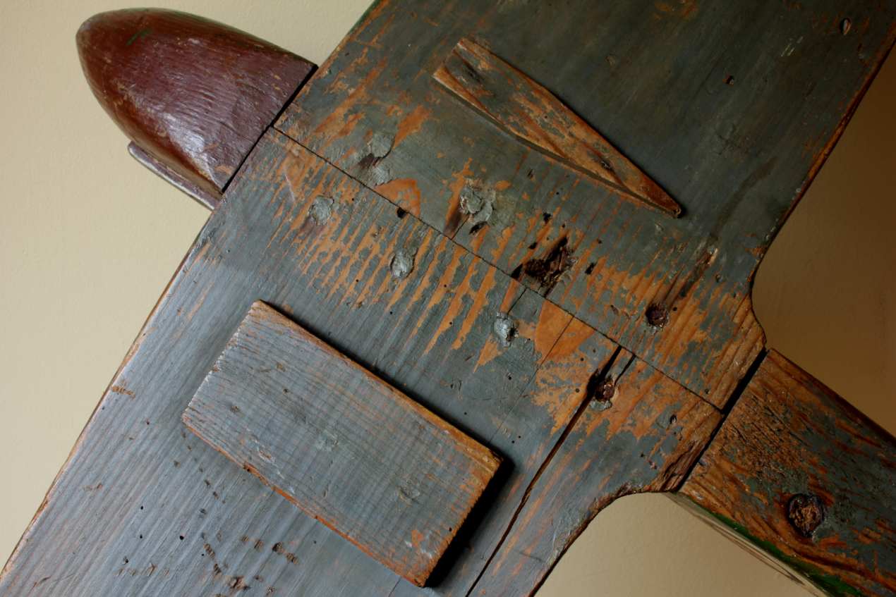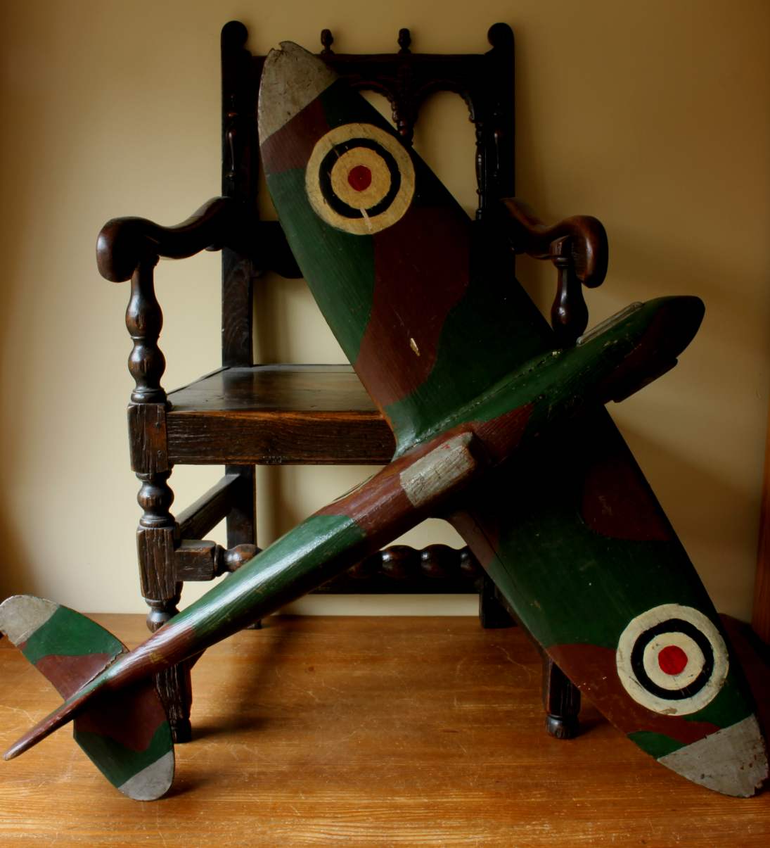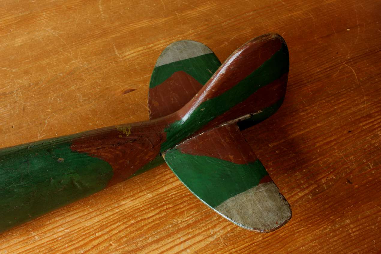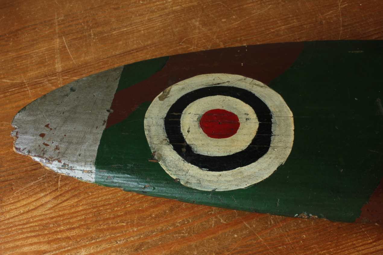 This large and impressive vintage model of a Spitfire which would have been lovingly made by hand around the middle of the 20th century is made of wood and painted in green & brown paint. Details include red, blue & white Royal Airforce roundels to the wings & sides and the whole piece has a wonderful look.