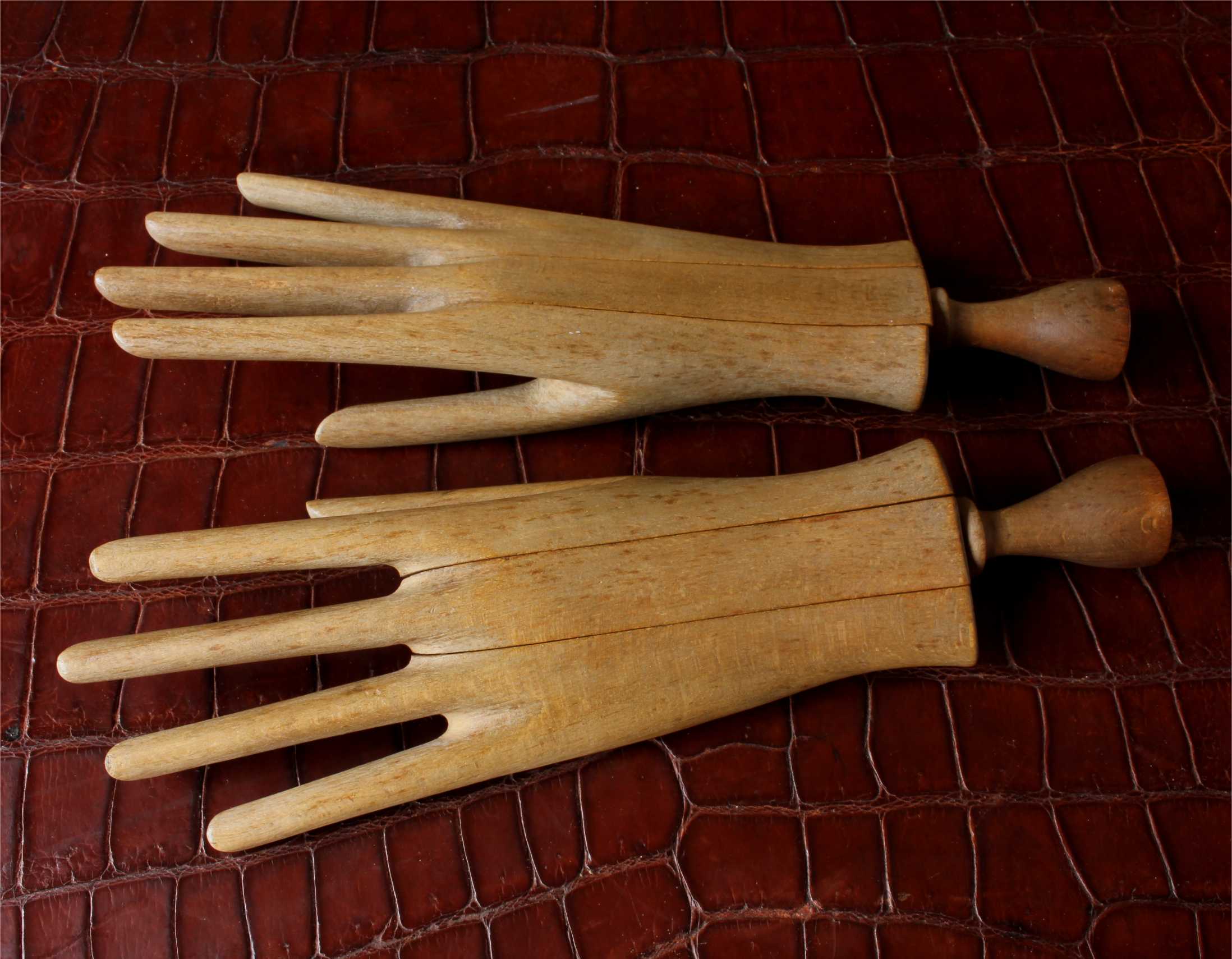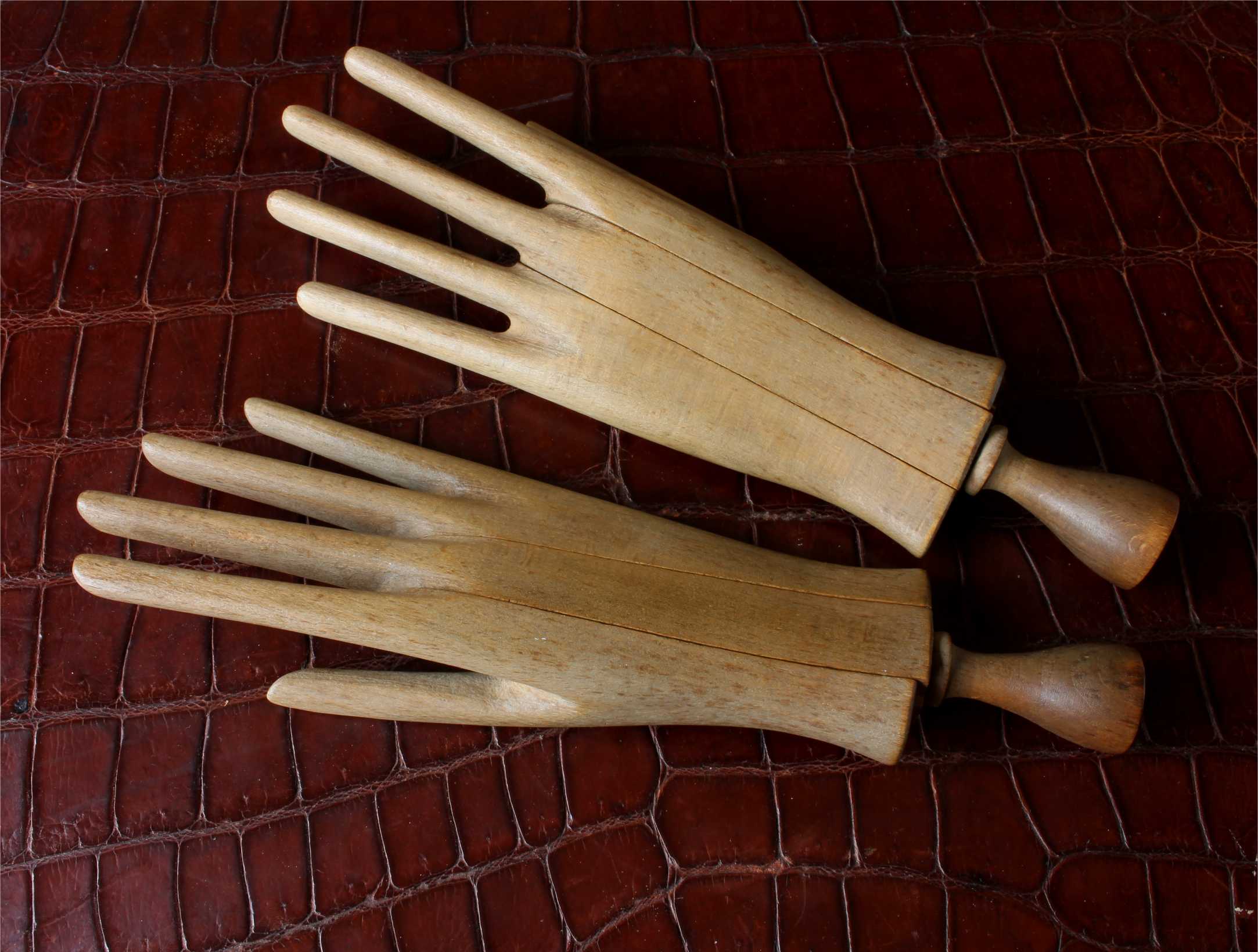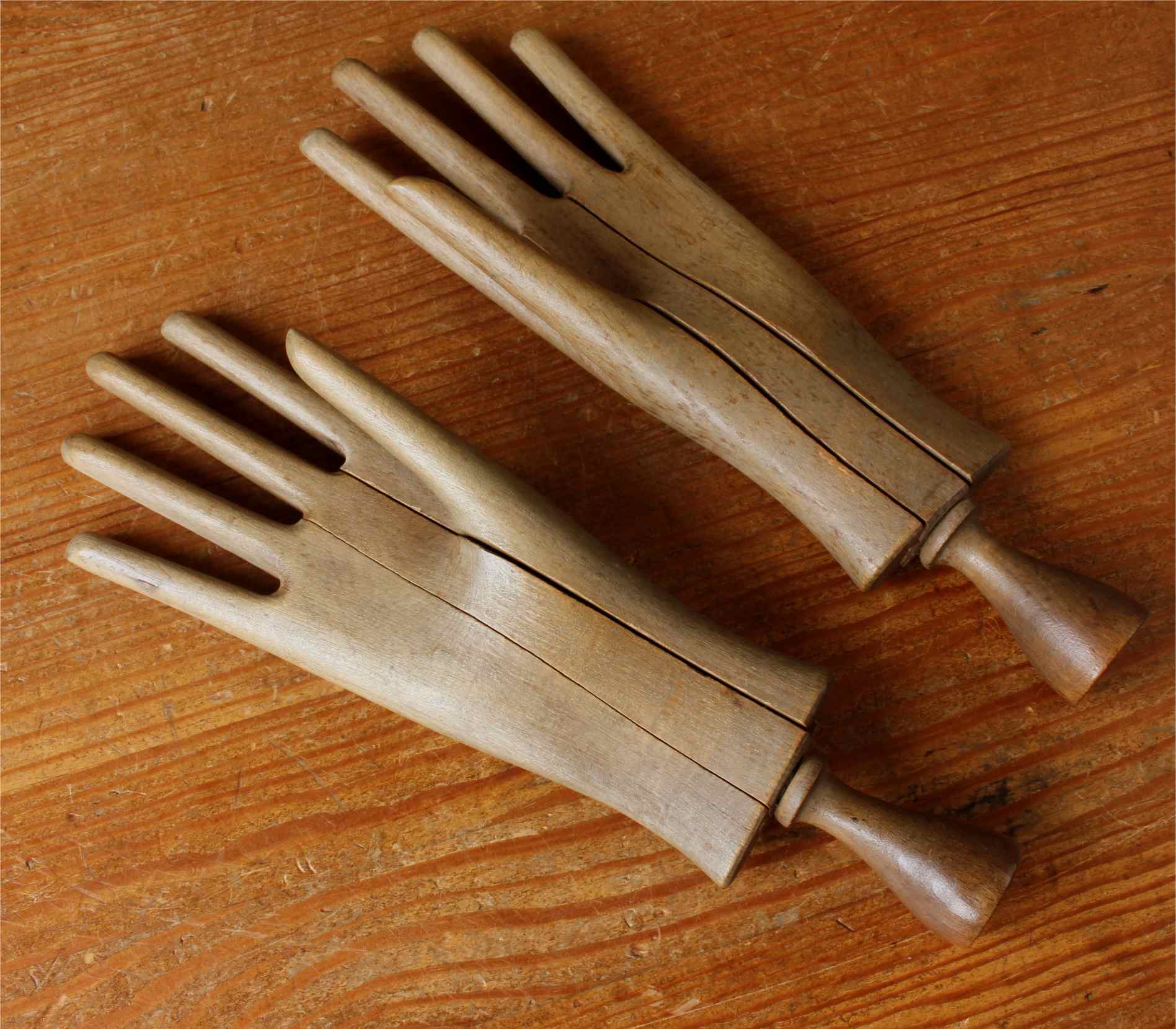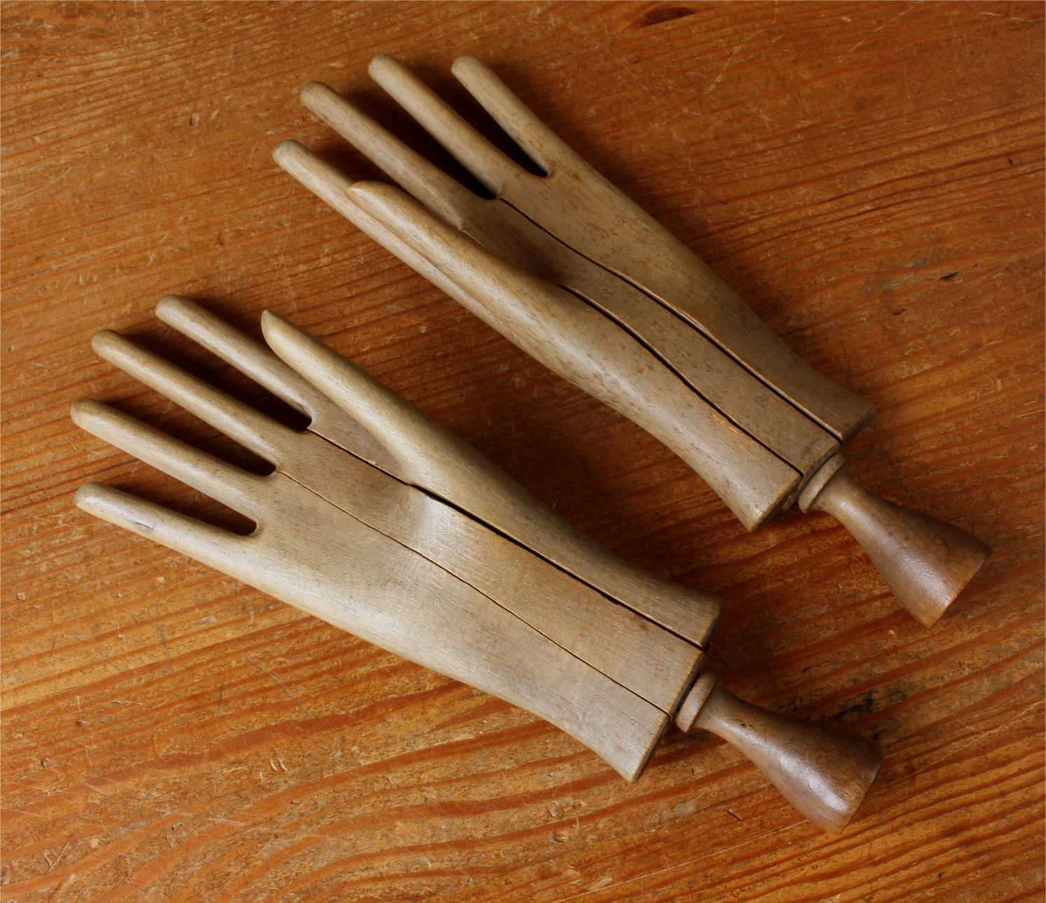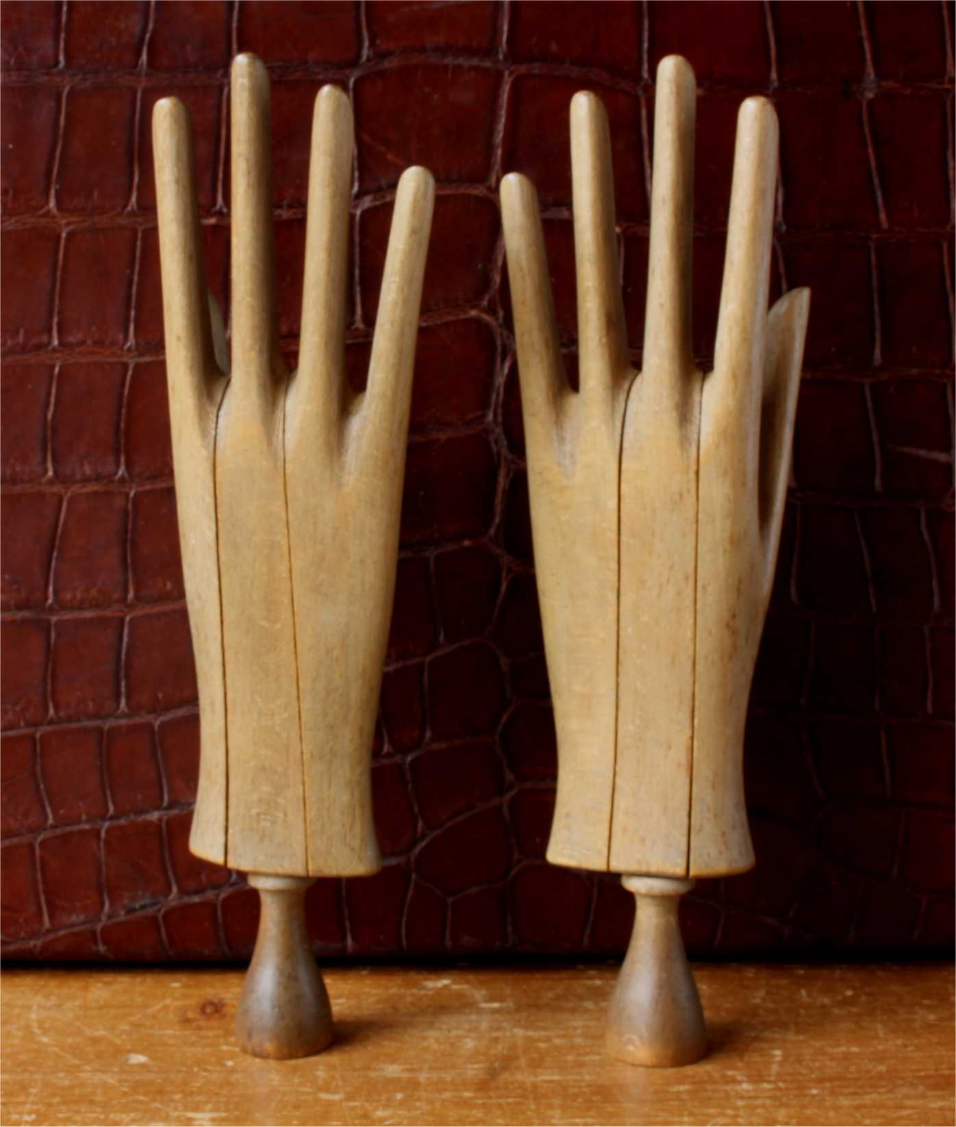 This handsome pair of antique wooden glove lasts which come in the form of two mannequin hands are in three parts which slide together and date from c1900.