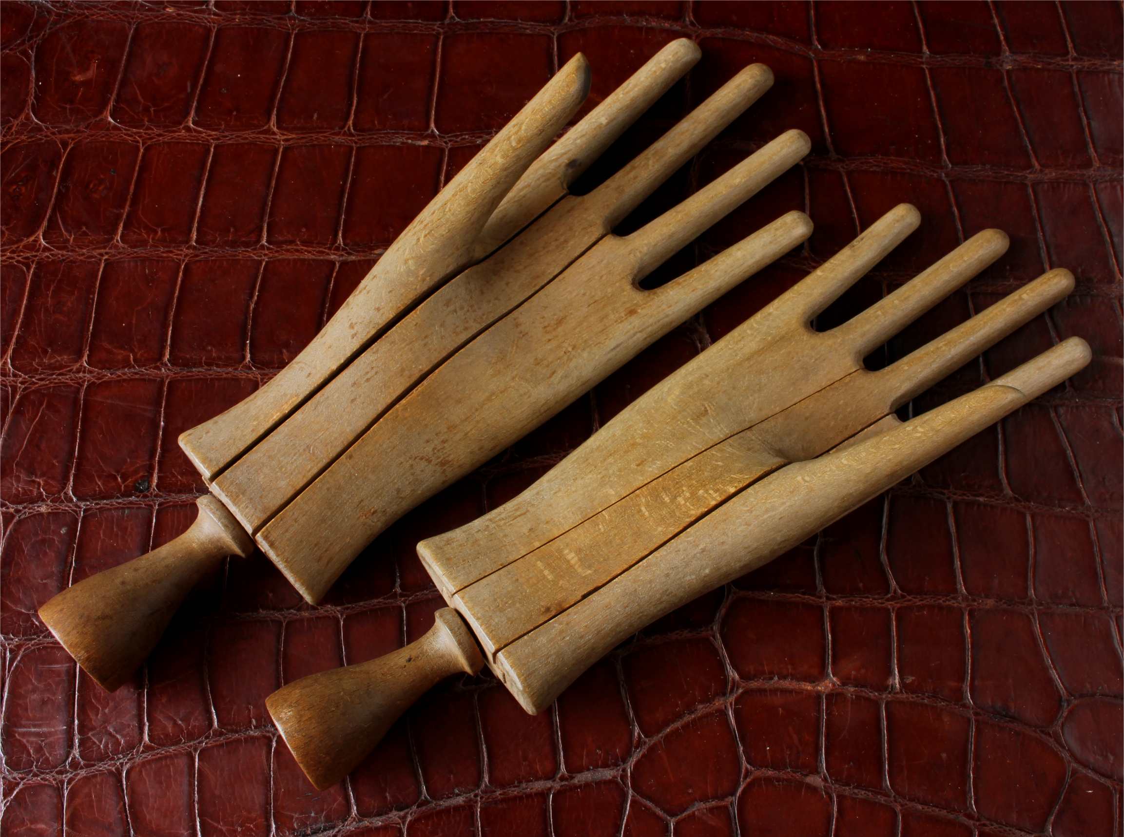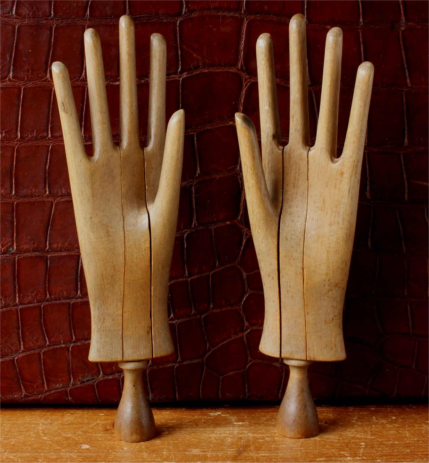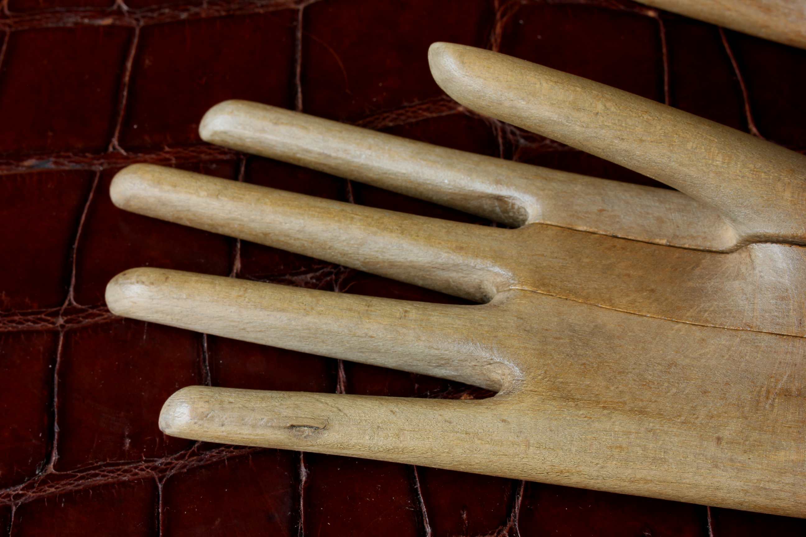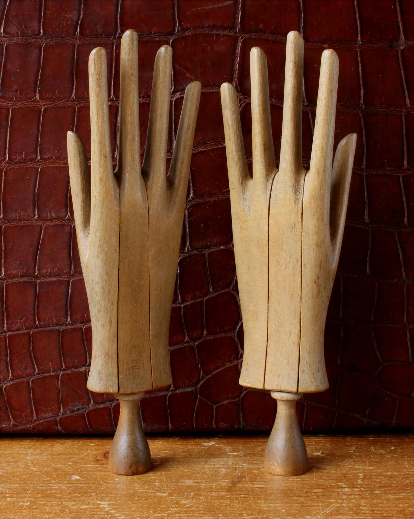 This handsome pair of antique wooden glove lasts which come in the form of two mannequin hands are in three parts which slide together and date from c1900.