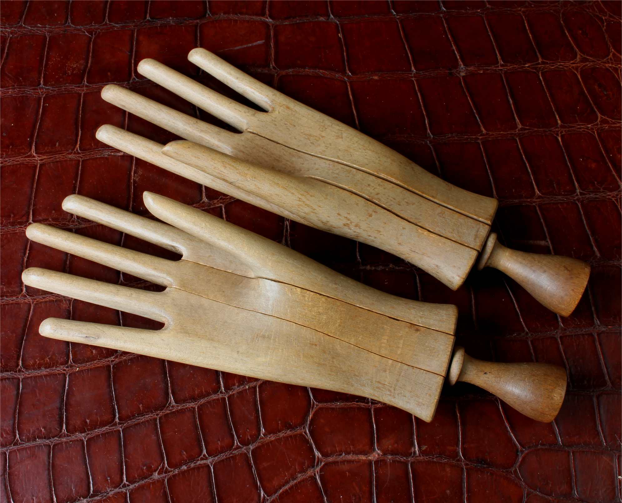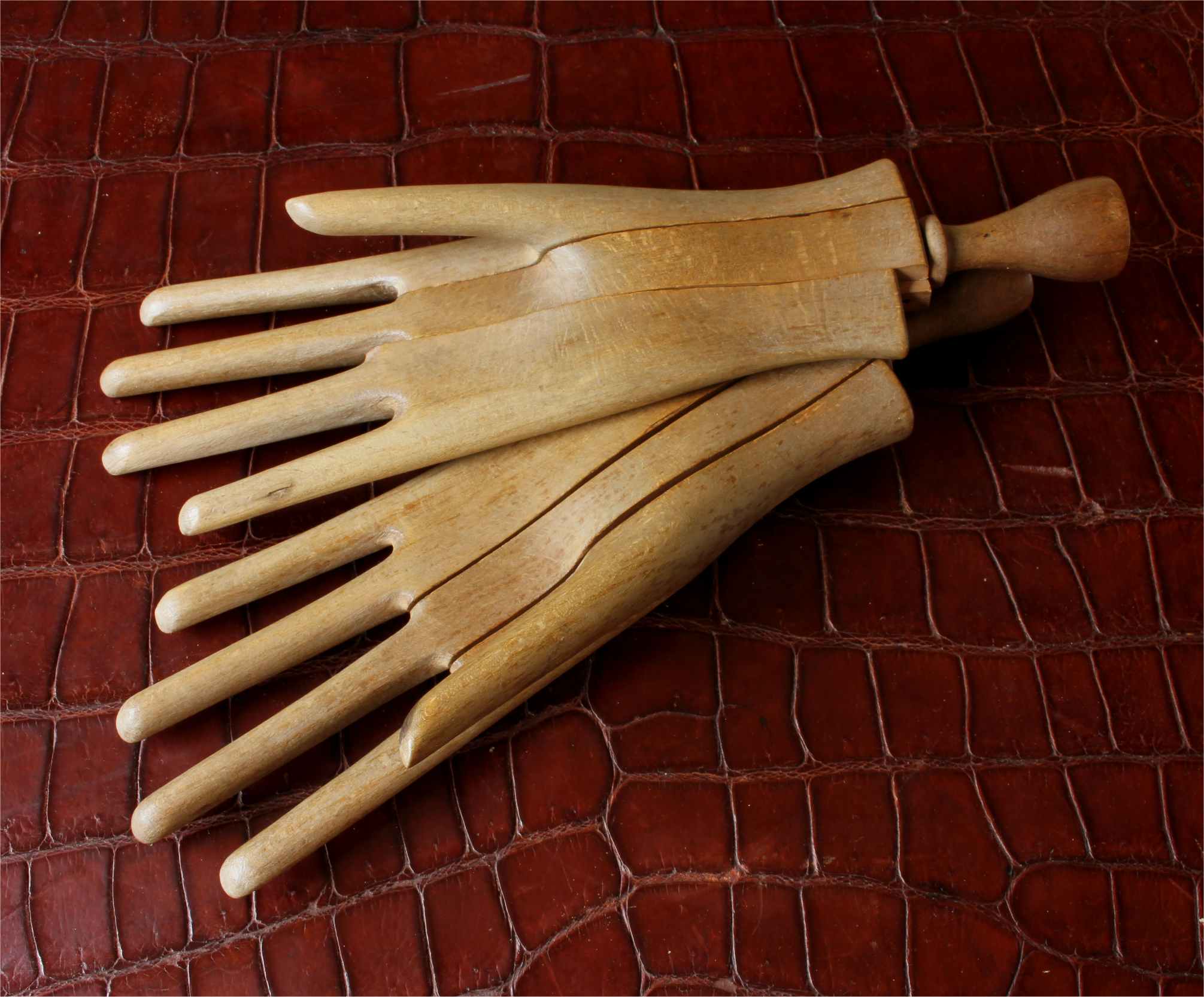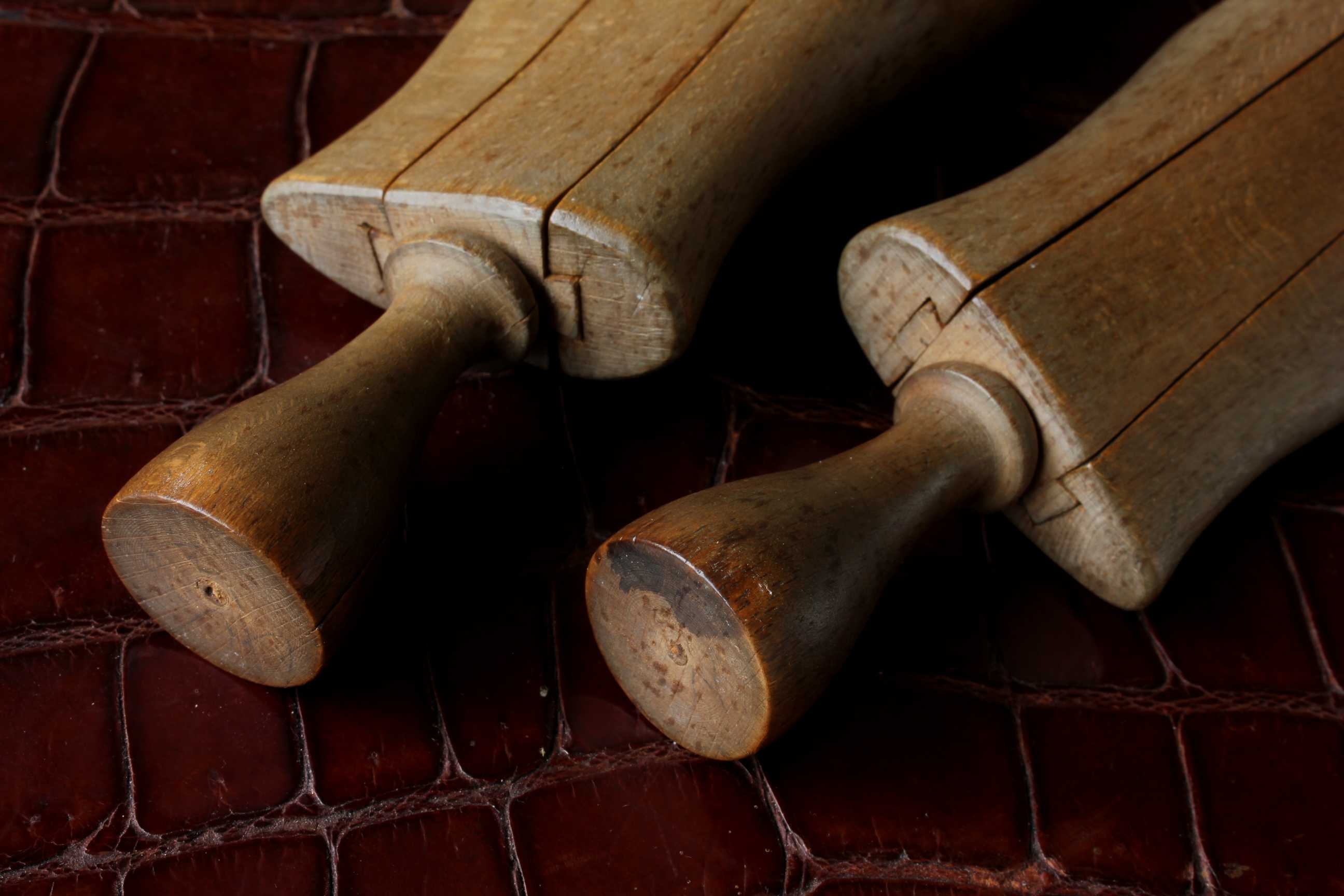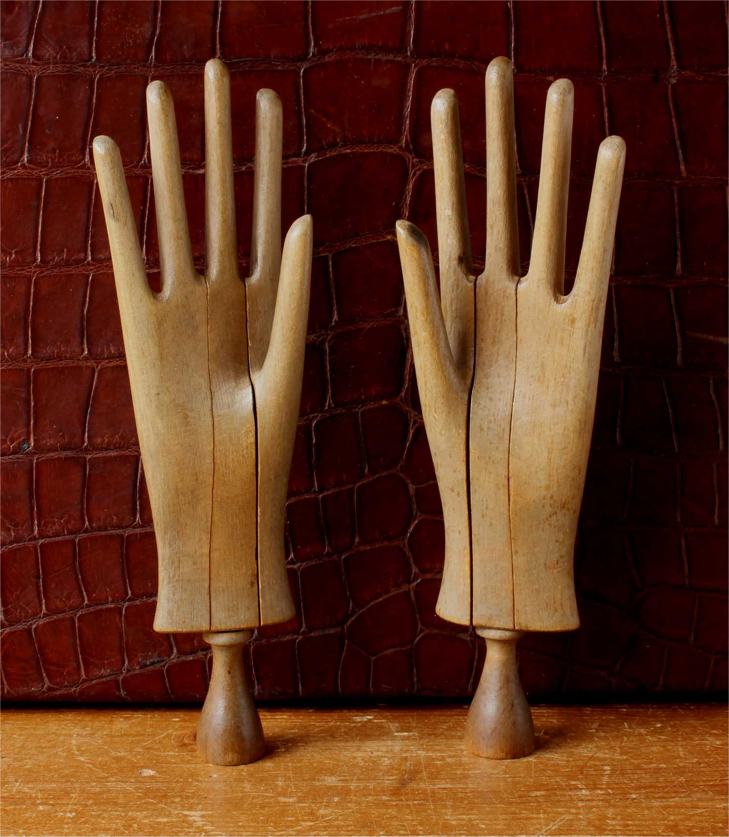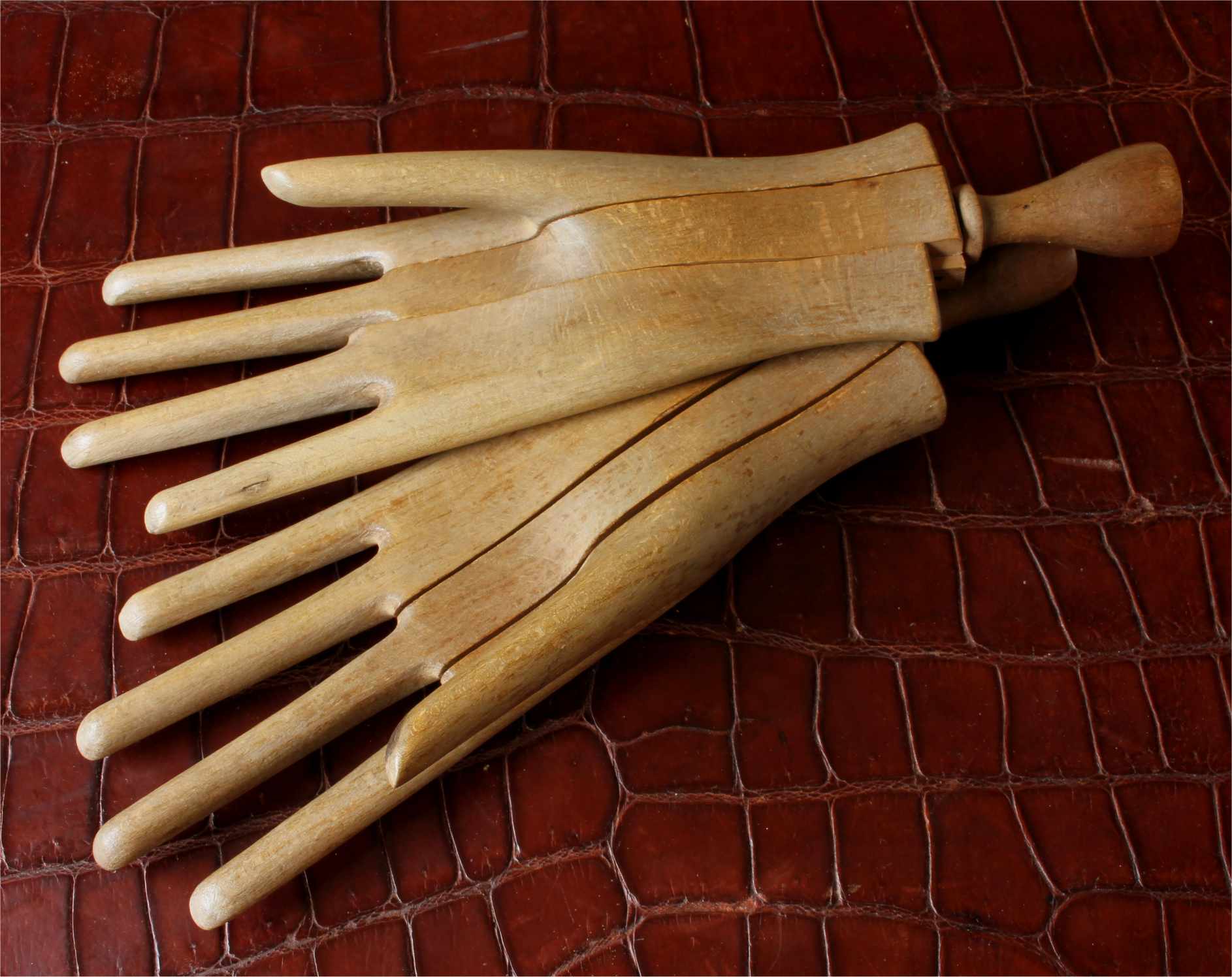This handsome pair of antique wooden glove lasts which come in the form of two mannequin hands are in three parts which slide together and date from c1900.
