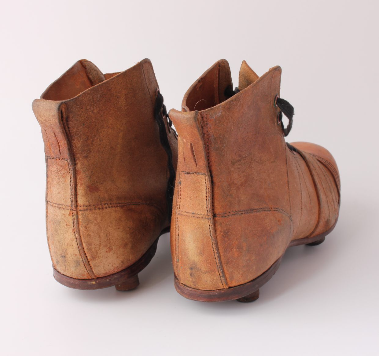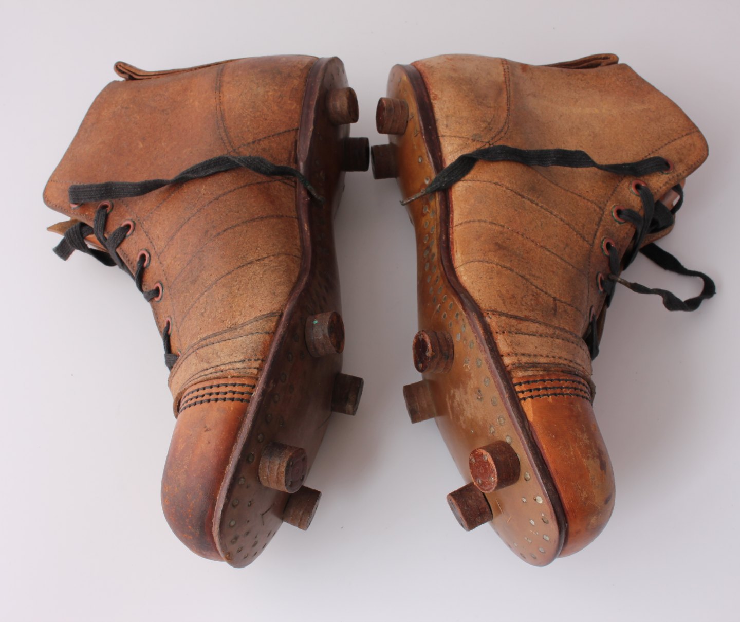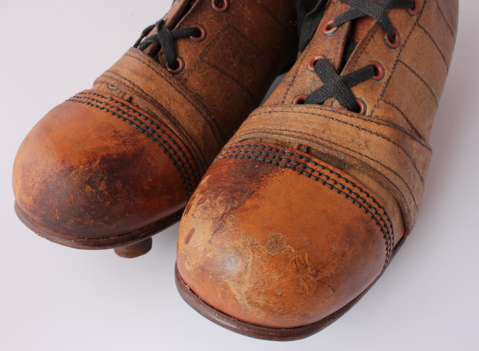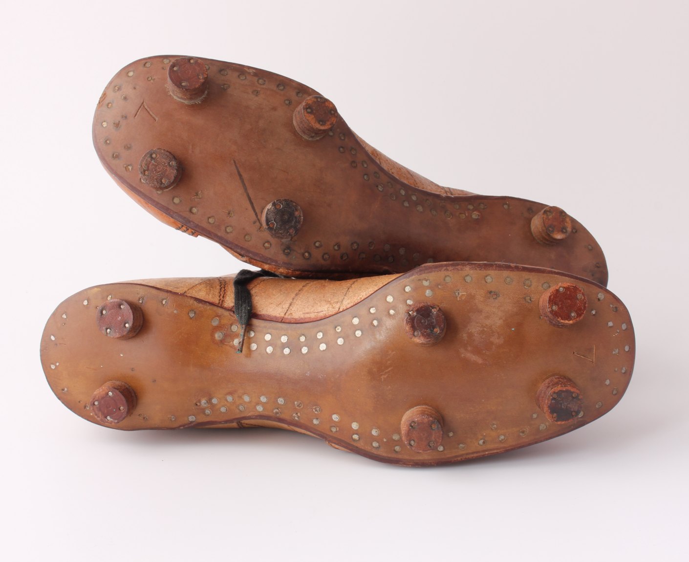 This antique pair of Gola football boots which date from c1920 are made of brown leather with leather soles and nailed on studs.