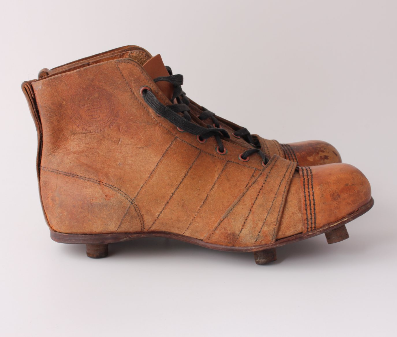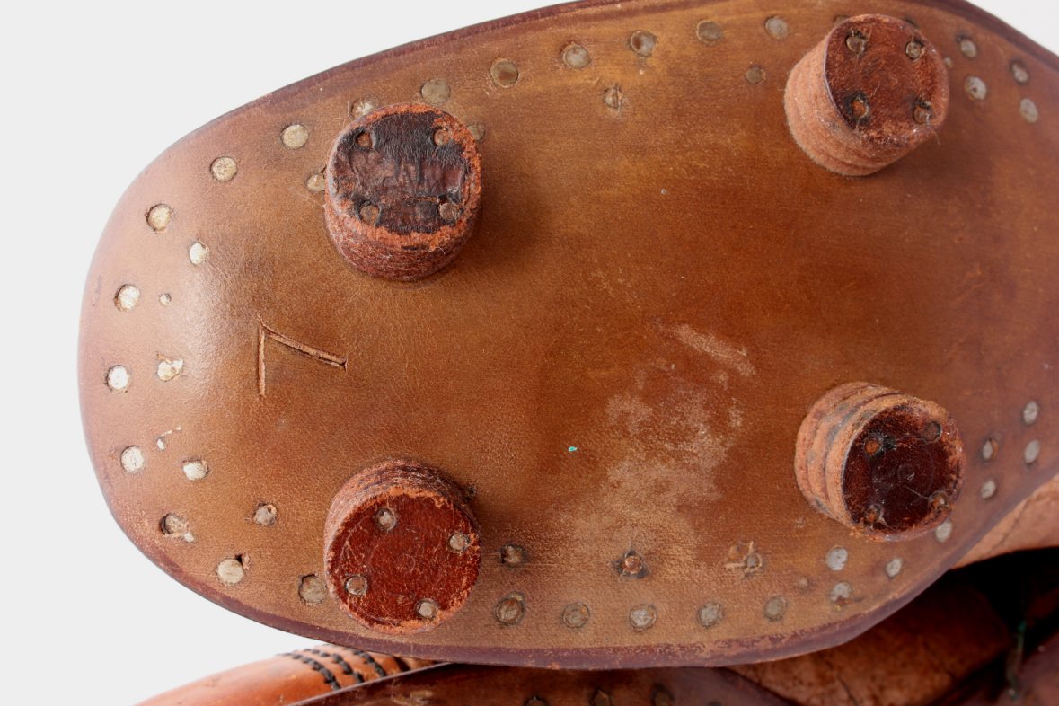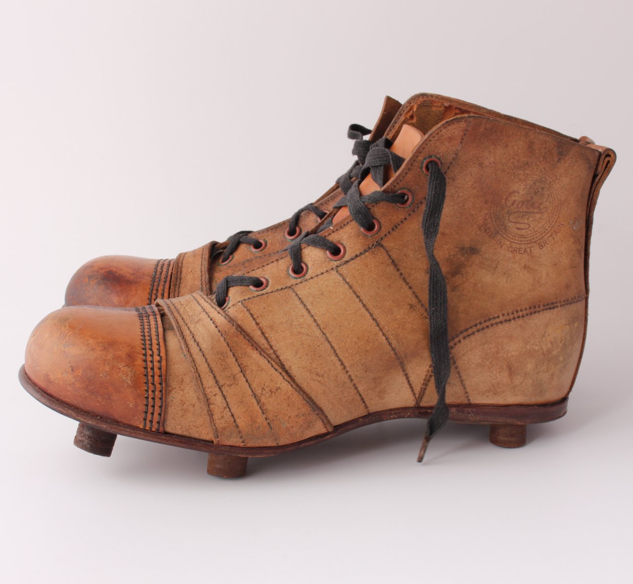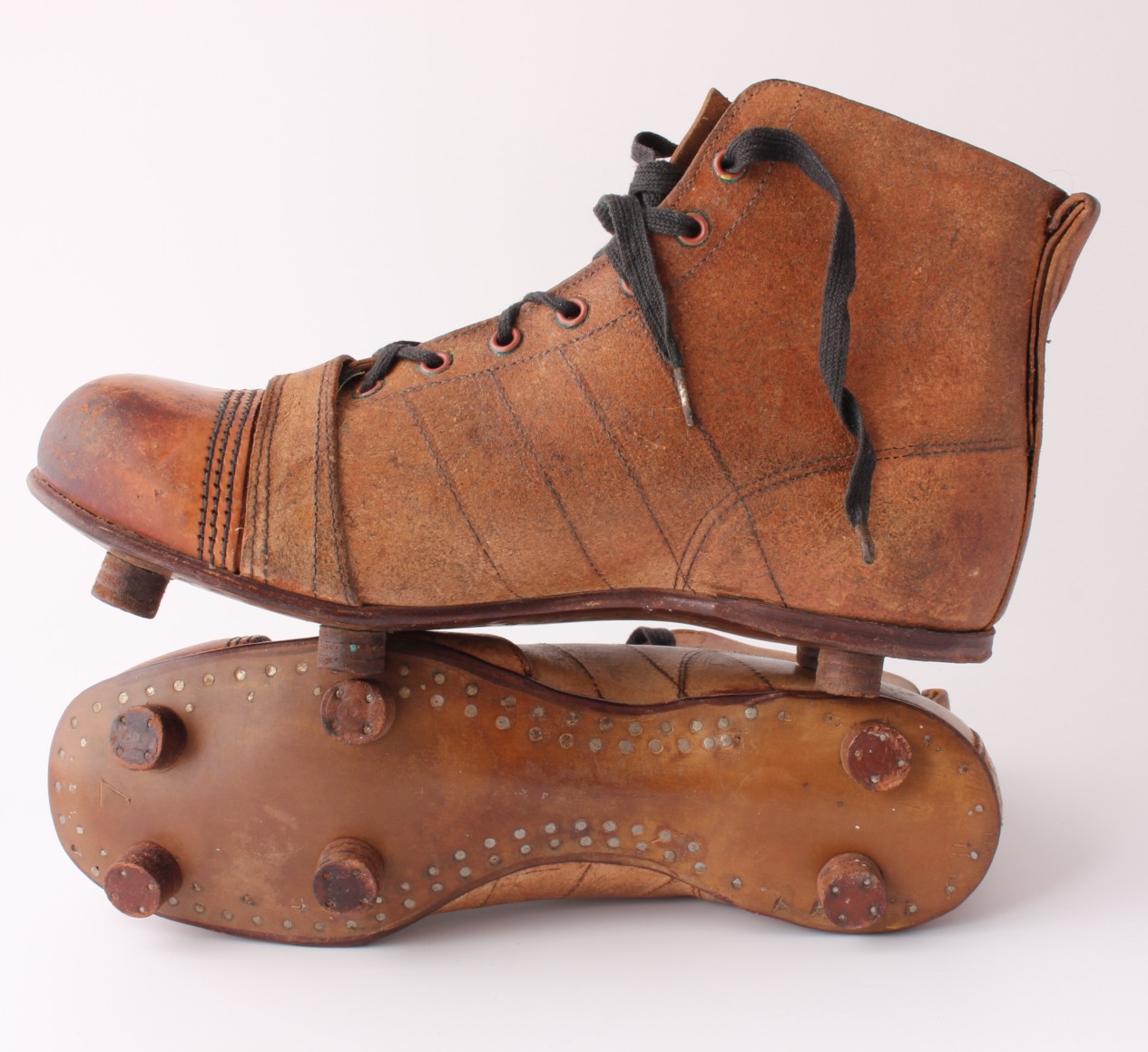 This antique pair of Gola football boots which date from c1920 are made of brown leather with leather soles and nailed on studs.