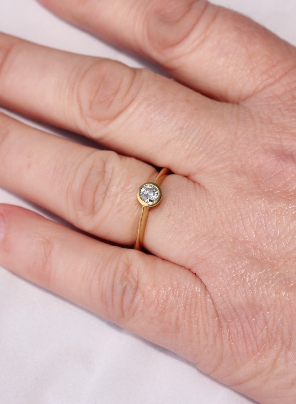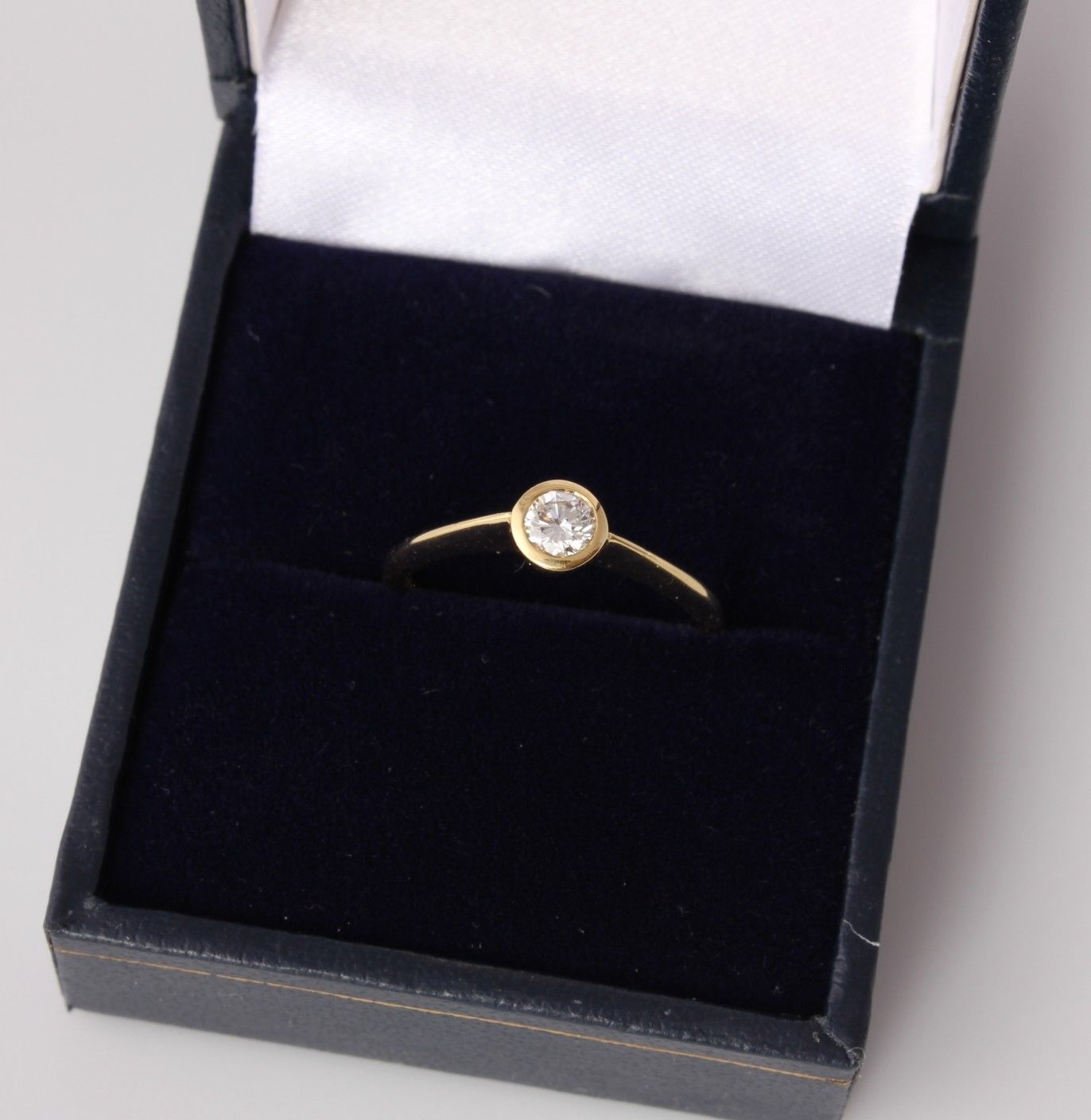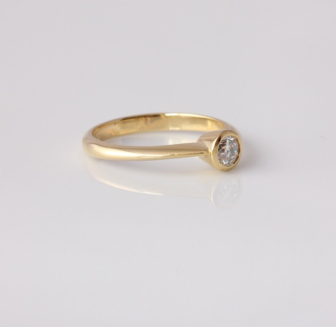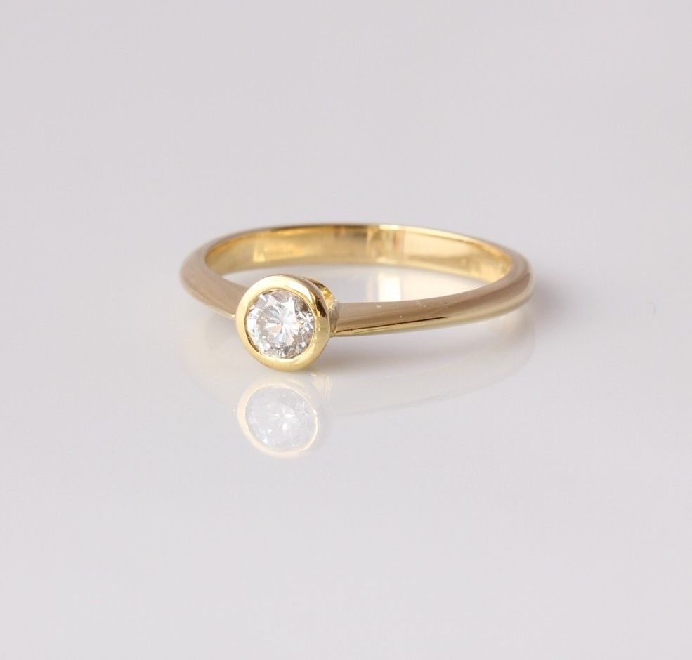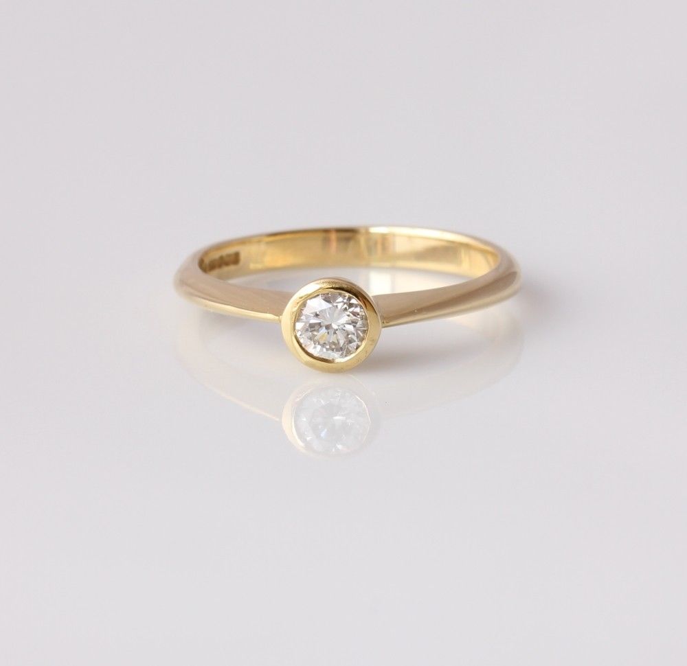 This beautiful solitaire ring is crafted in 18ct yellow gold with a rub-over mount and is set with a brilliant-cut natural diamond collet of 0.25 ct which is sparkly, bright and lively. This lovely ring would make a really great Engagement ring or gift.