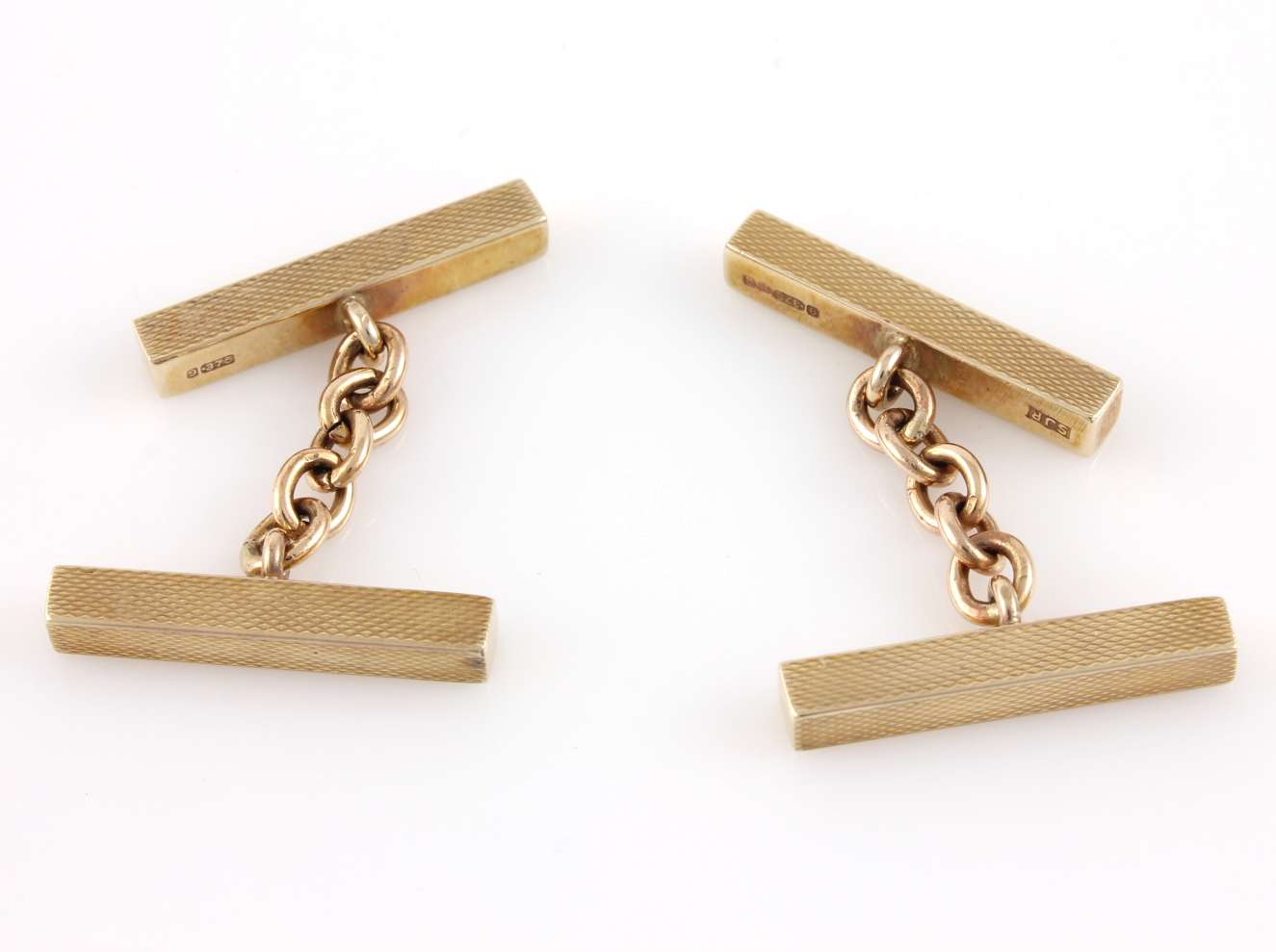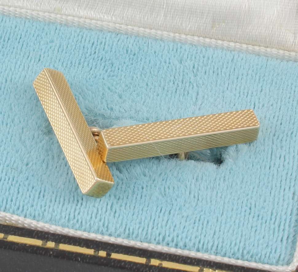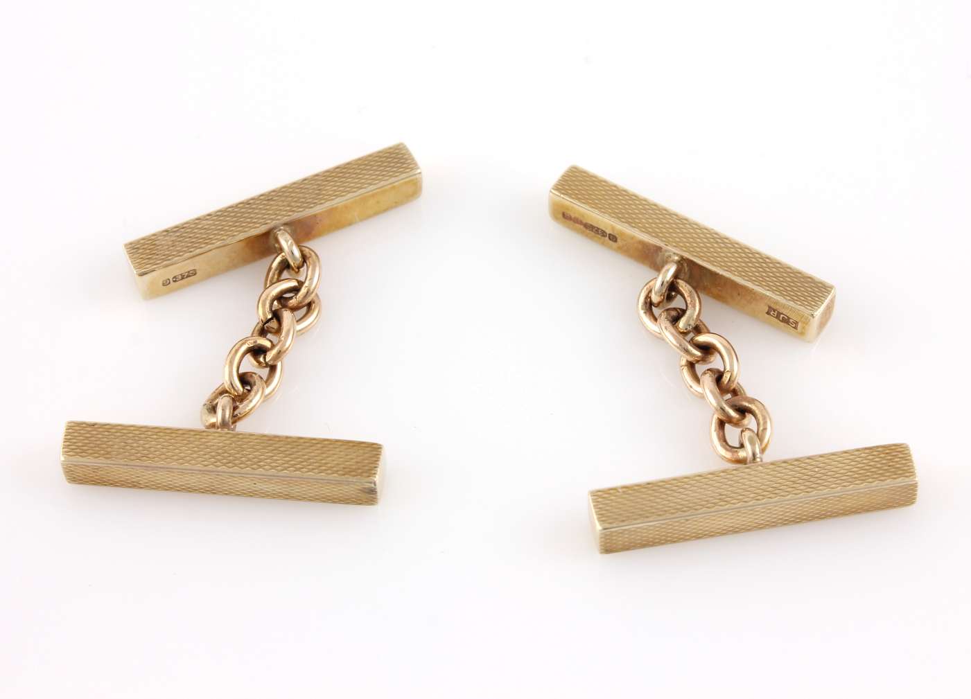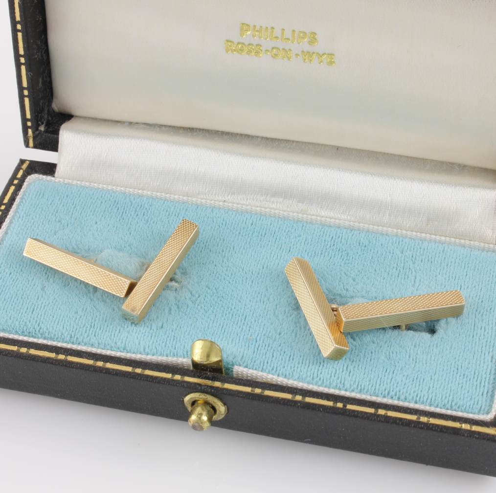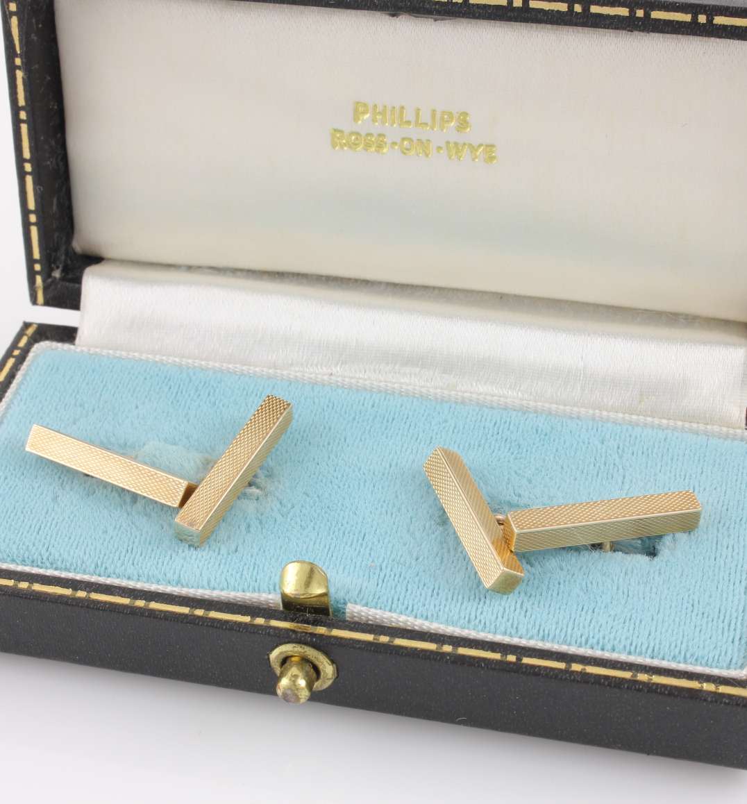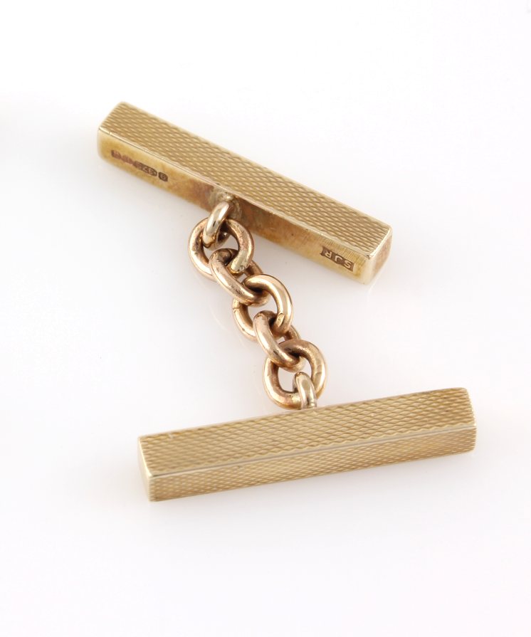 These handsome vintage cufflinks are made of 9ct yellow gold, have a stylish engine turned bar design, are fully hallmarked for 1969 and are made by SJ Rose and Son.