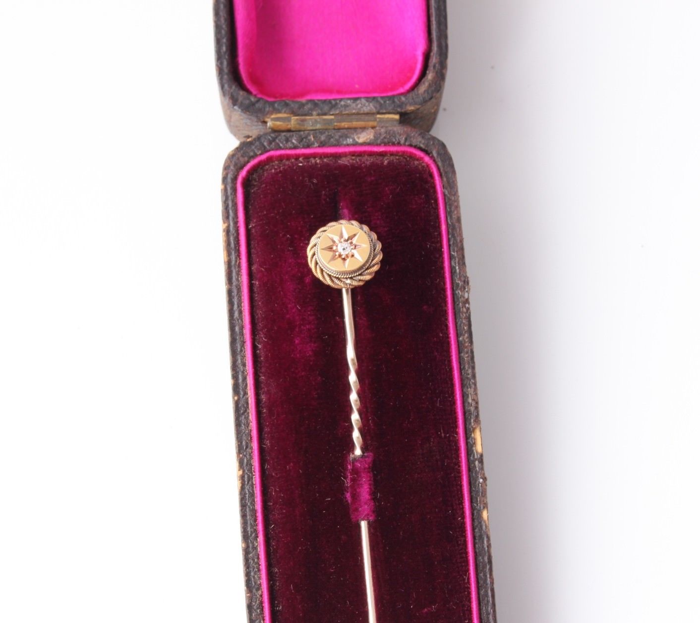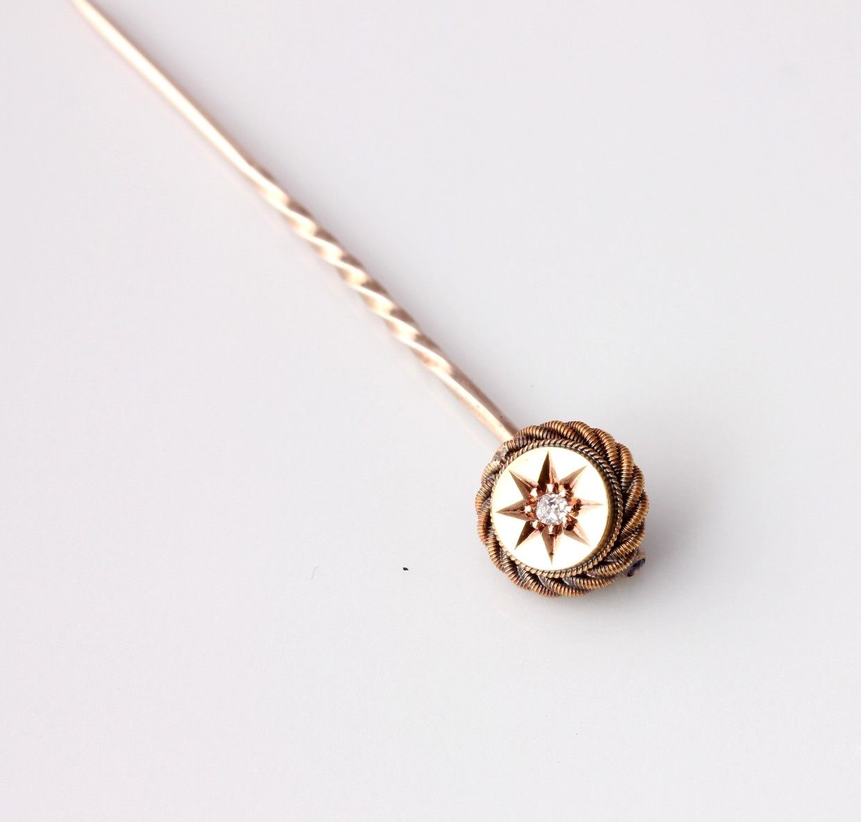 This lovely stick pin/tie pin that dates from the late 19th/early 20th century is set with an old cut natural diamond and is crafted in 15ct yellow gold.