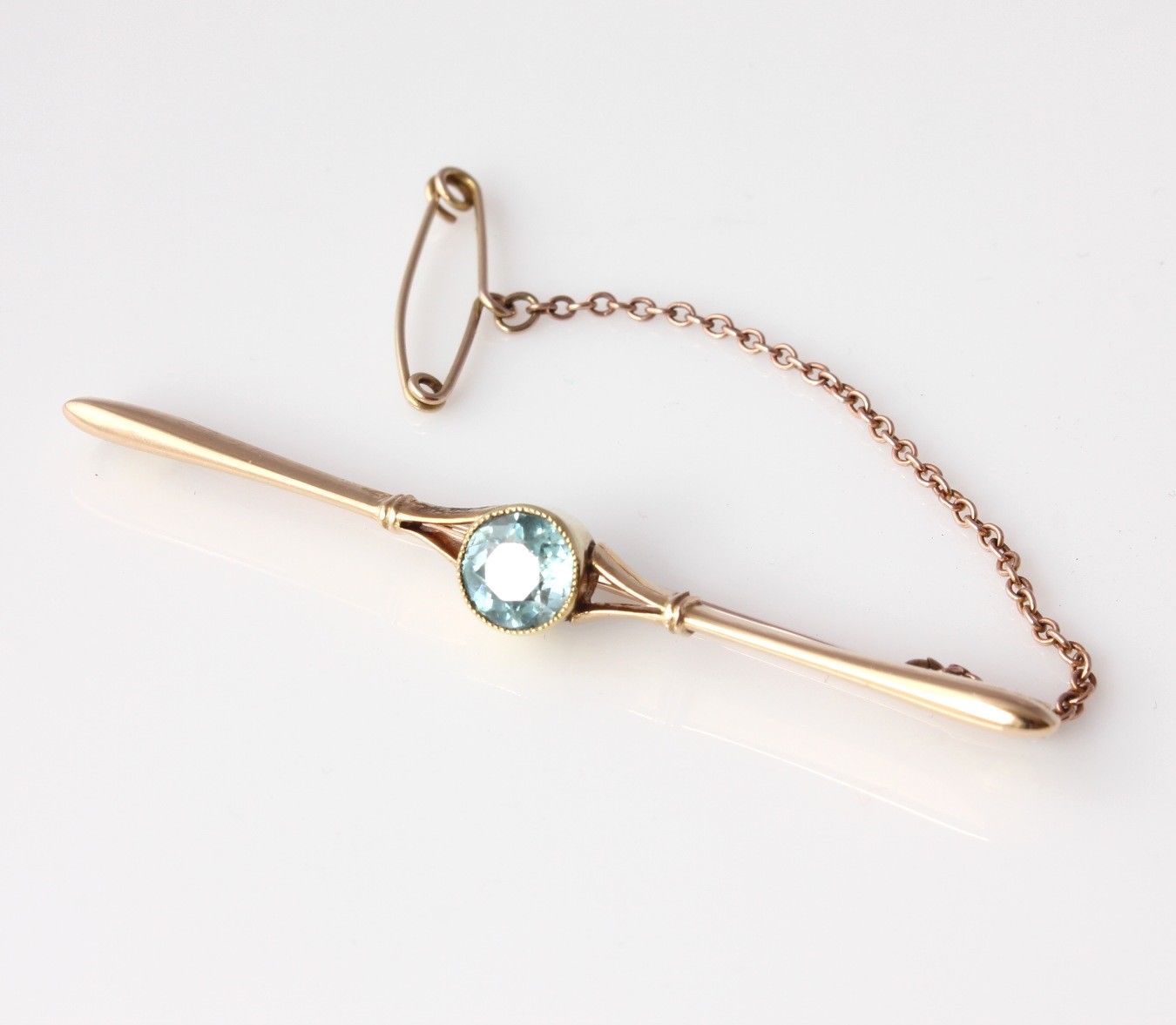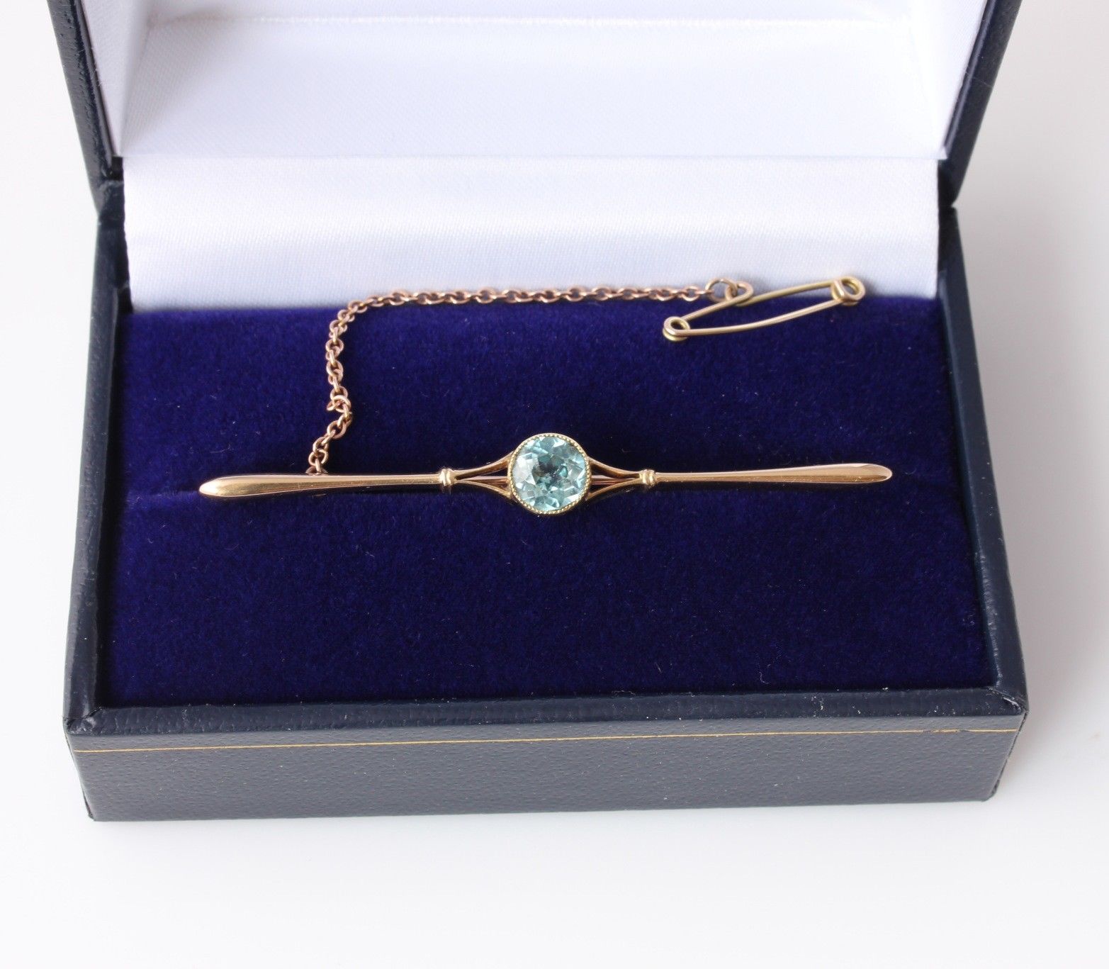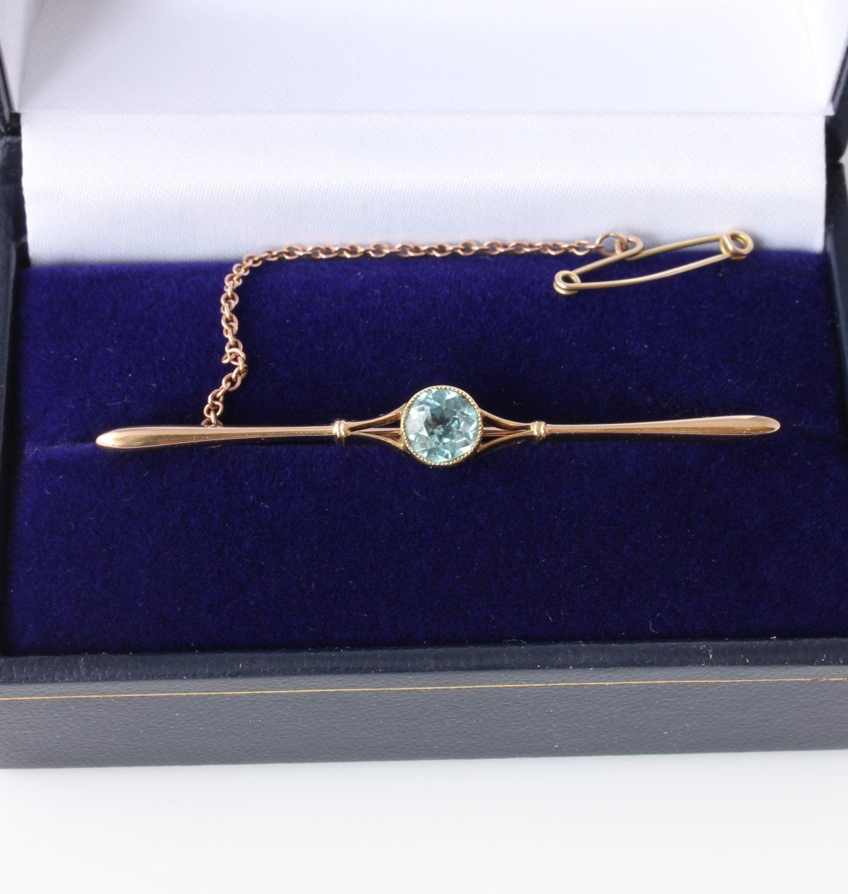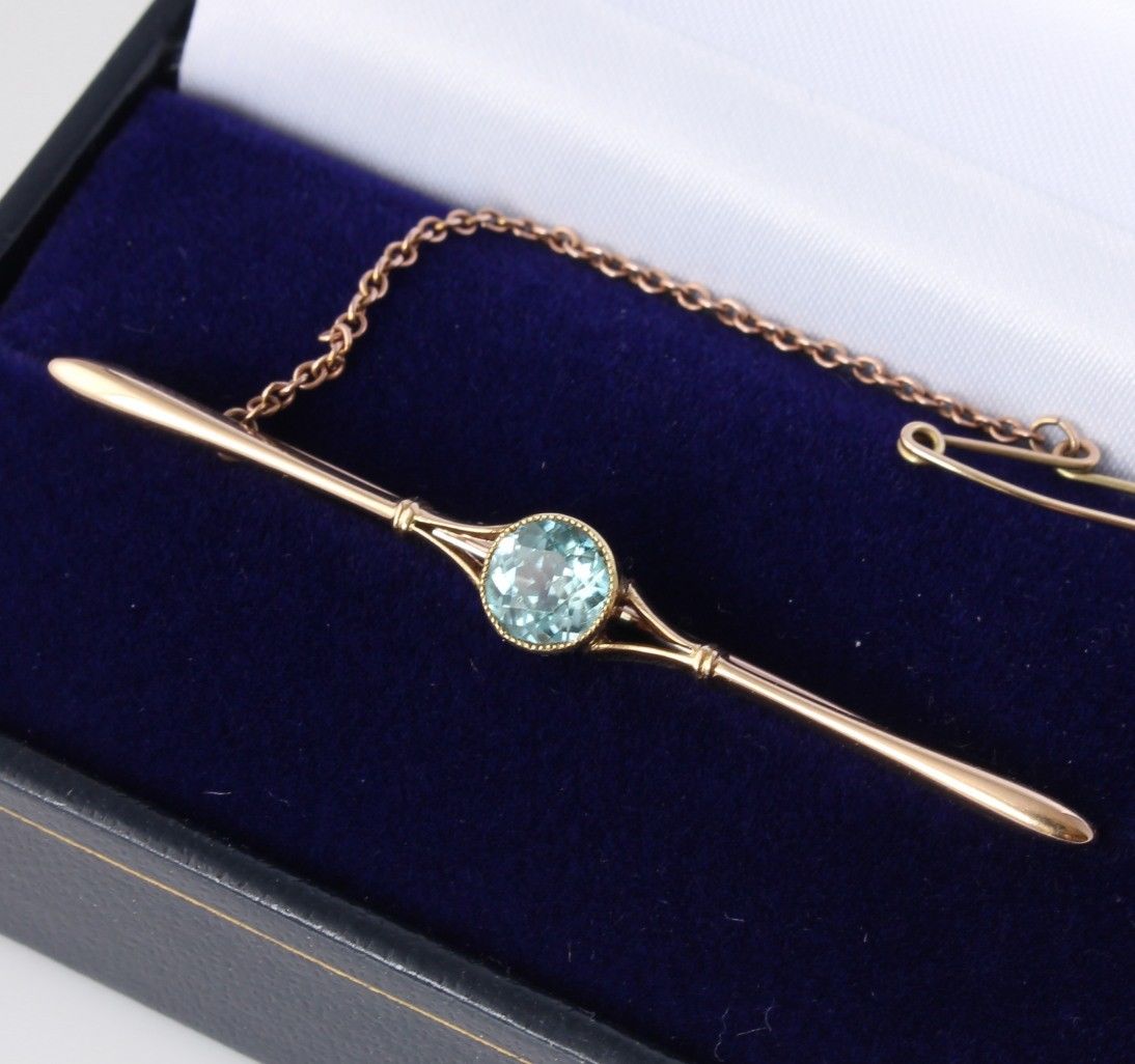 This beautiful Zircon bar brooch is crafted in 15 ct yellow gold and dates from the early 20th century. The pretty brooch has a stylish design with a 0.89 ct central deep blue natural zircon, has a fitted safety chain for extra security, comes in a gift box and is of excellent quality. The Zircon has a lovely deep blue hue with good clarity.