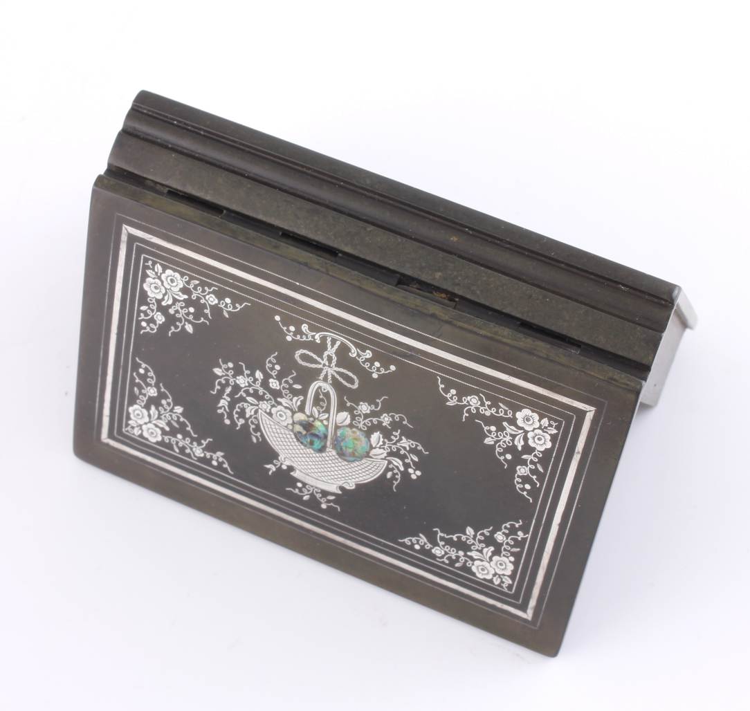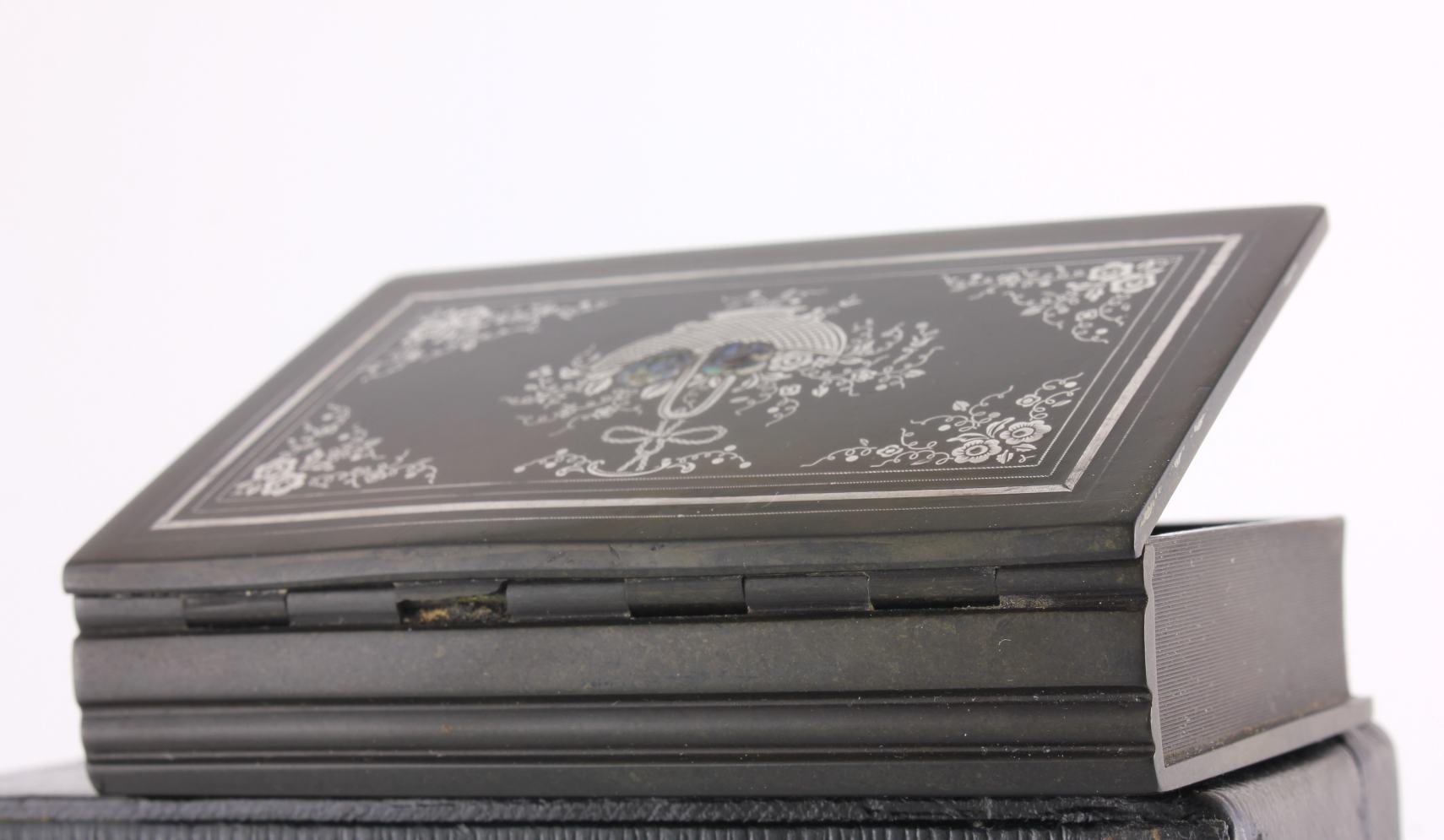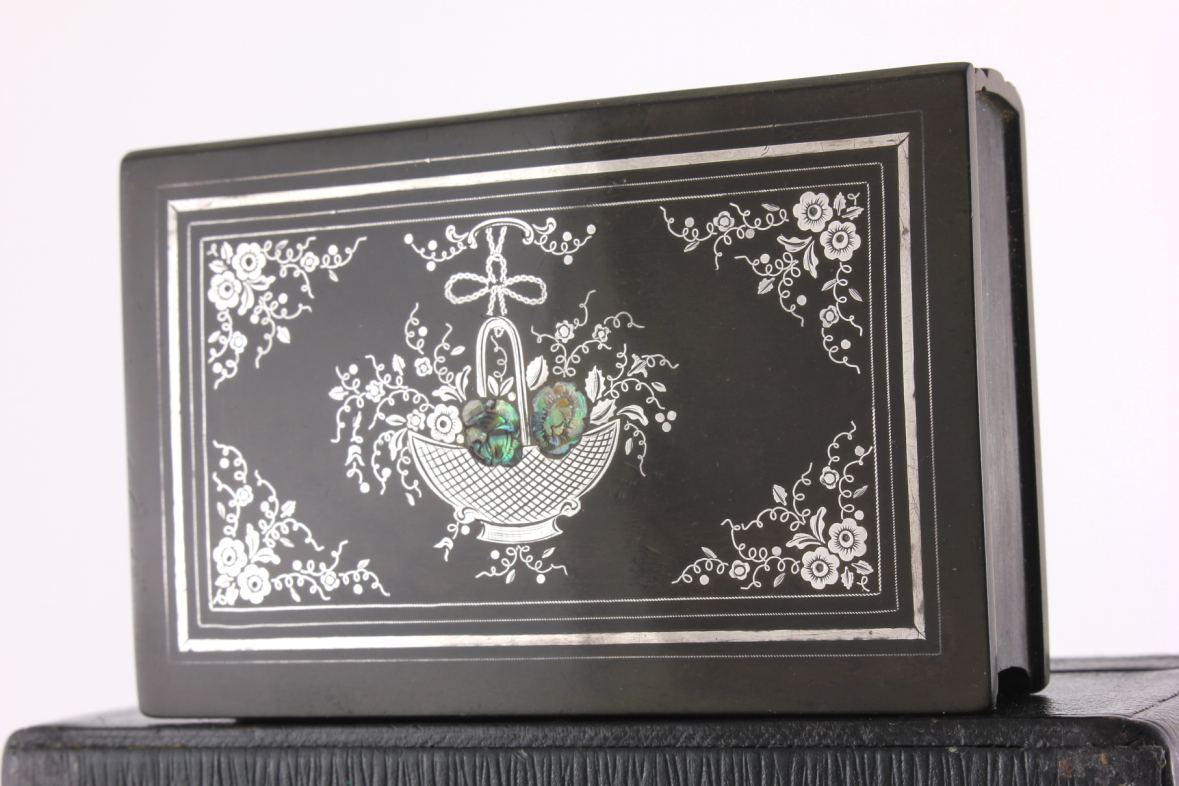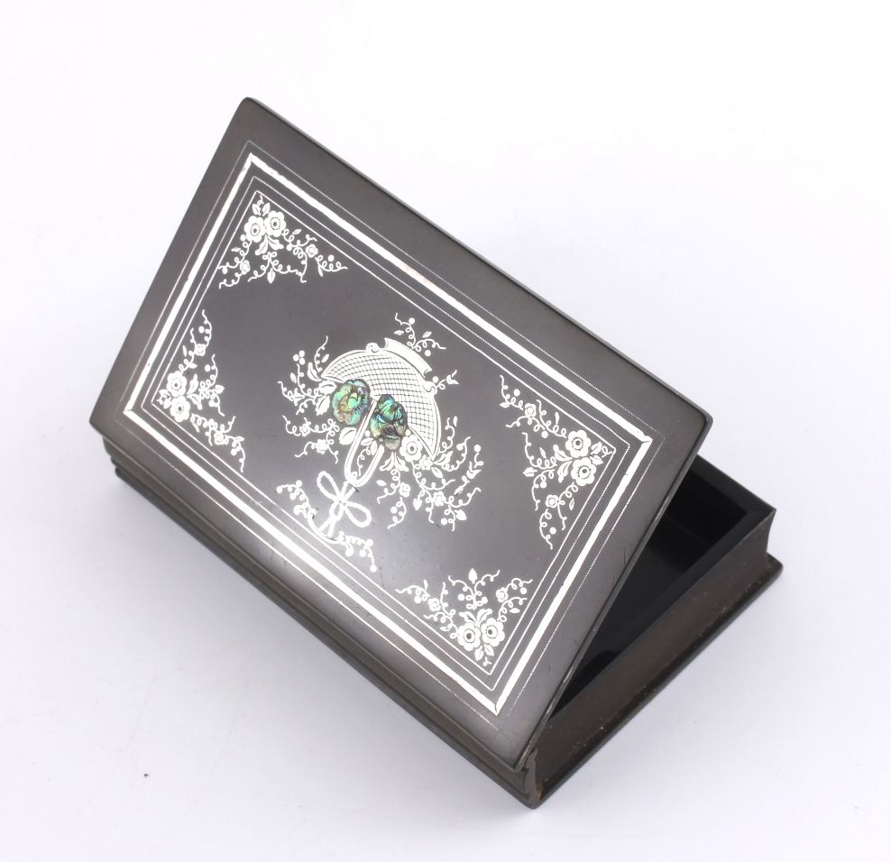 The outer of the hinged lid is inlaid with a silver decoration with mother of pearl and the interior is embossed with a maker's inscription that reads De Lafertrille & Cie A Paris. Brevit Goodyear Sgdg. Caoutchouc.