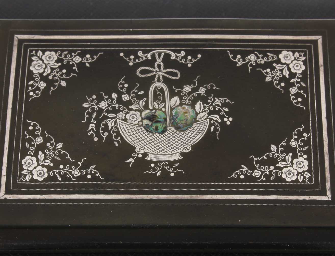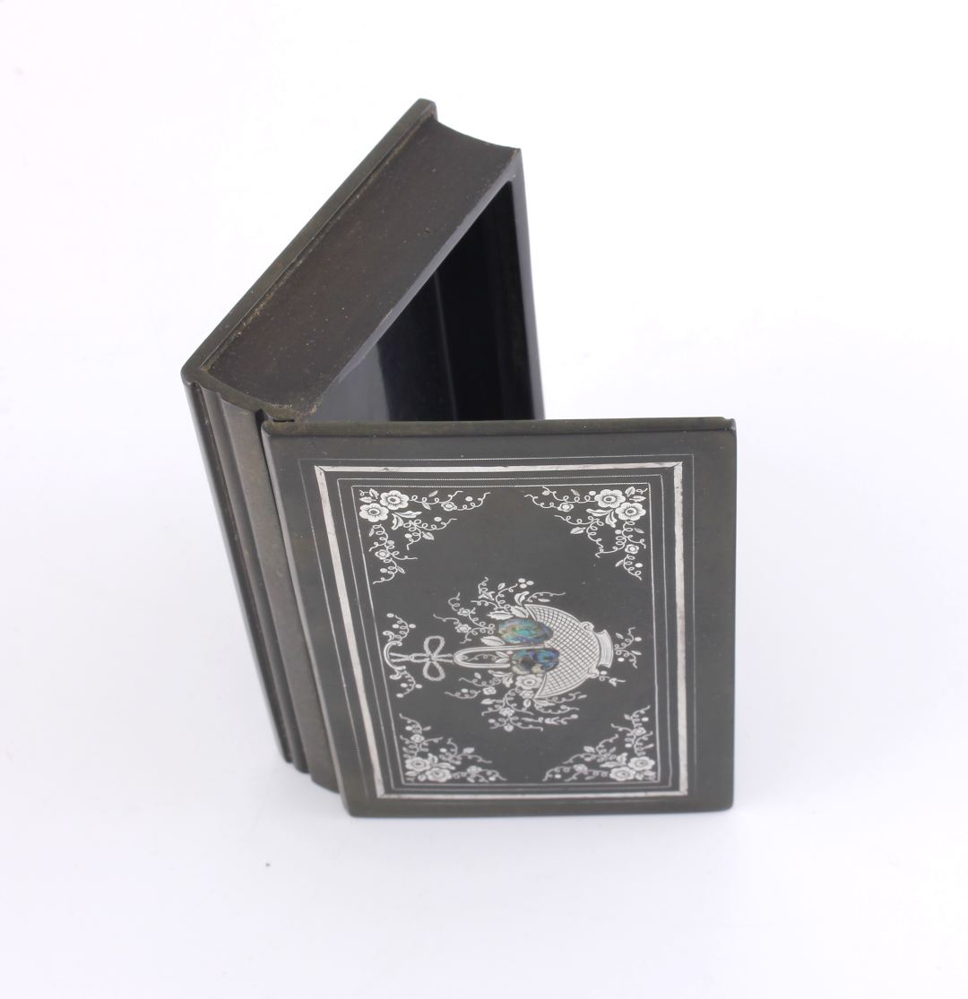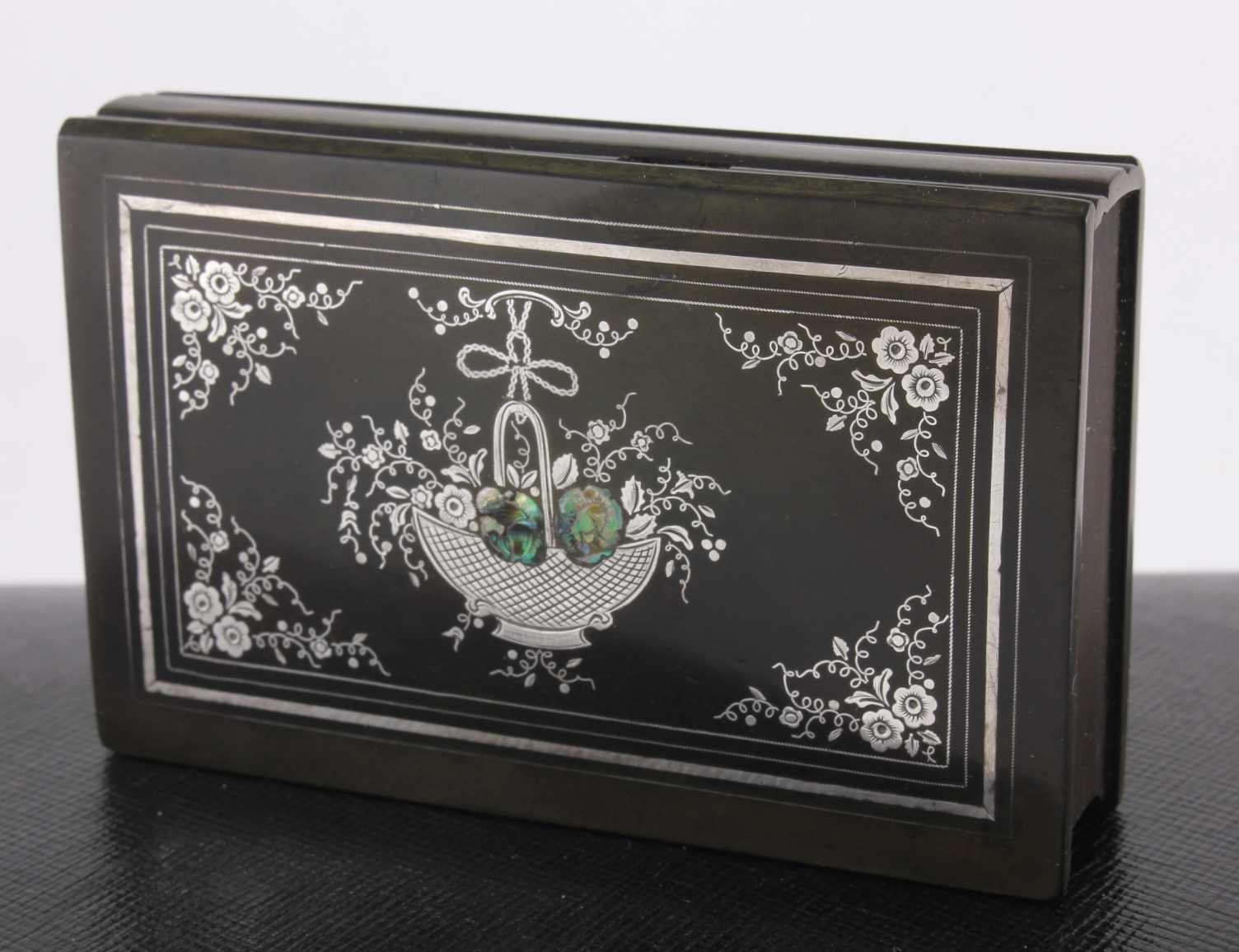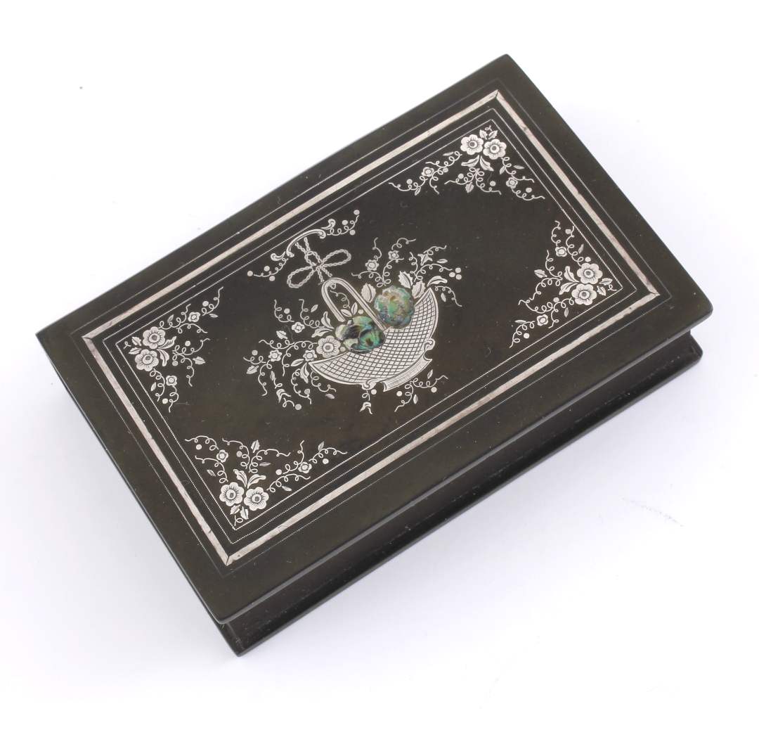 The outer of the hinged lid is inlaid with a silver decoration with mother of pearl and the interior is embossed with a maker's inscription that reads De Lafertrille & Cie A Paris. Brevit Goodyear Sgdg. Caoutchouc.
