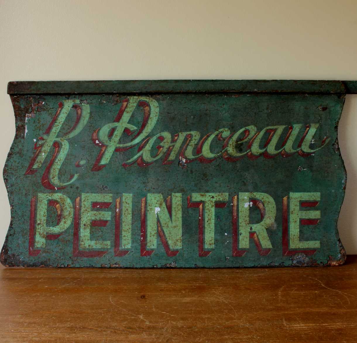 This French tradesman's sign which is made of metal has a painted green background, has the wording R Ponceau Peintre hand painted to each side in green and red and dates from c1900.