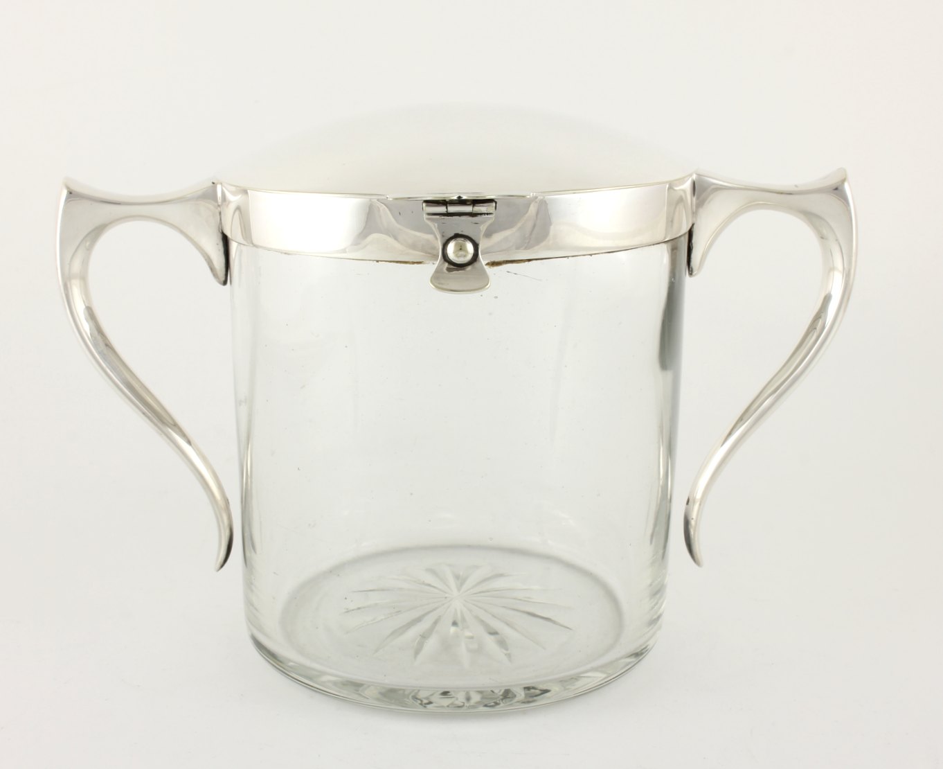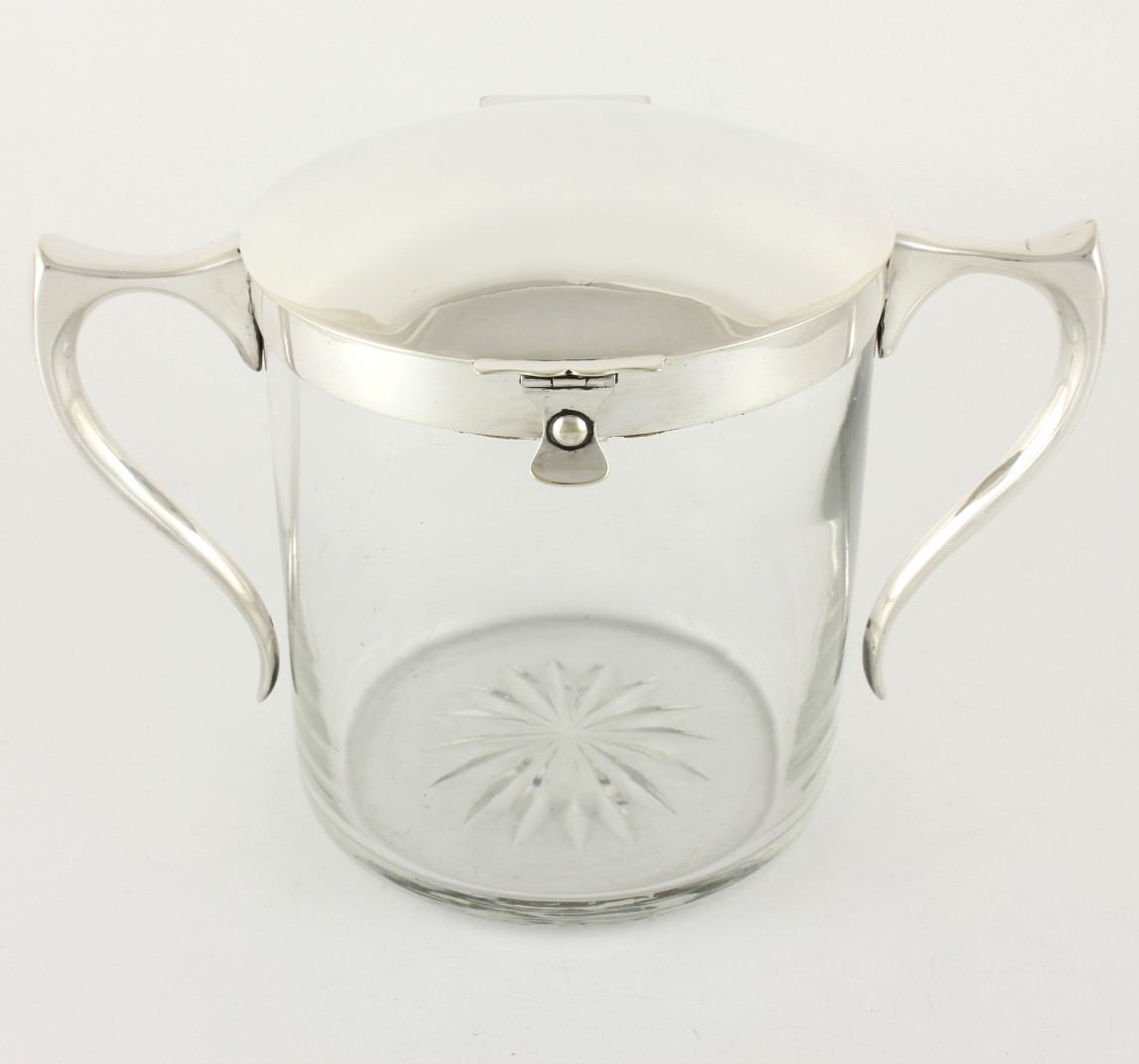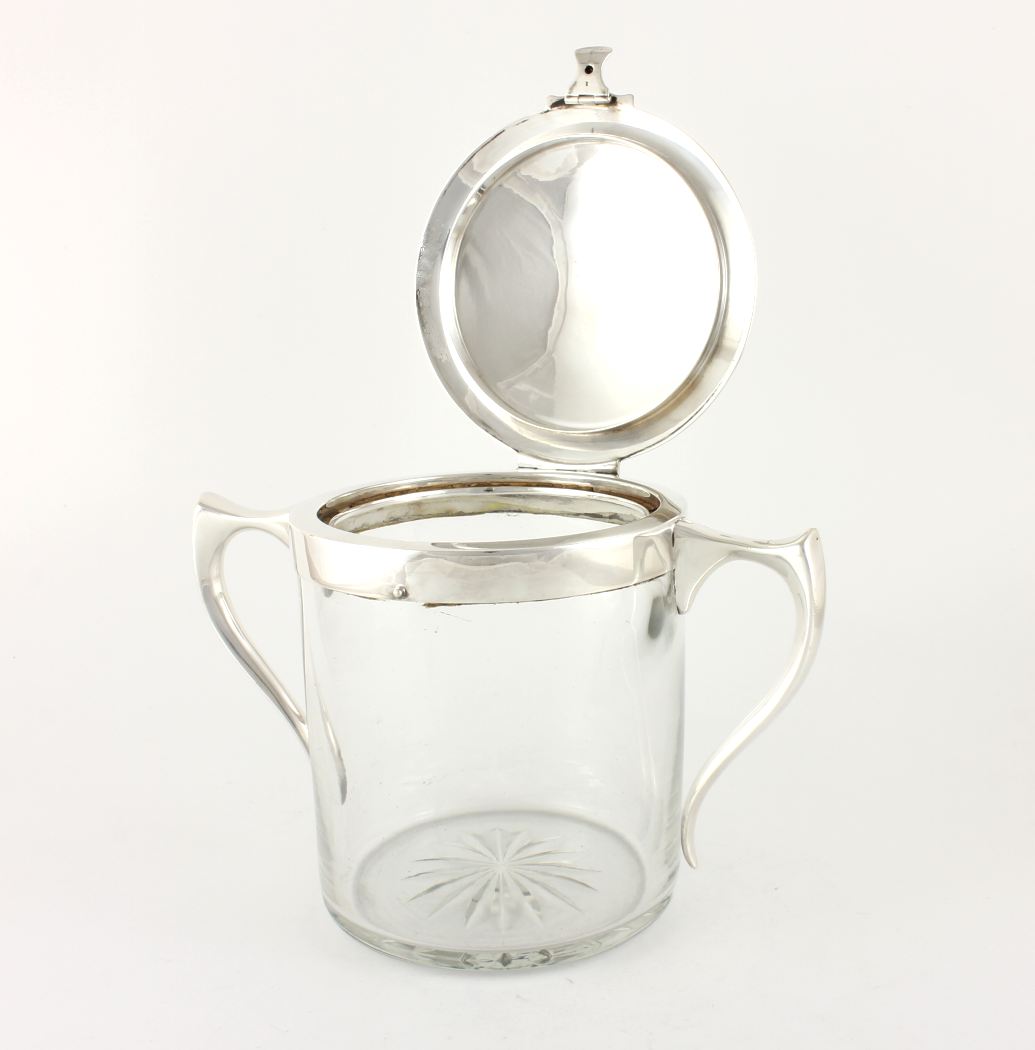 This stylish Arts & Crafts biscuit box which is made of glass has a silver plated hinged dome lid with front fastening clip, two side handles, cork seal and dates from c1890.
