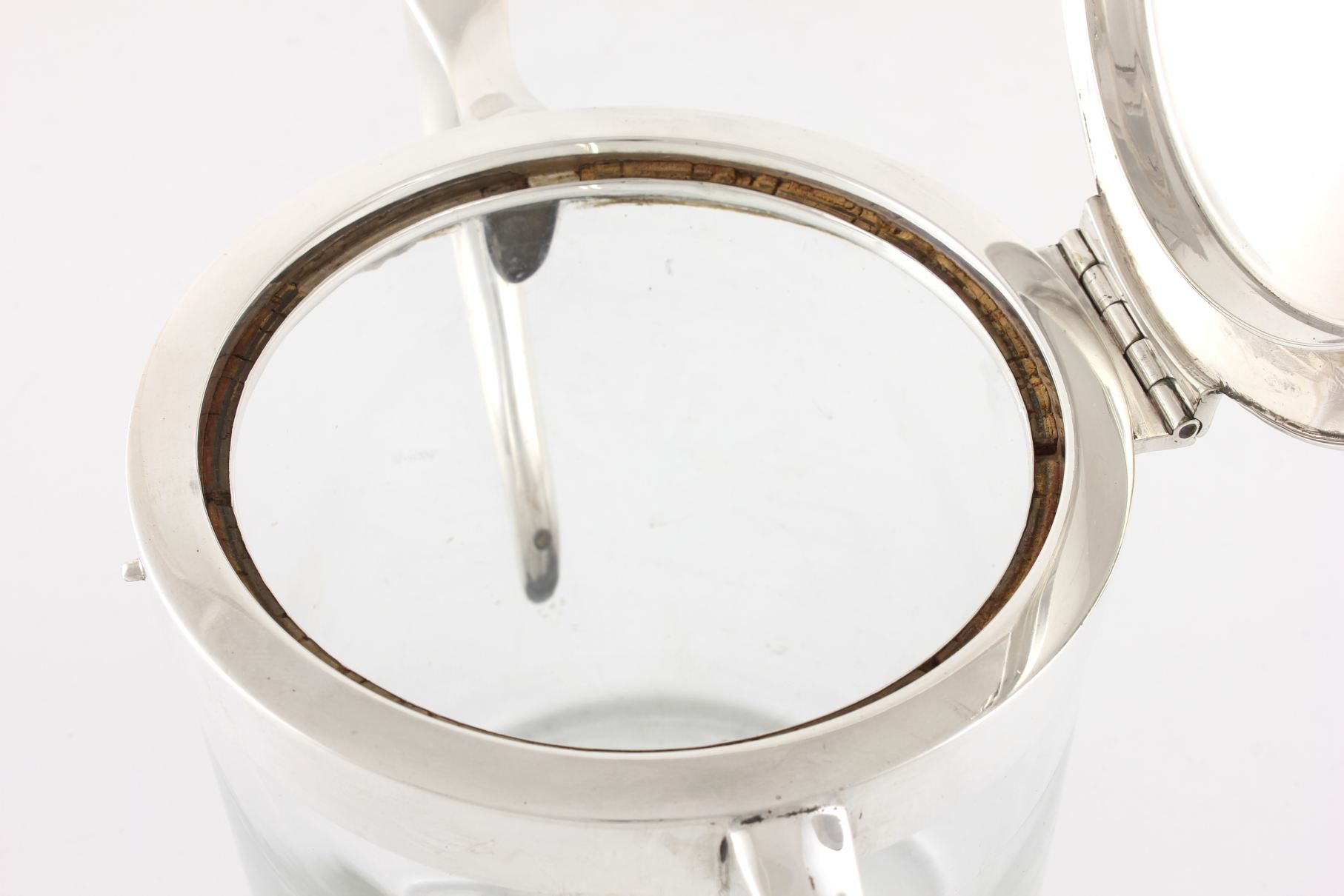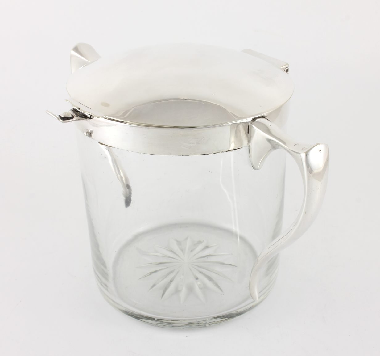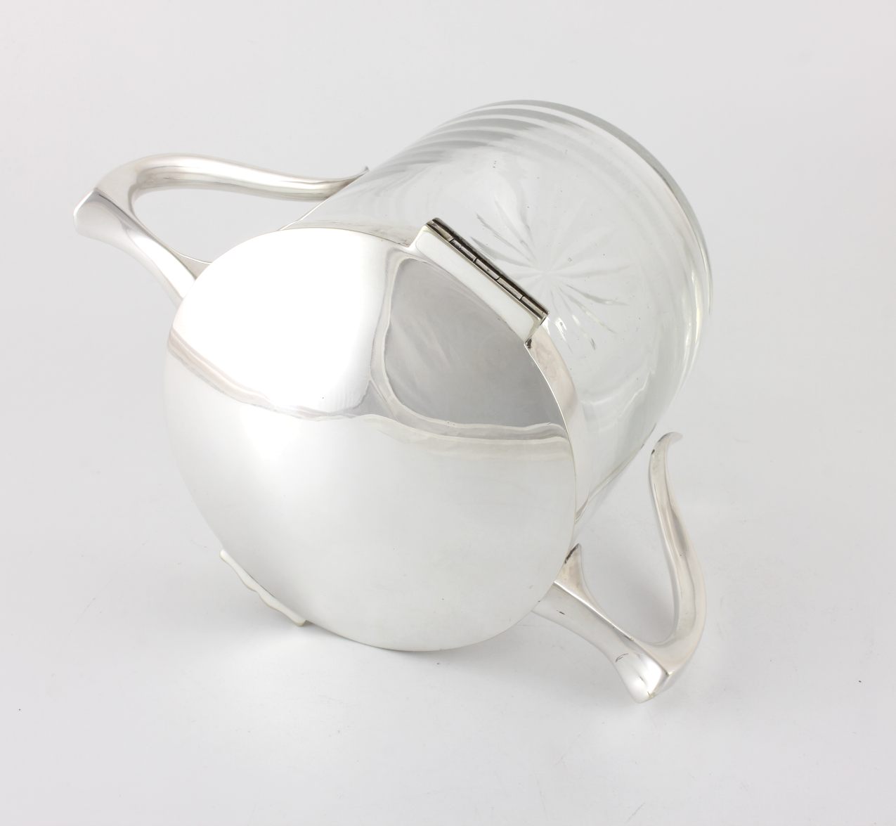 This stylish Arts & Crafts biscuit box which is made of glass has a silver plated hinged dome lid with front fastening clip, two side handles, cork seal and dates from c1890.