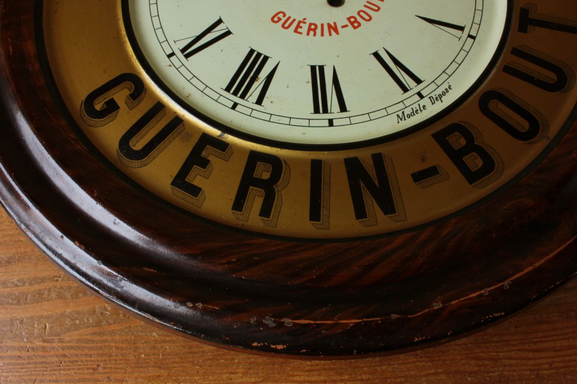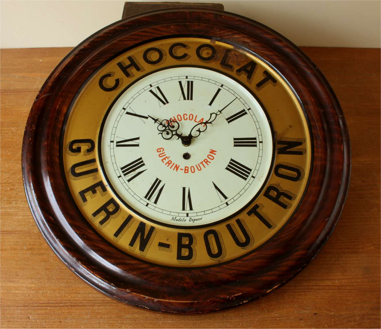 This stylish chocolate advertising wall clock which dates from c1930 is made of embossed painted metal and would have originally been hung in a French Cafe to advertise Guerin Boutron Chocolat.