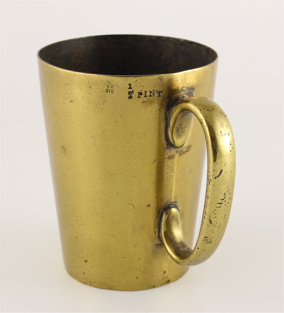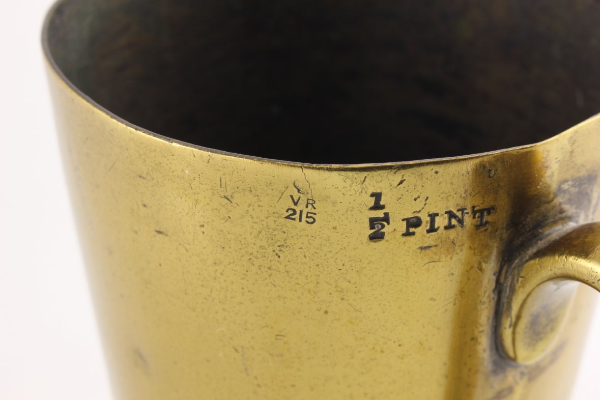 This antique half pint brass measure has a large side handle and is marked to the outer with the Queen Victorian Cipher, the numbers 215 and 1/2 PINT.
