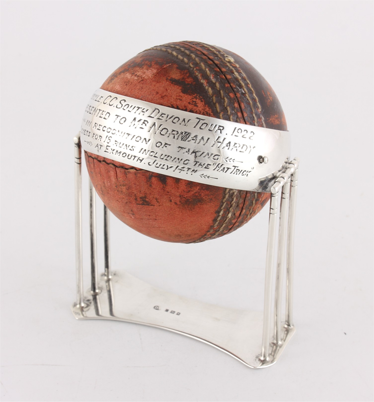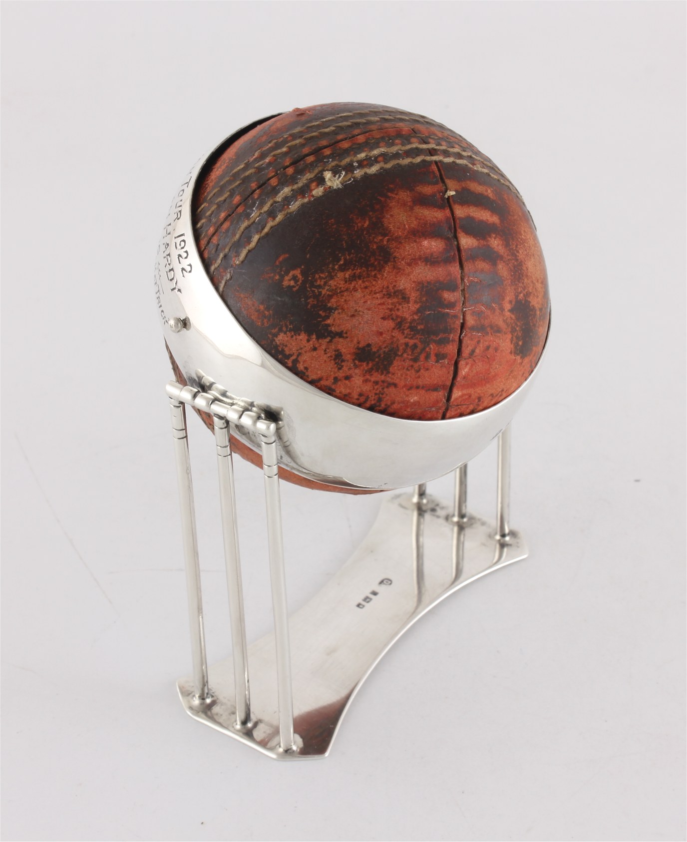 This interesting antique cricket ball trophy which was made using the original cricket ball from the match played in 1922 sits in it's fitted silver hallmarked stand which has cricket stumps as the base and a silver hallmarked band around the centre that reads: