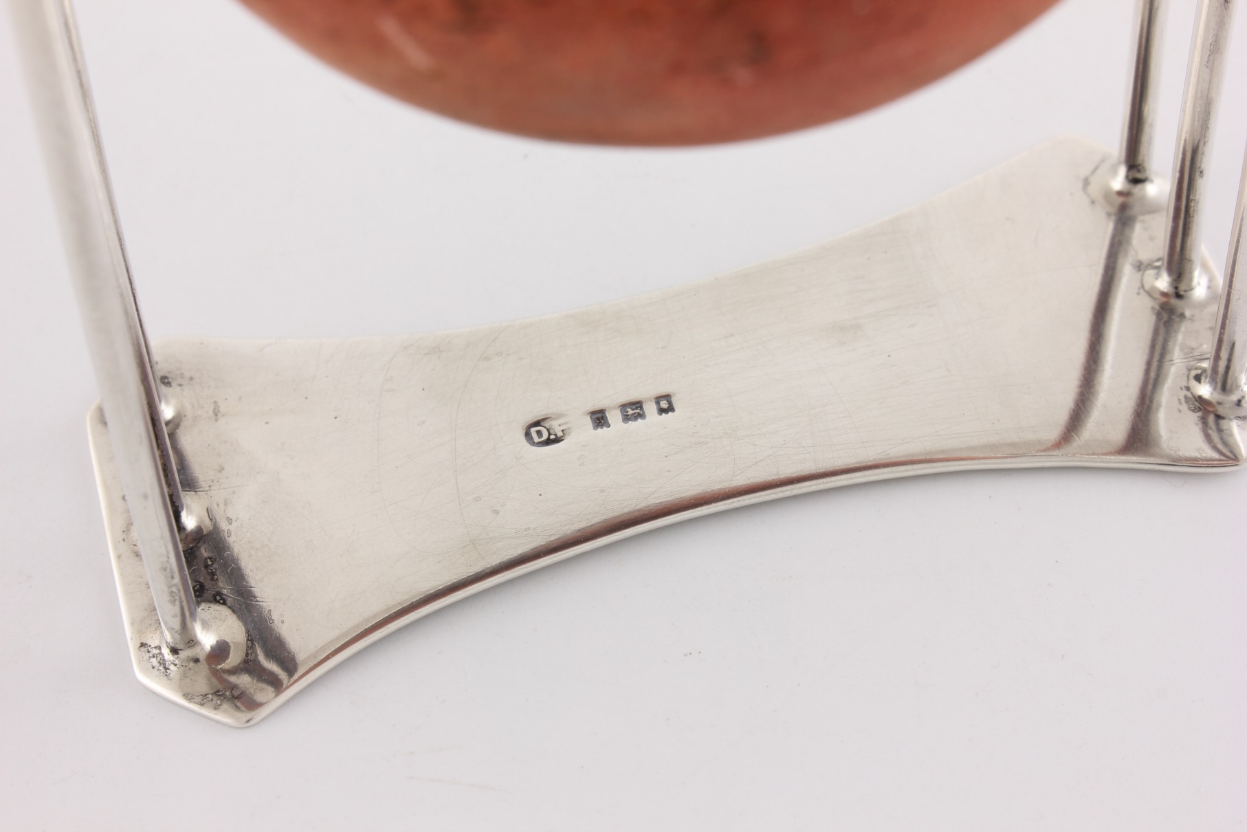 Hallmarks: Hallmarked to band on the ball and also stand with Lion for Sterling Silver. Leopard's head for London. Date letter g for 1922. Maker's mark DF for Josiah Williams & Co.