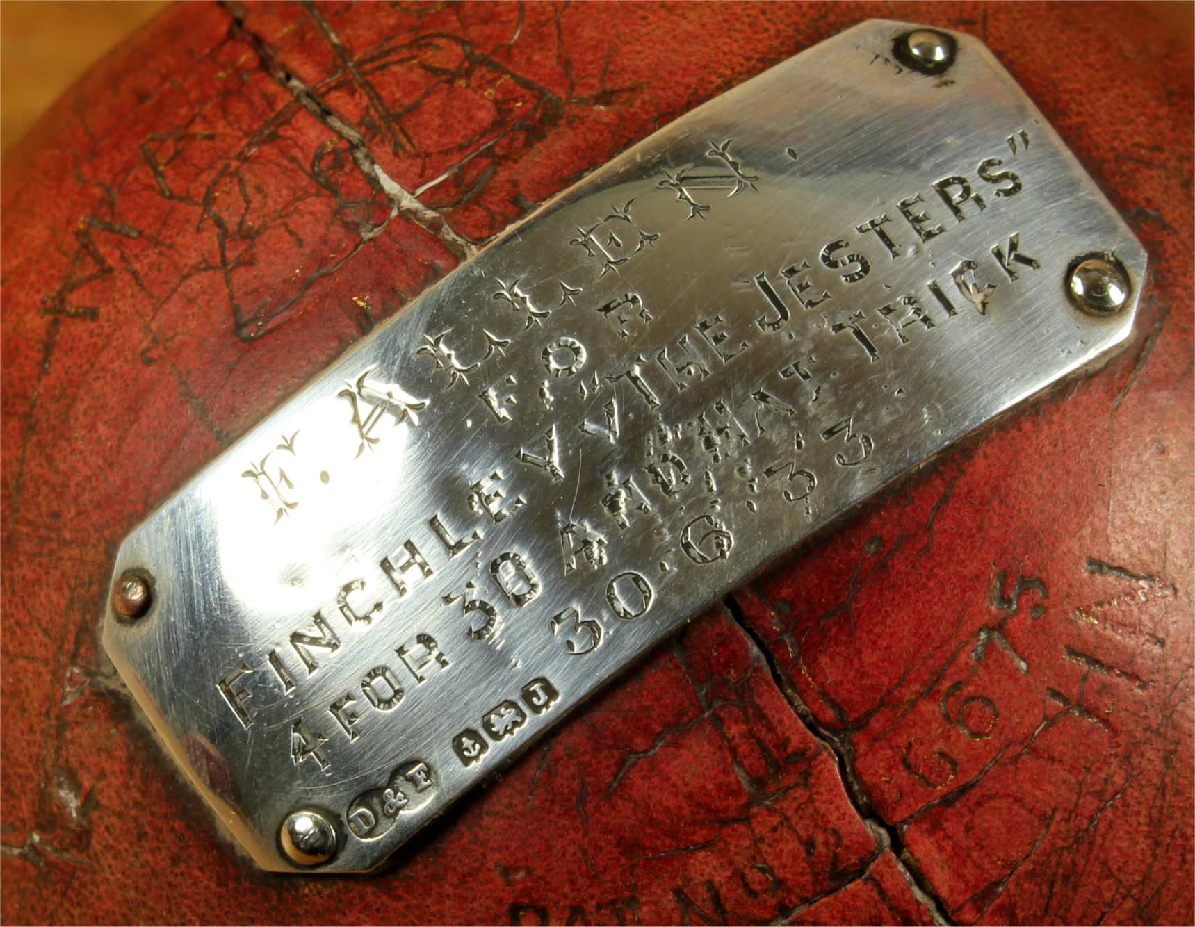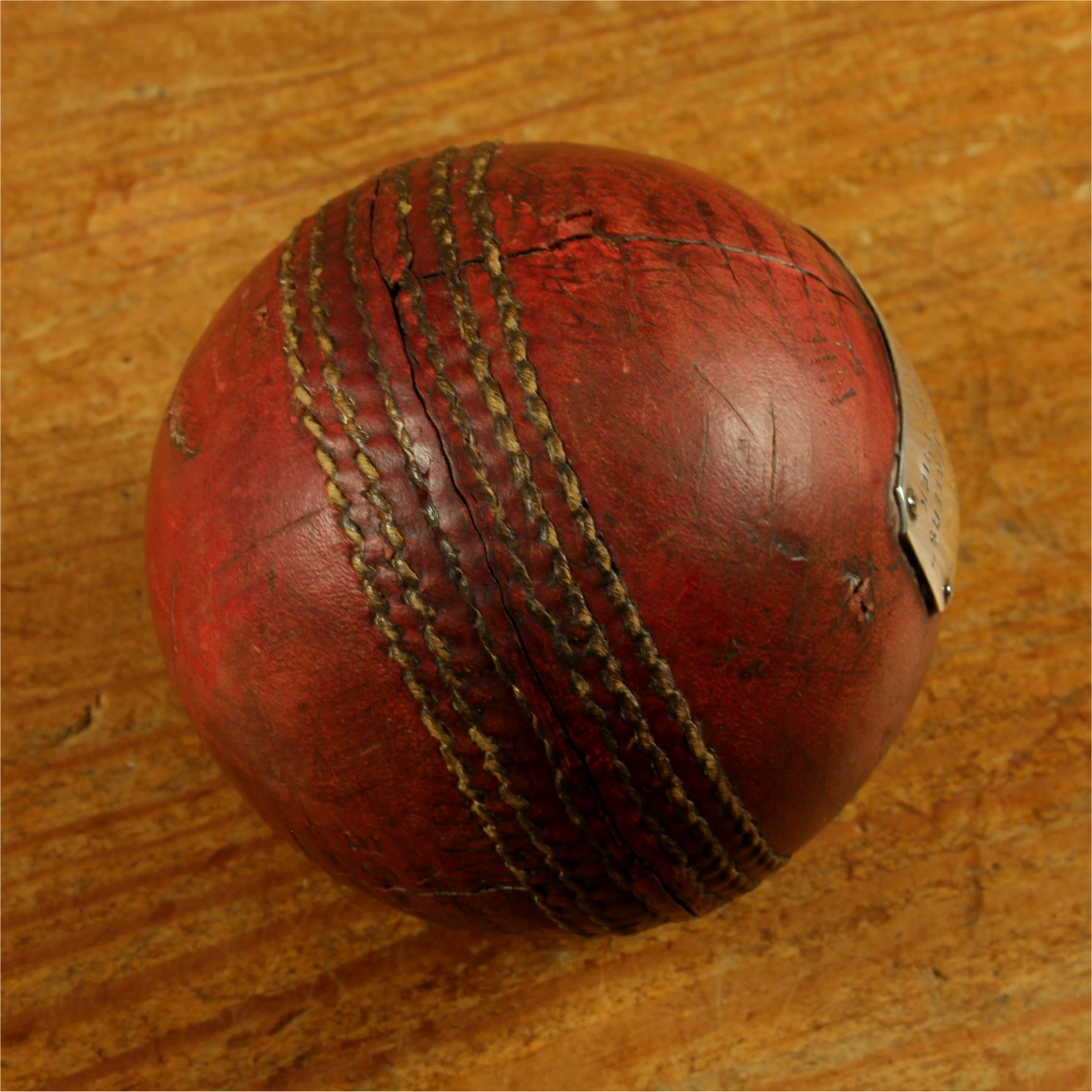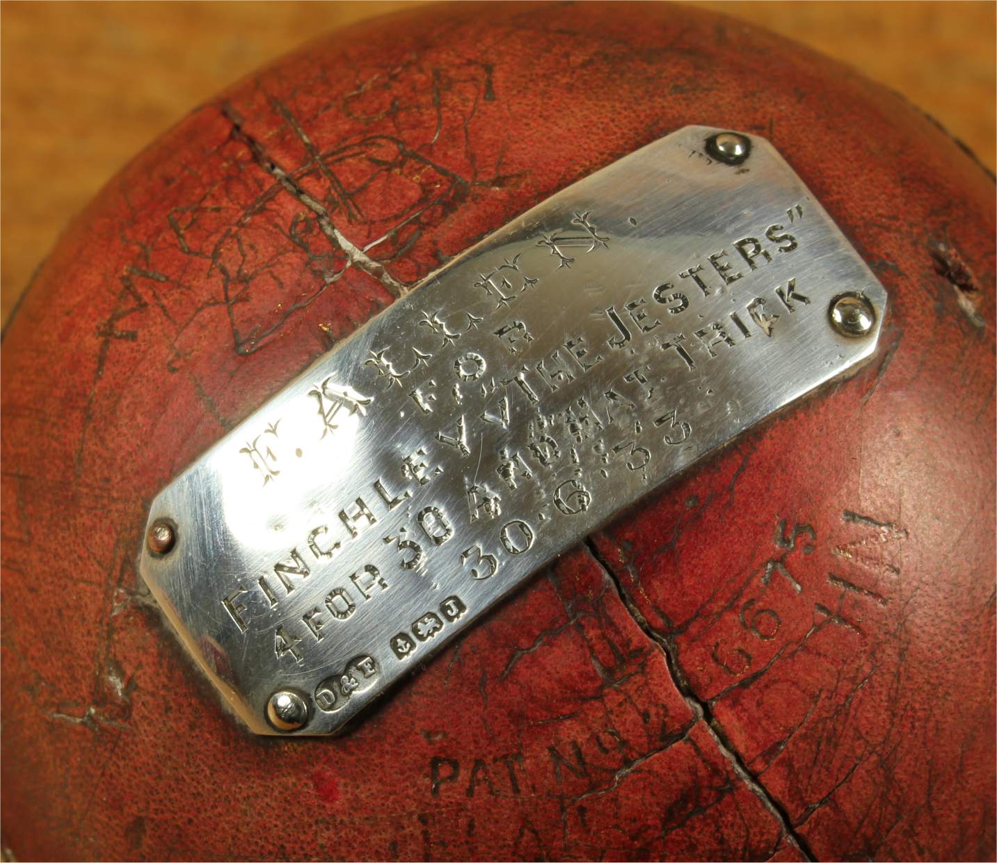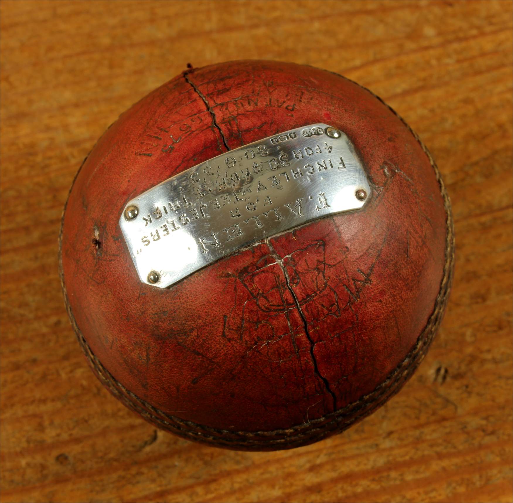 Material: Cricket Ball. Sterling silver plaque.