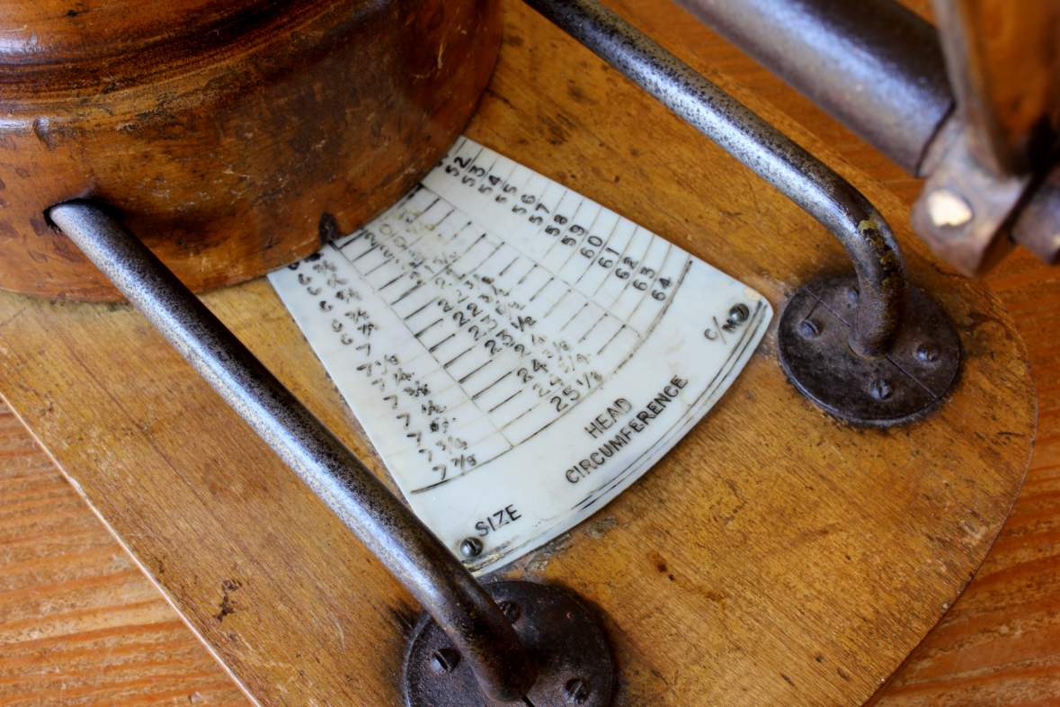 This mechanical hat sizer has a brass handle which when turned opens and closes the wooden hat section to adjust the size.