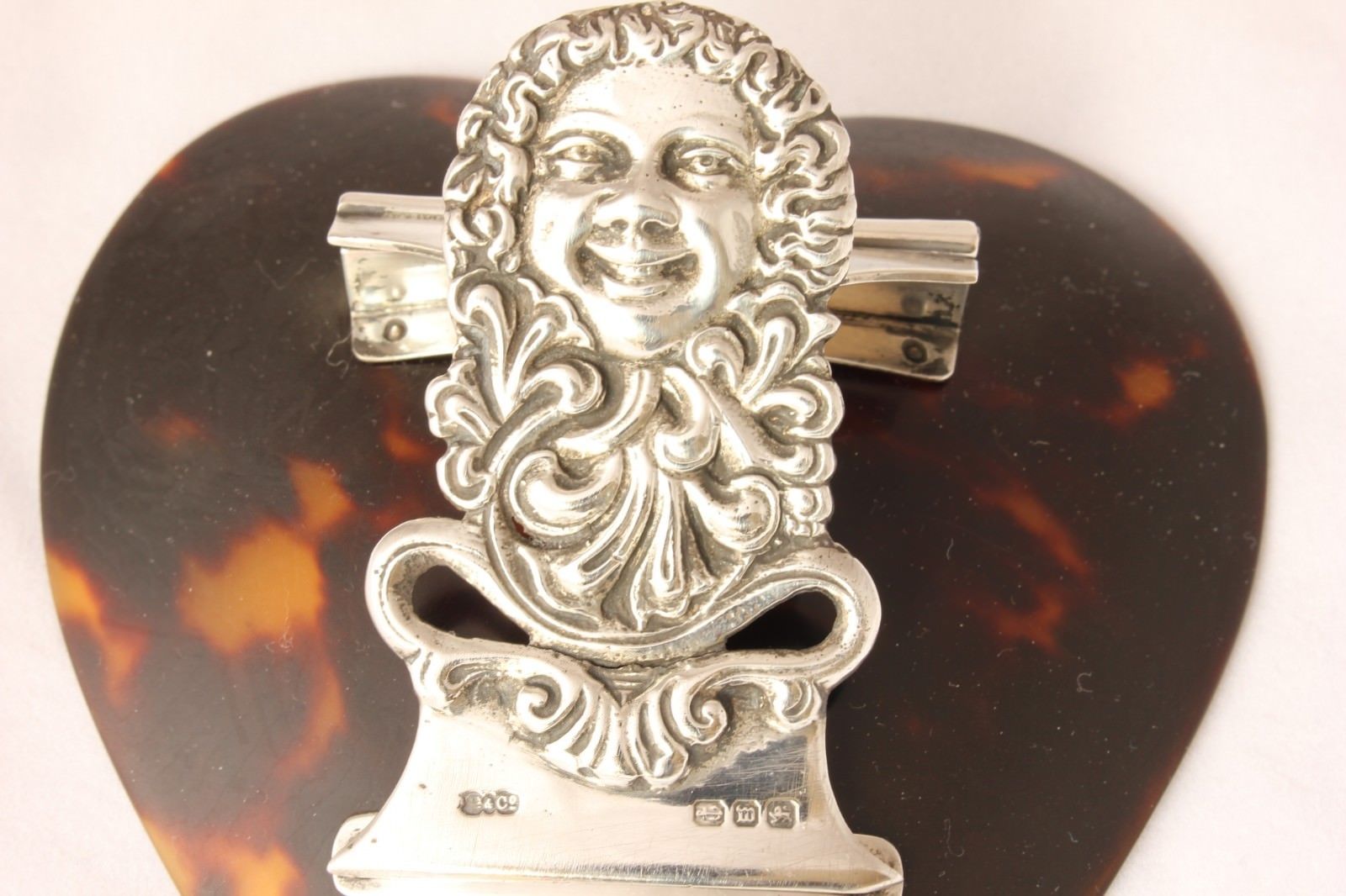 This wonderful antique stationery / letter clip has a silver spring hinged clip which is the form of a cheeky face and this is mounted to the heart shaped base. The silver clip is hallmarked in several places for Birmingham 1896/1897 and is by renowned novelty silver maker Grey & Co of Oxford Street, London.