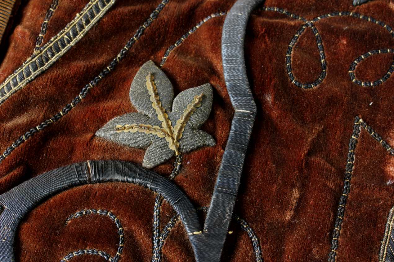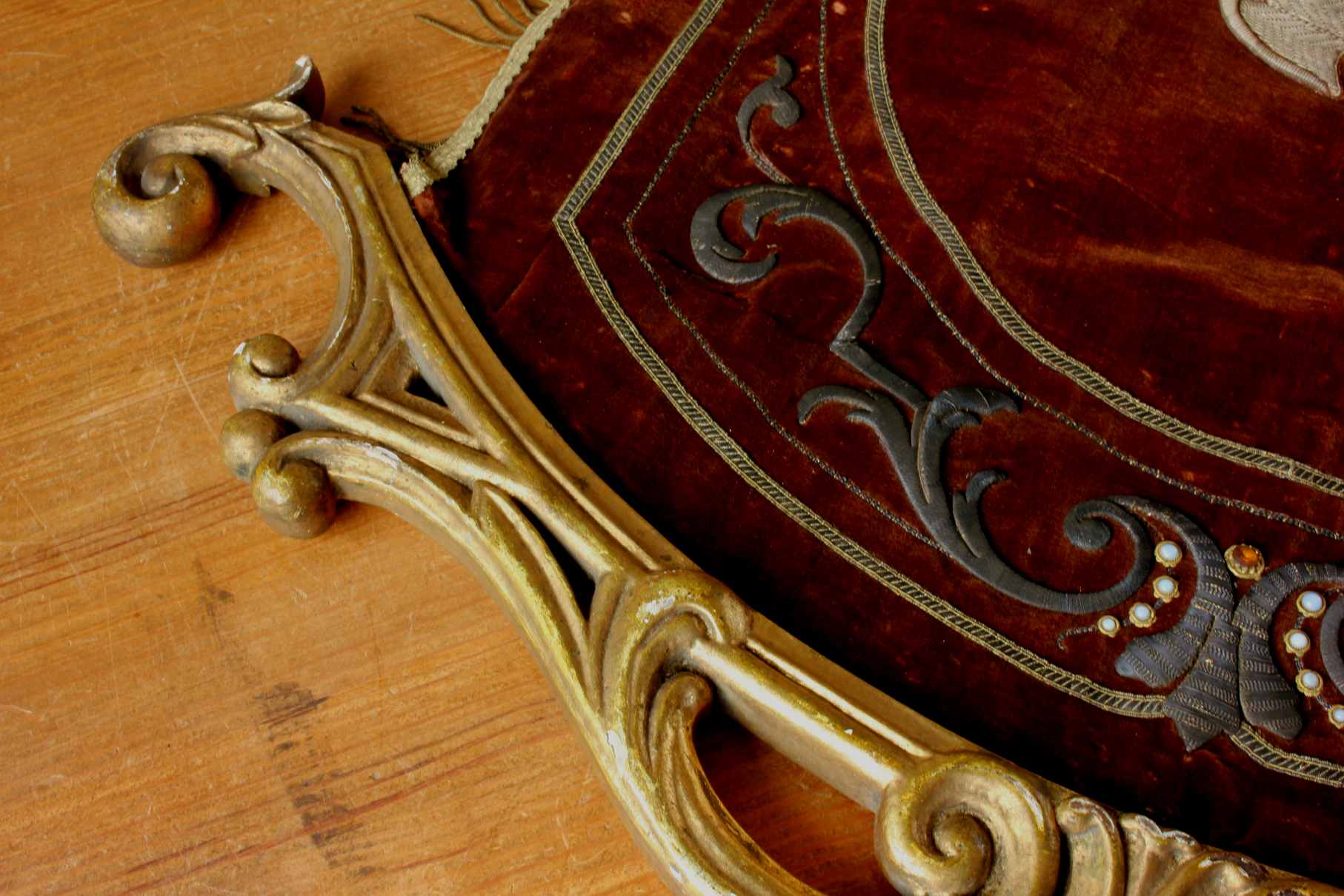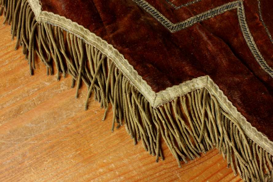 Condition: Very nice decorative antique condition with signs of use with a wonderful look. Some missing gold braid fringe and stones. Some loose threads, small tears and general wear. A small piece missing to the edge of the hanger. Please see pictures.