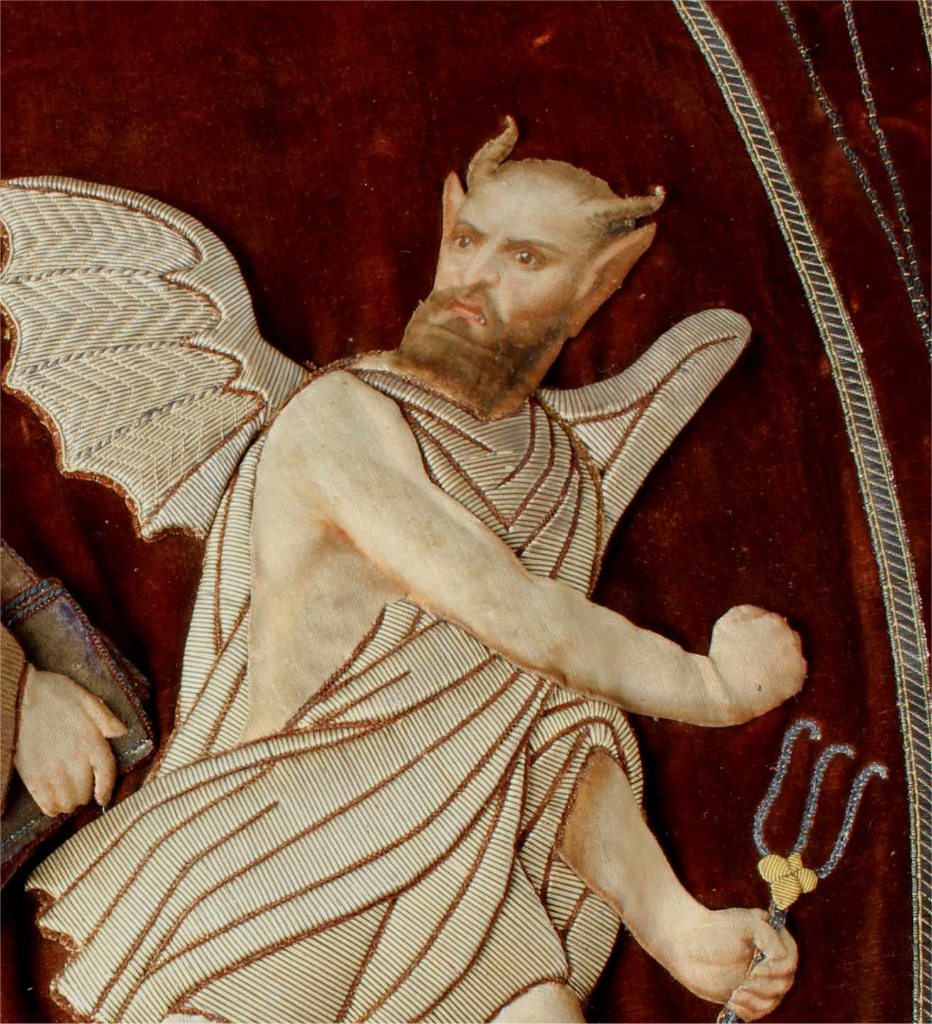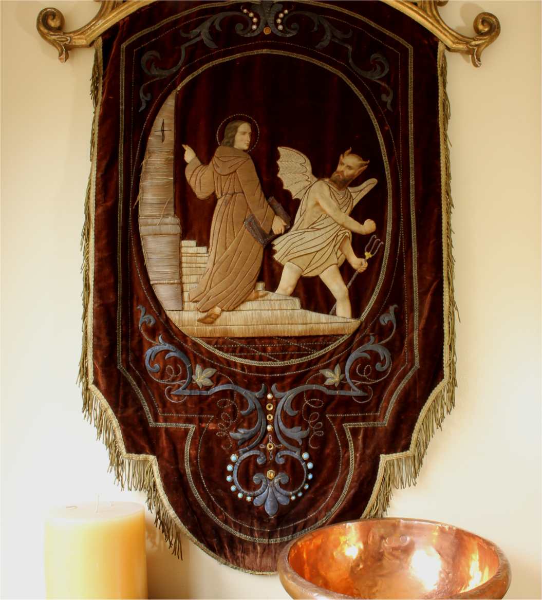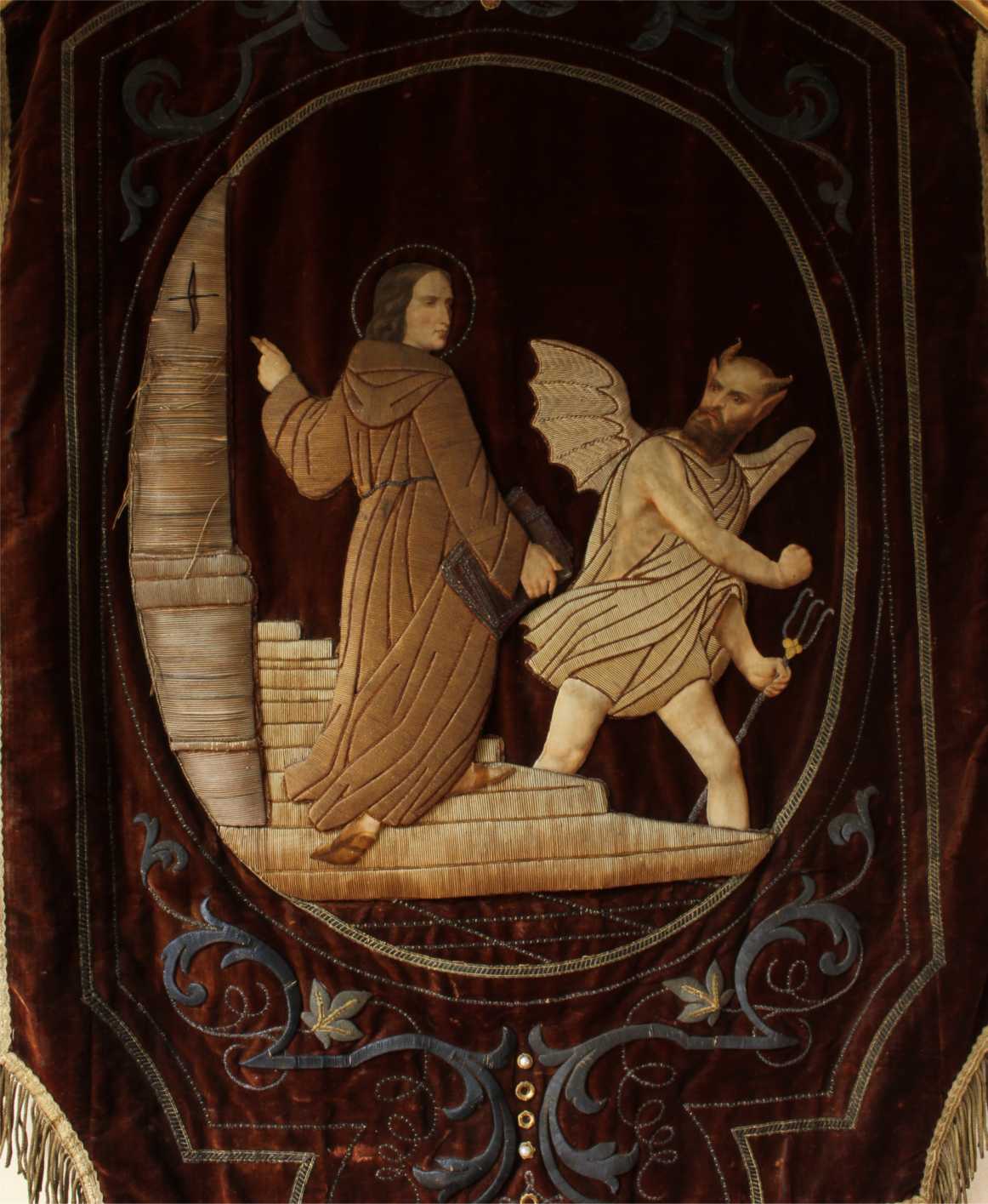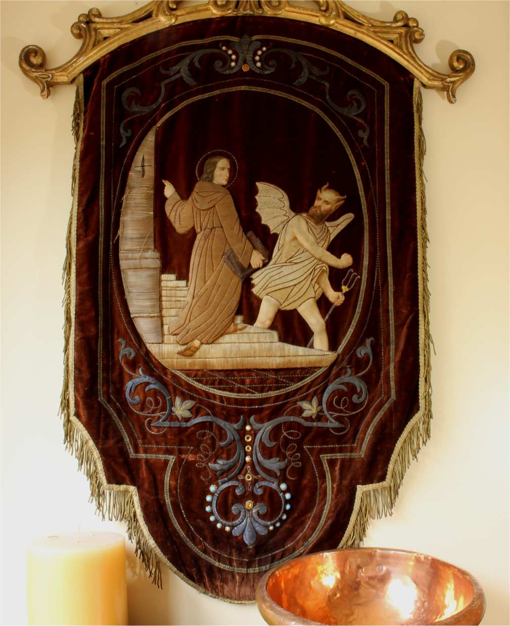 This religious procession banner has a velvet background with gold braid fringing and is decorated with different semi precious stones such as pearls and turquoise. The central scene of the devil and the saint pointing to heaven have wonderful detail such as padded bodies which give a 3D effect, braid stitching and painted faces.
