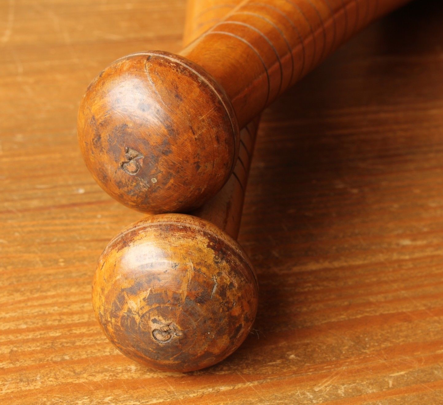 This pair of long wooden Indian clubs or meels which date from the early 20th century have the number 3 stamped on the tops, are approx 780 grams each and are approx 46 cm - 18" in length. Each one is hand made, have cut rings around the grips and lead weigh added to the base to make them heavier.