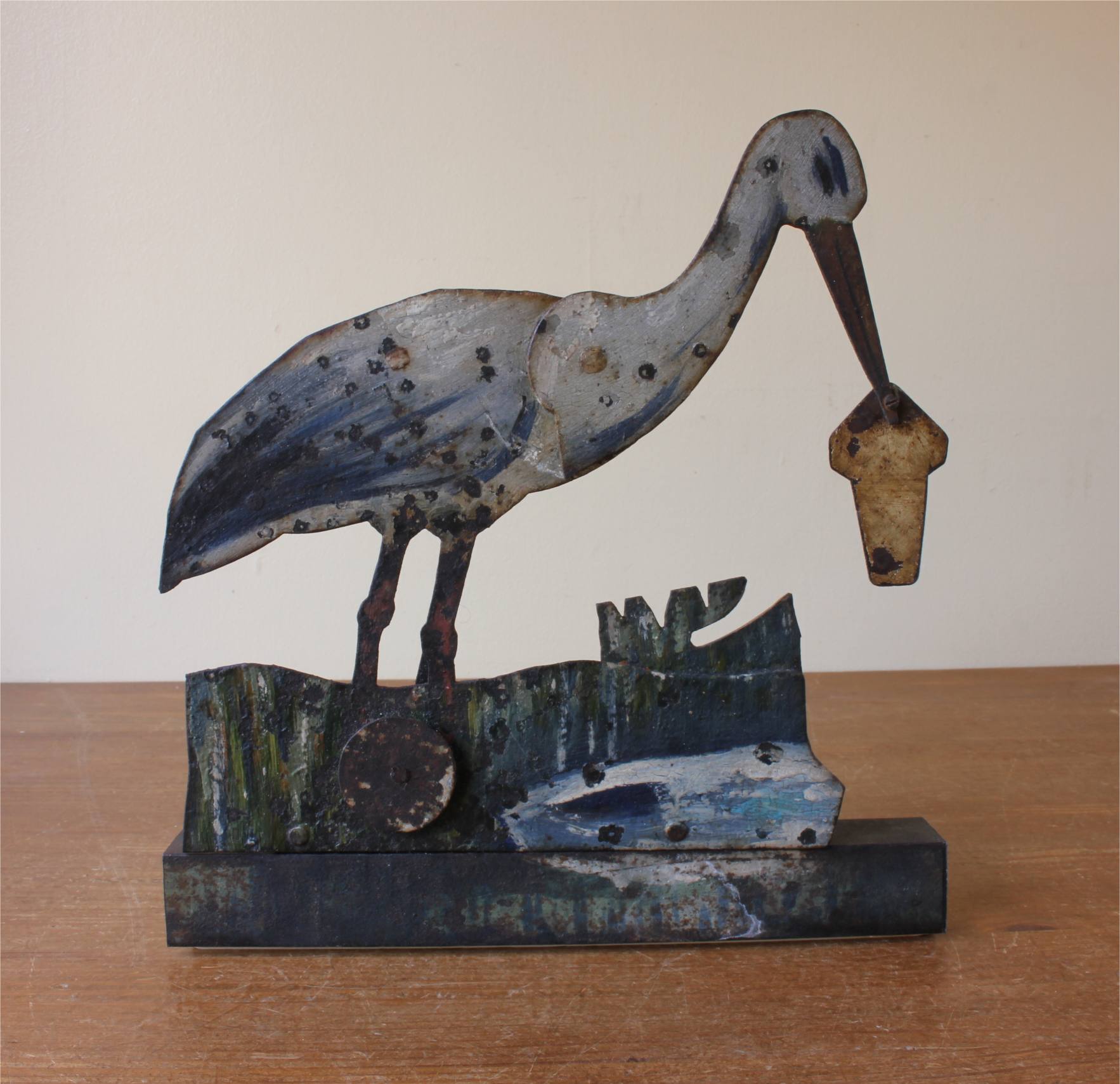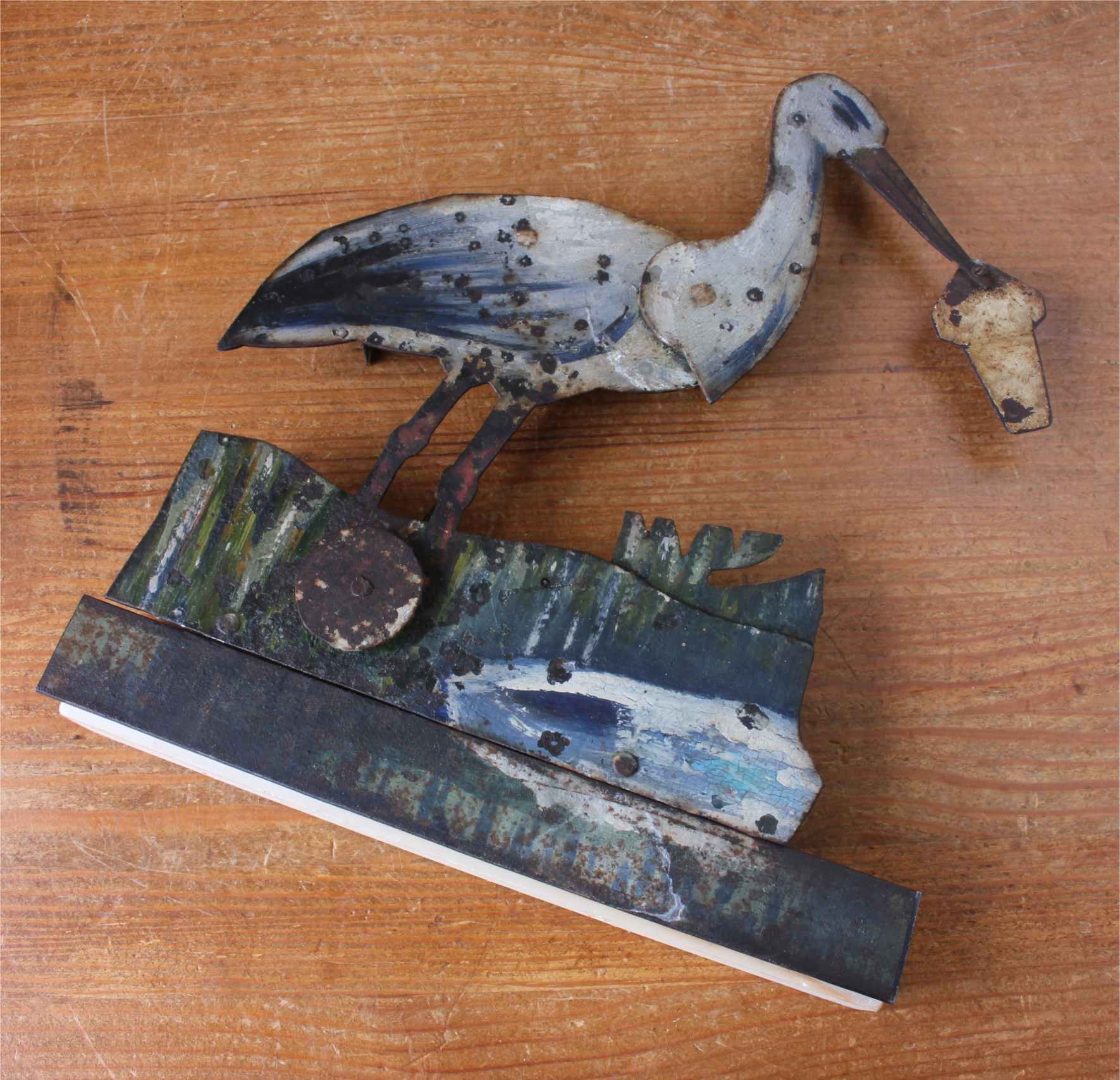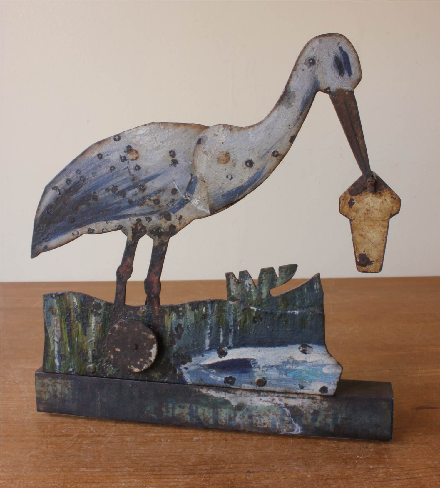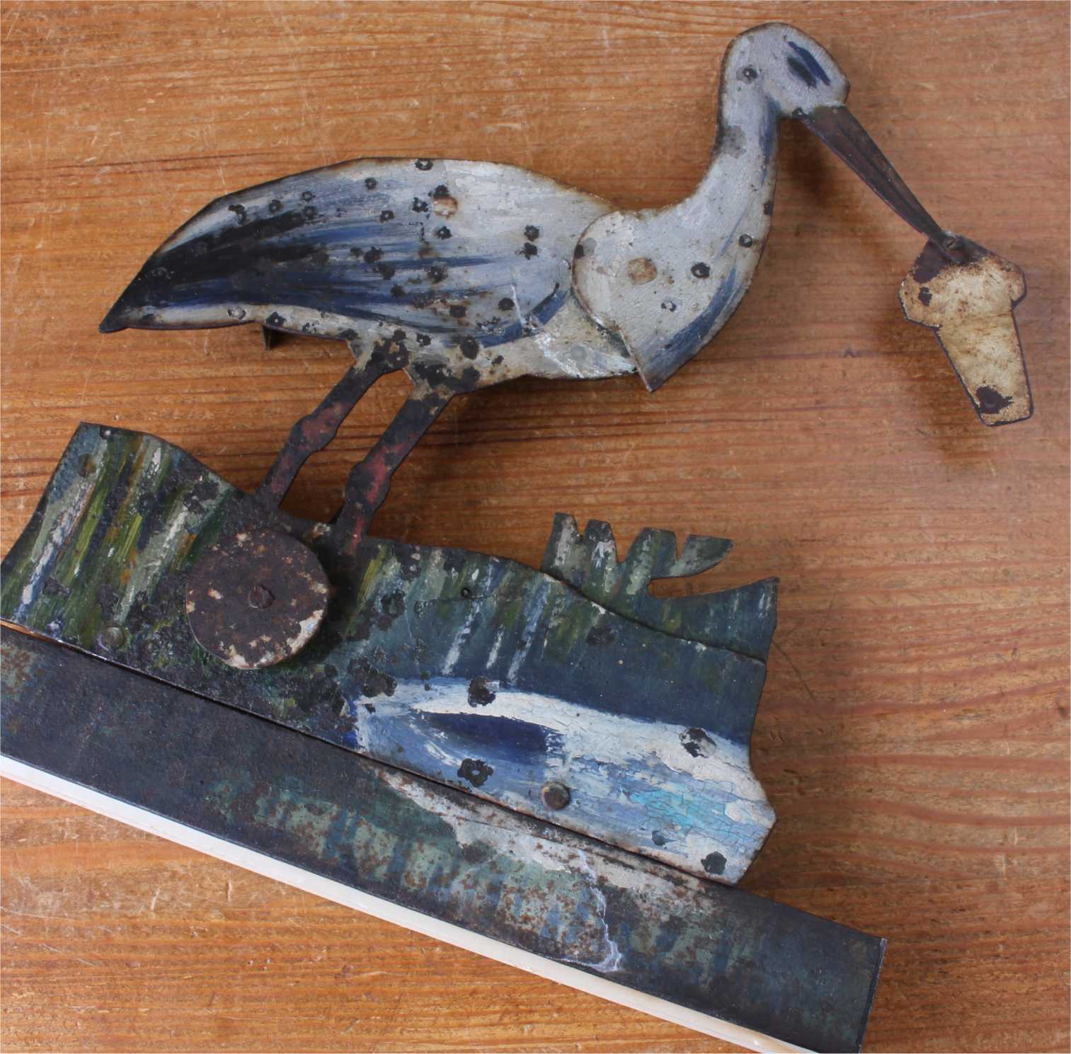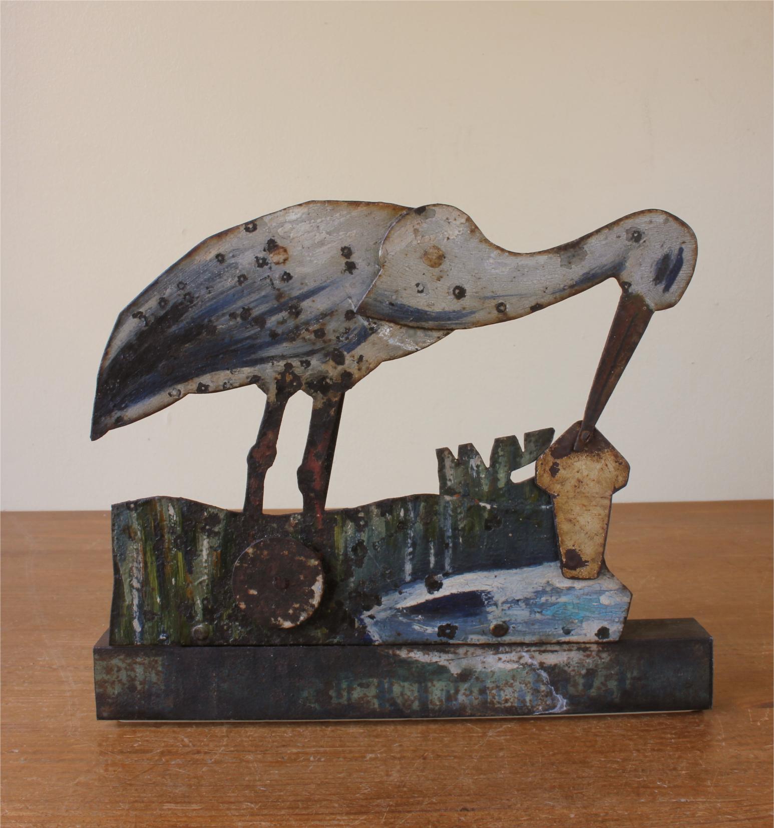 This highly collectible antique French carnival shooting gallery target which is of a heron fishing is made of painted metal, dates from the late 19th century and has mechanical workings.