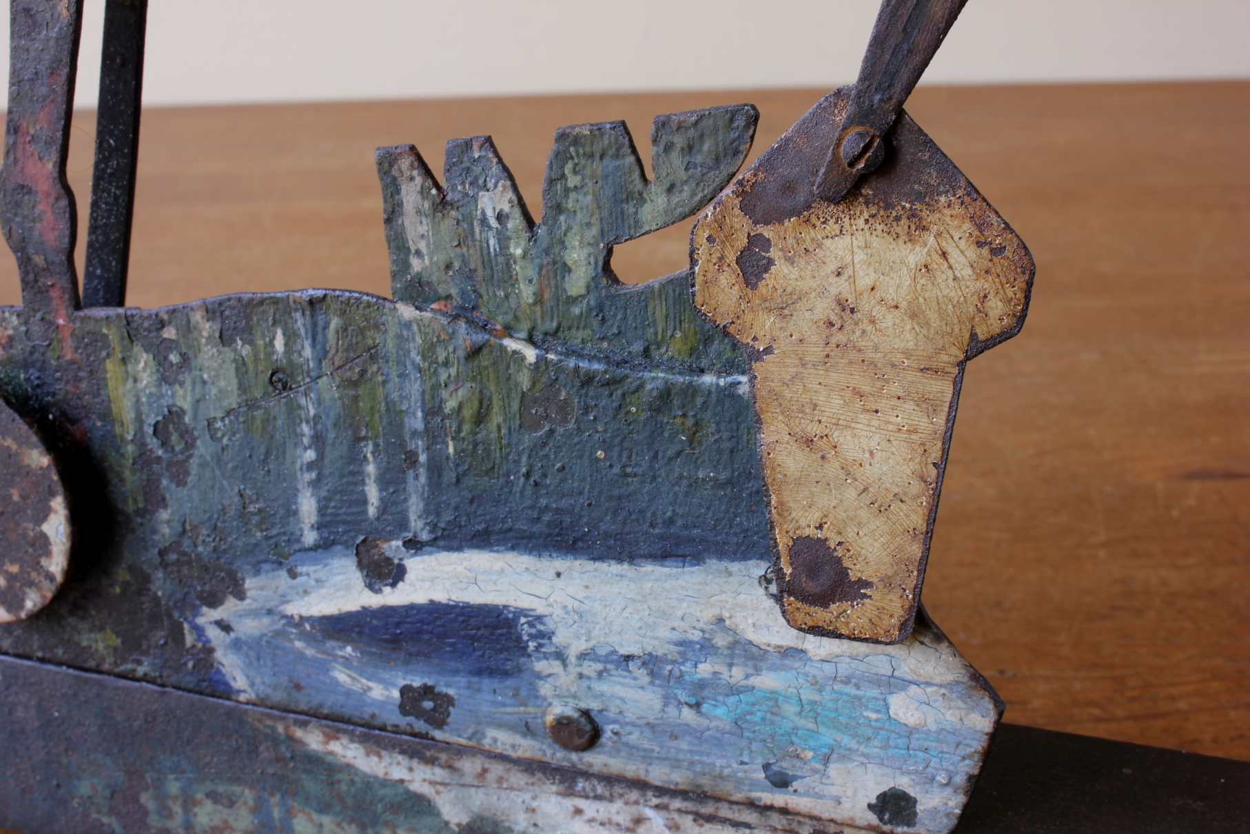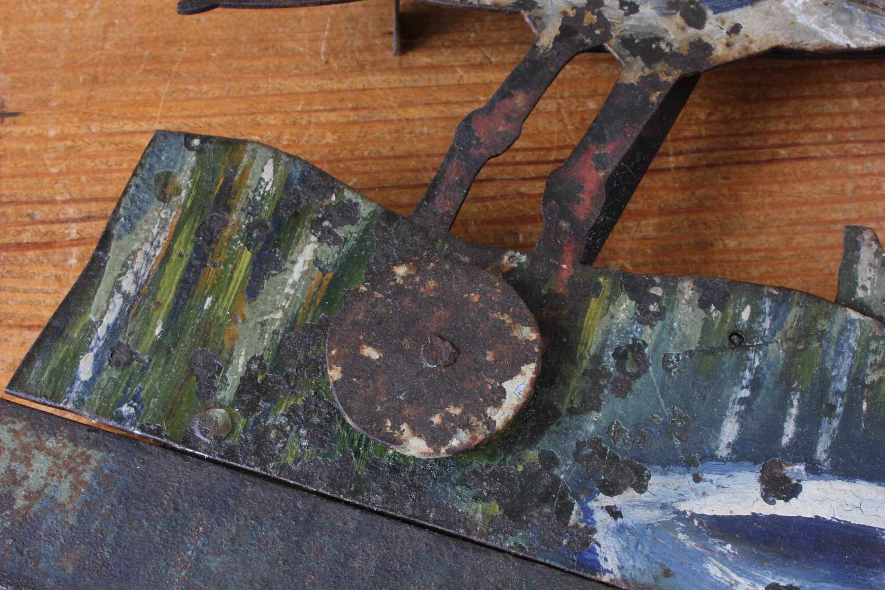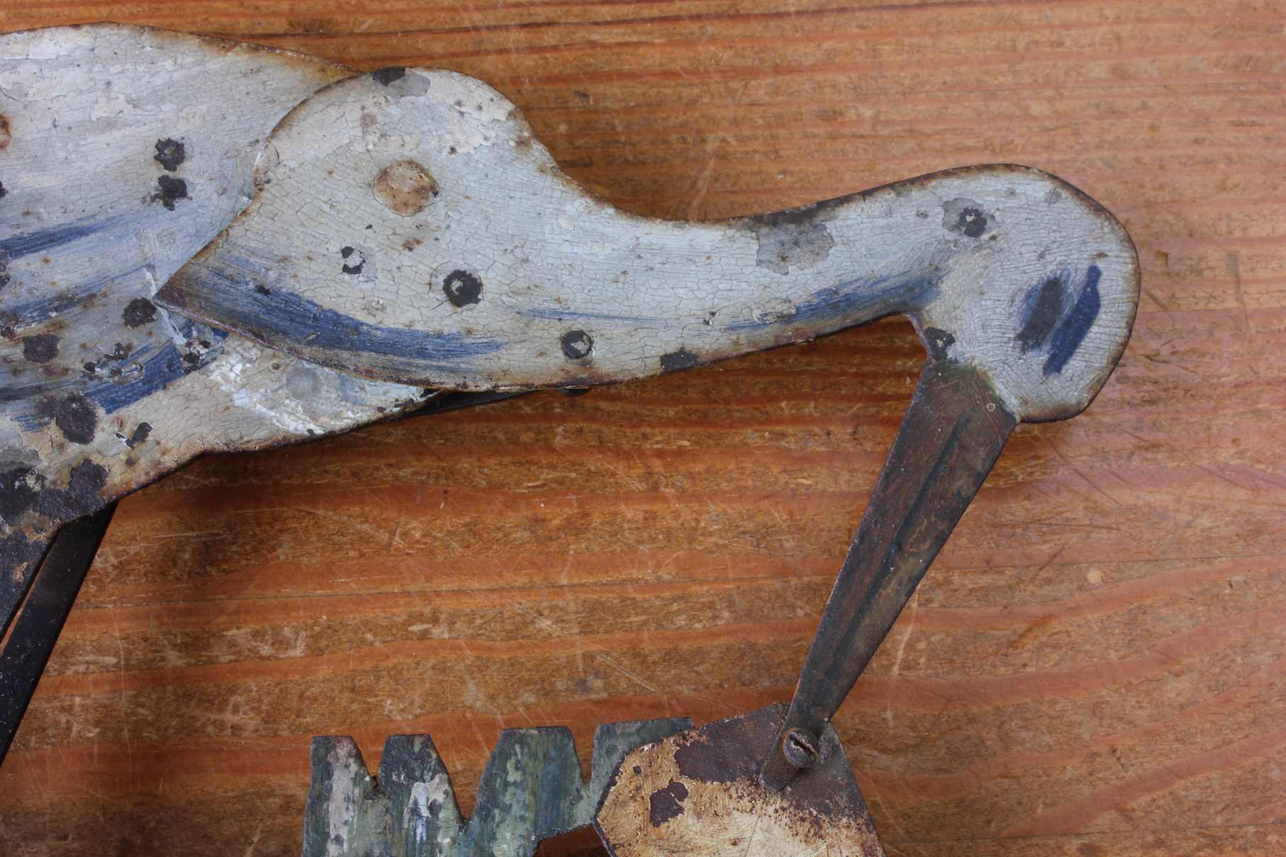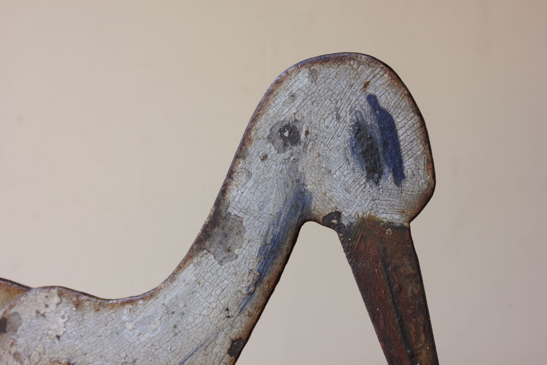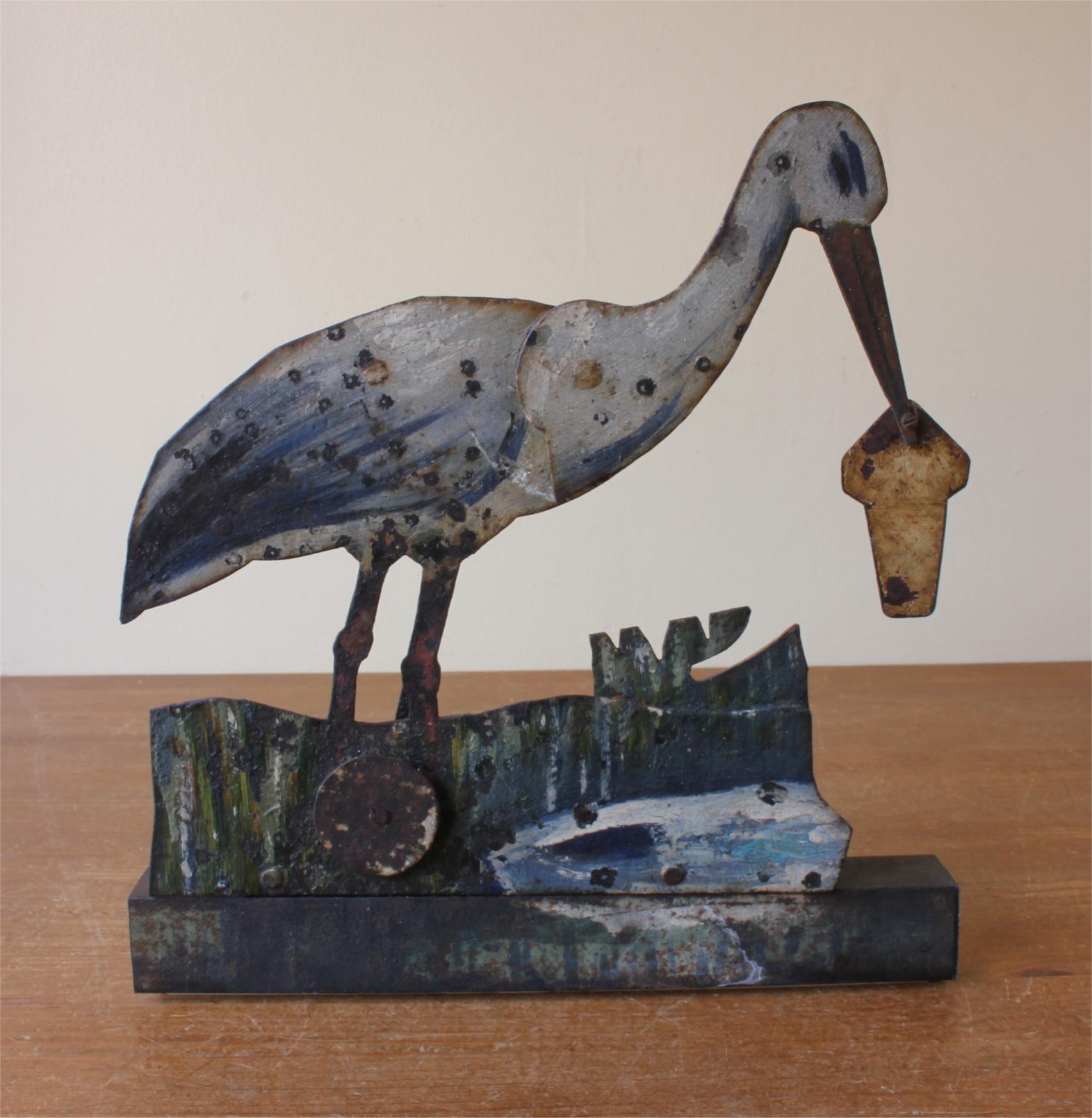This highly collectible antique French carnival shooting gallery target which is of a heron fishing is made of painted metal, dates from the late 19th century and has mechanical workings.