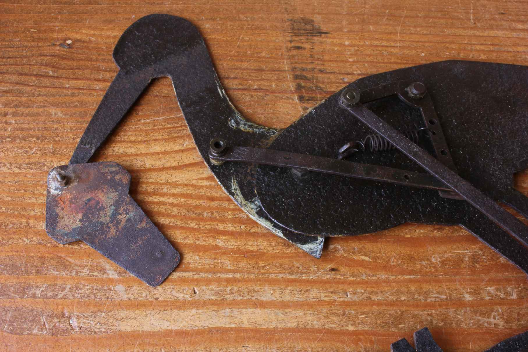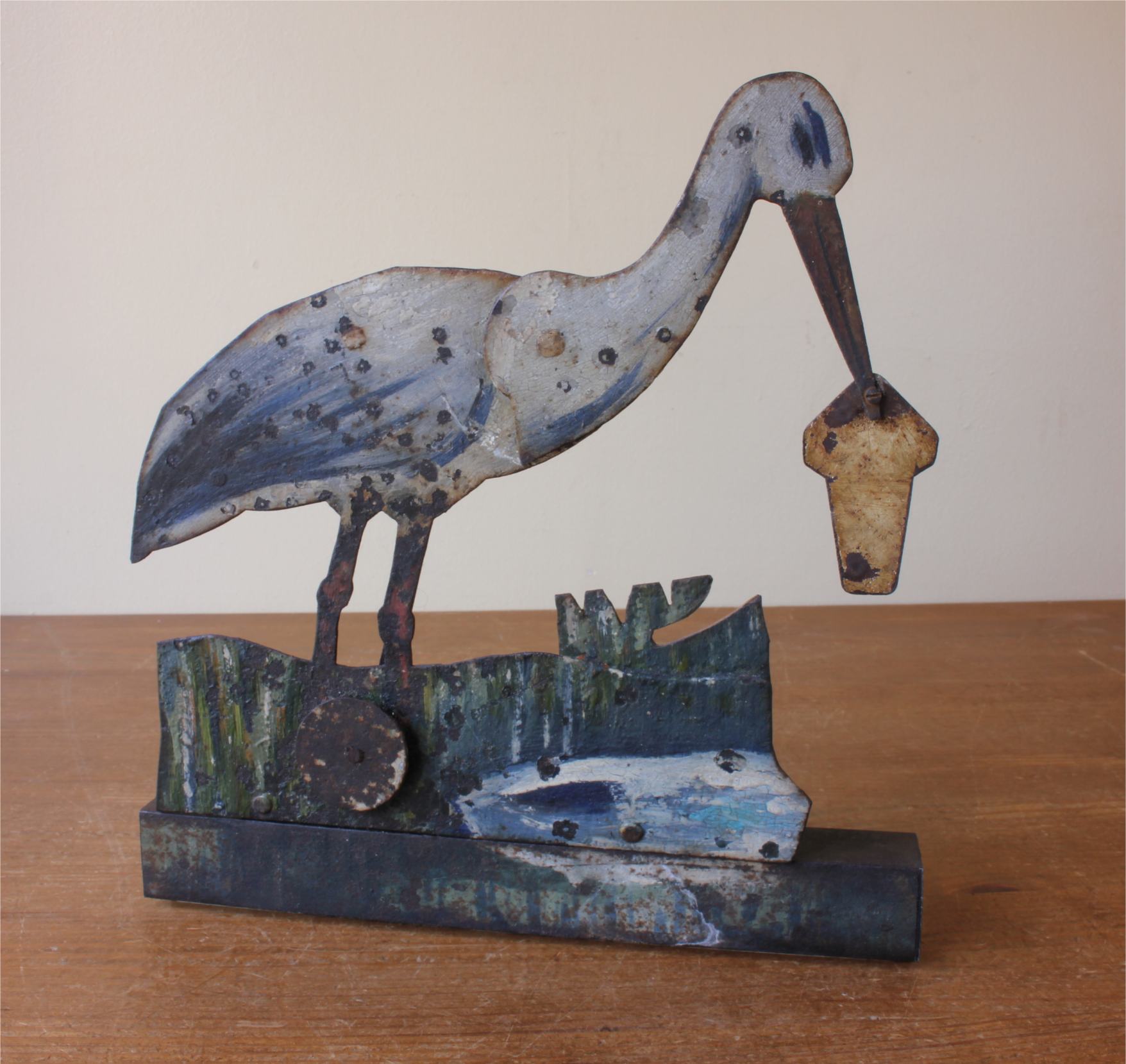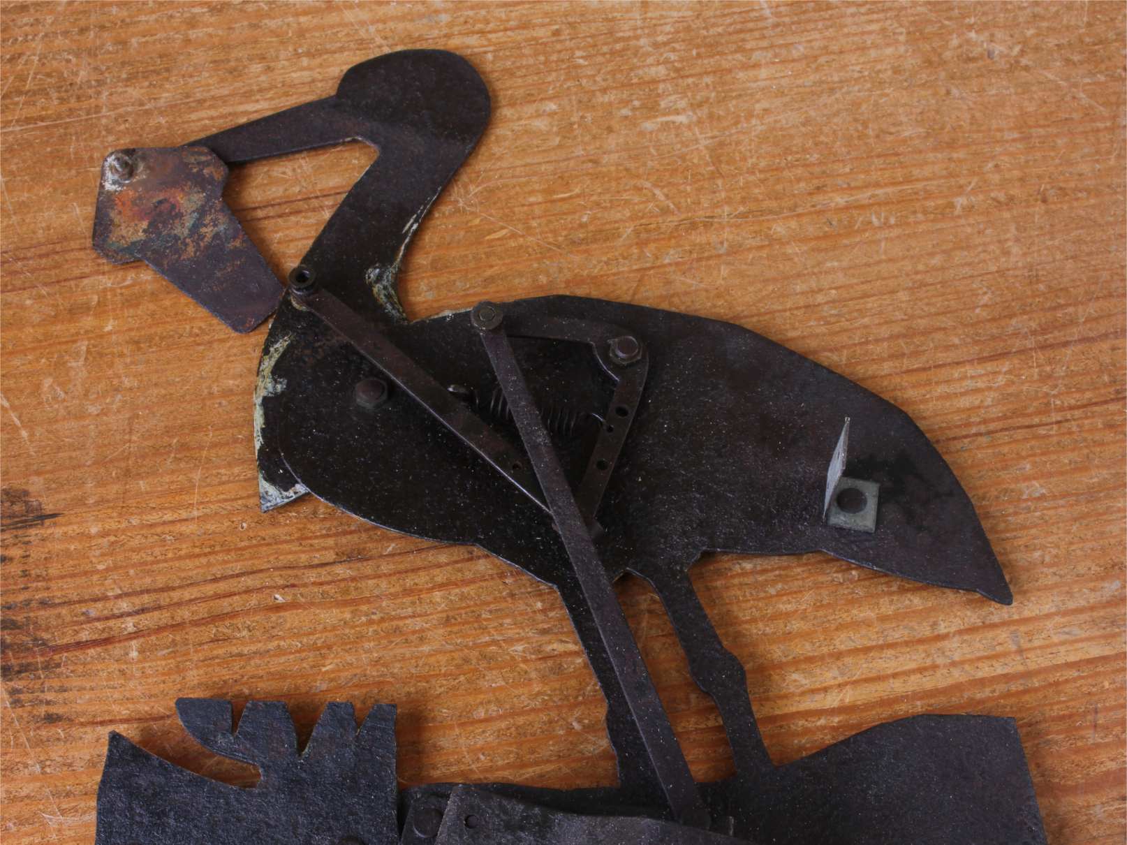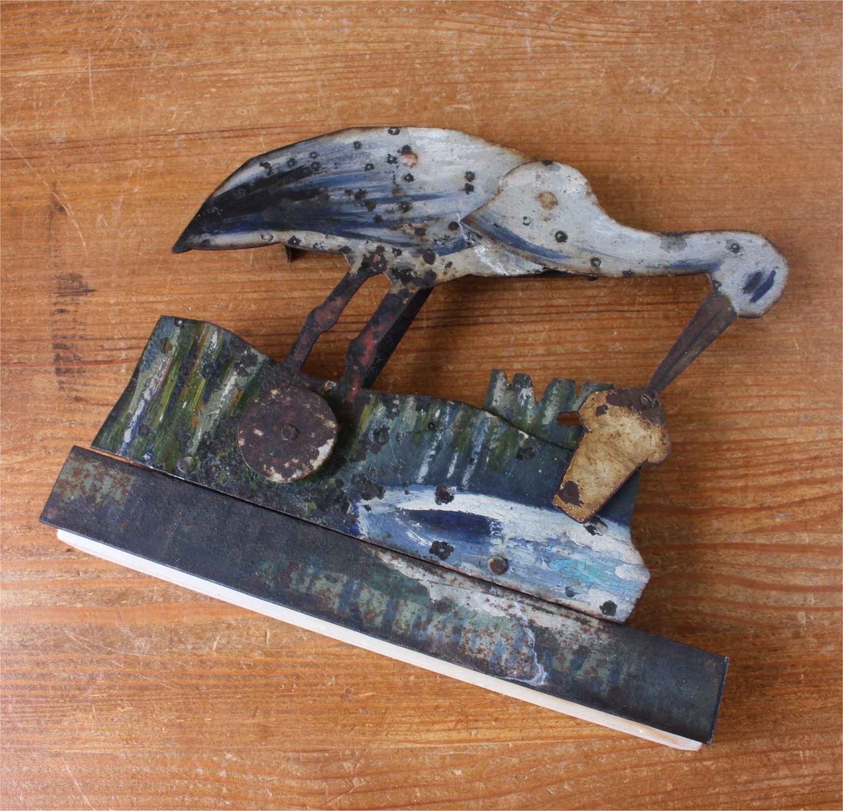 This fascinating automated target would have been part of a fairground shooting game where carnival goers would shoot at the bird and when the target plate was hit the heron would spring upwards to pull the object out of the water with it swinging from it's beak.