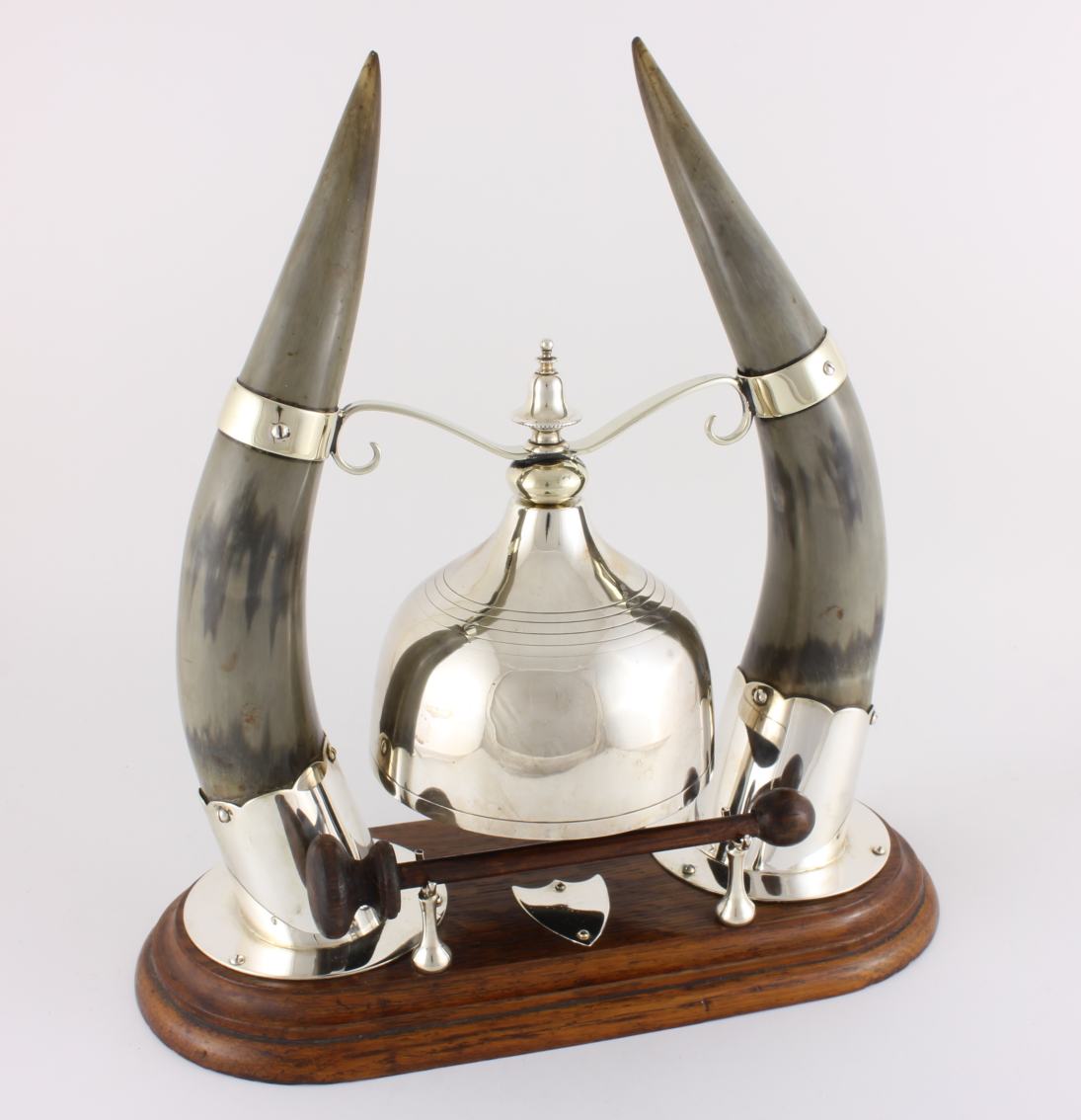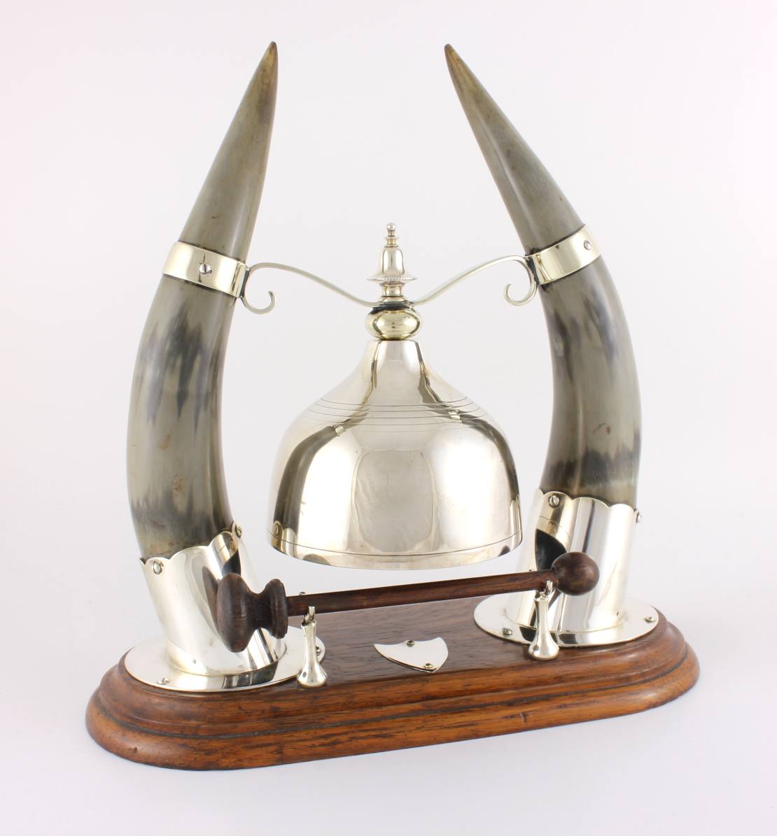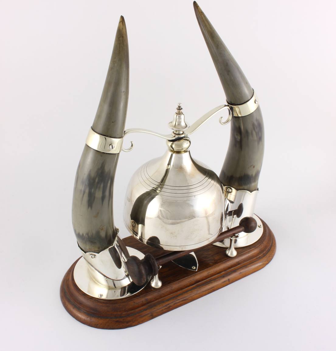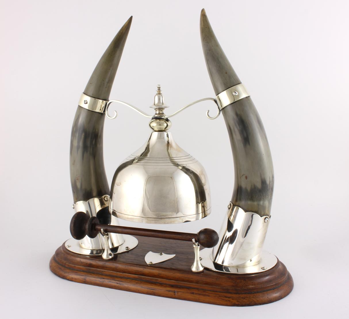 The silver plated gong which is unusual being in the form of a cloche shaped bell is suspended between the two horns by silver plated fittings and makes a nice dong when struck with the wooden striker.