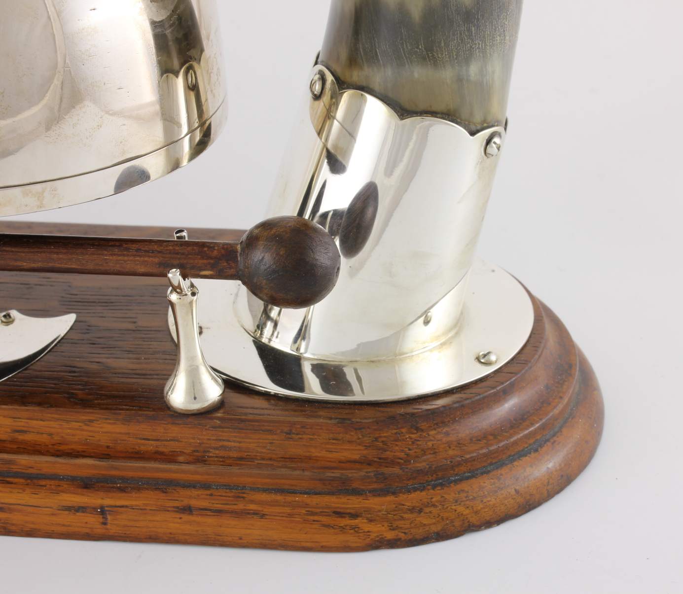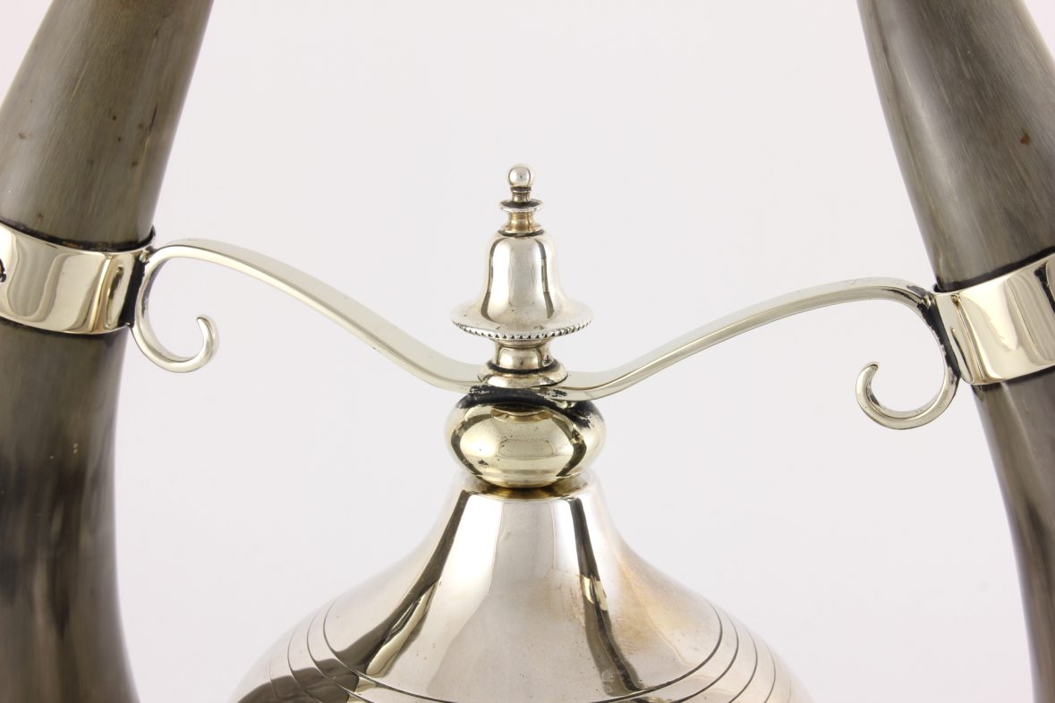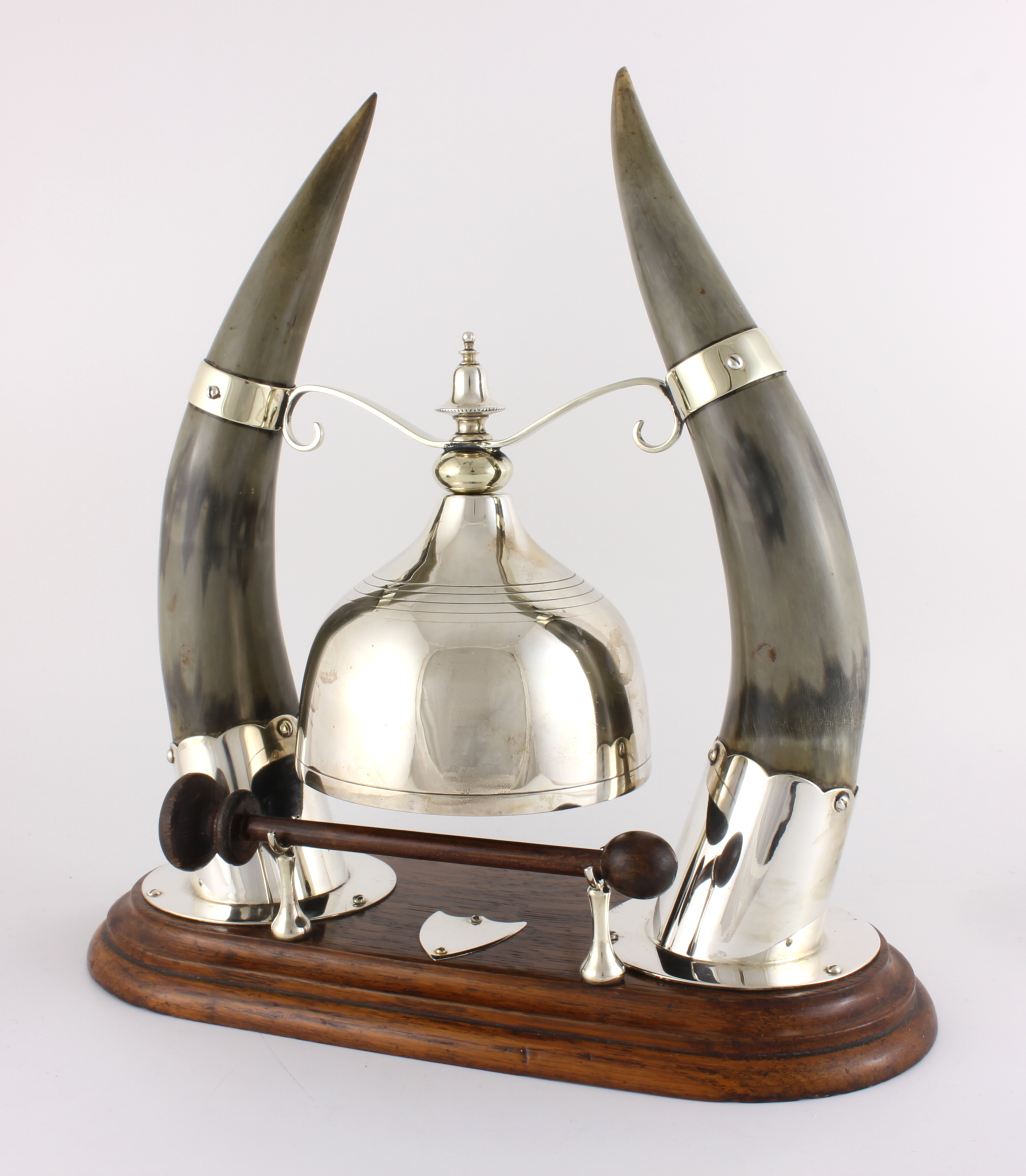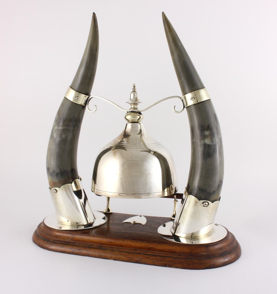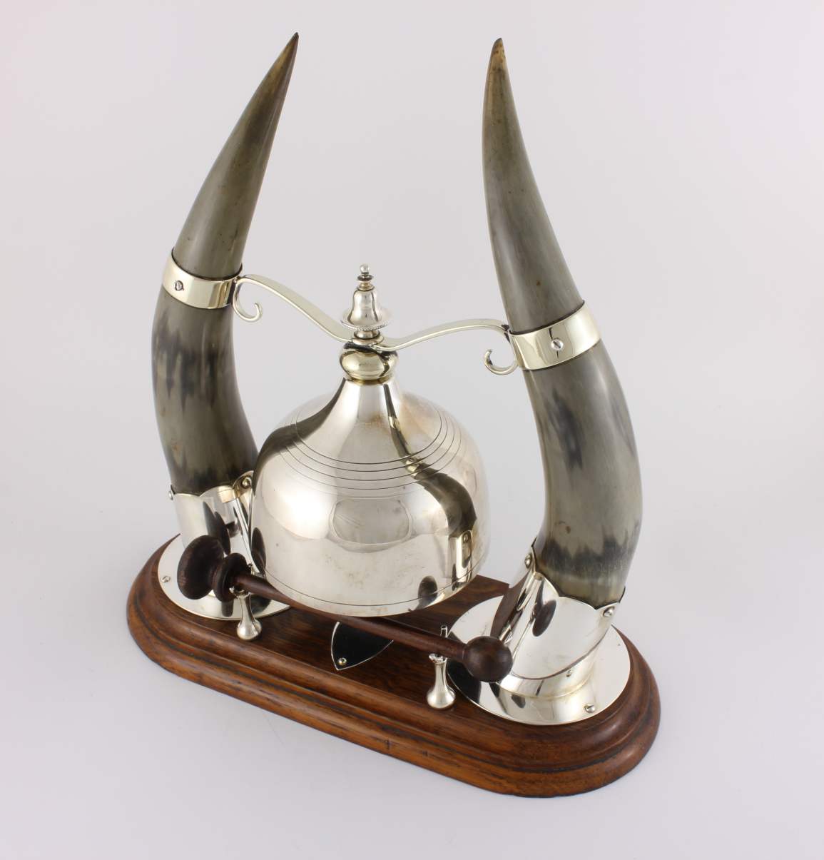 The silver plated gong which is unusual being in the form of a cloche shaped bell is suspended between the two horns by silver plated fittings and makes a nice dong when struck with the wooden striker.