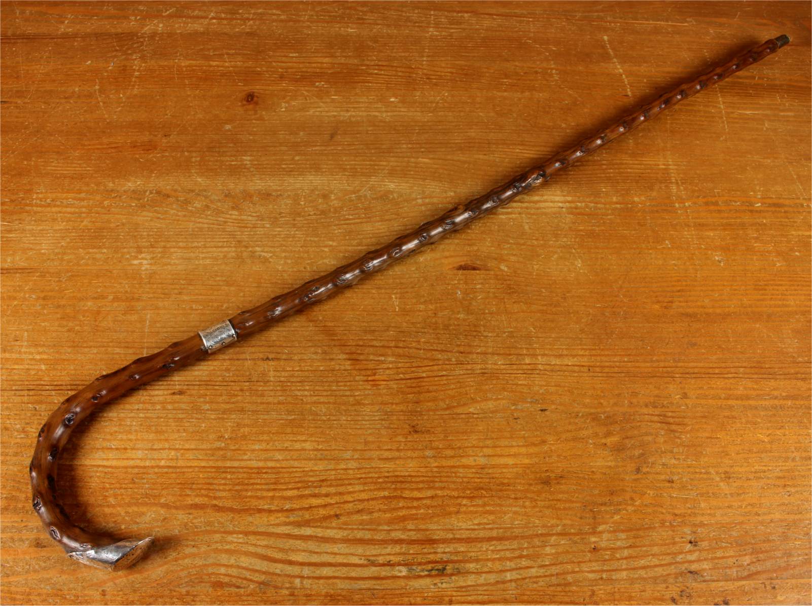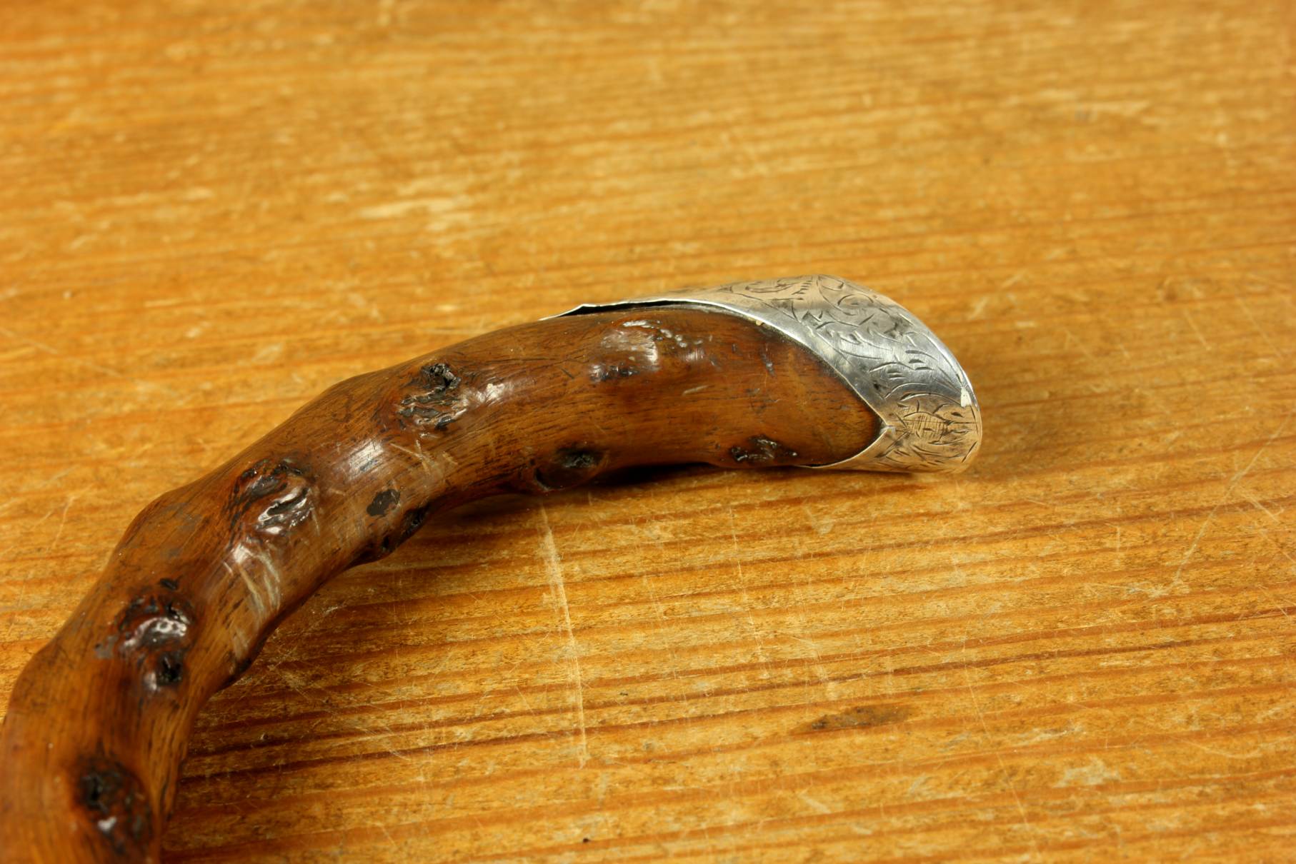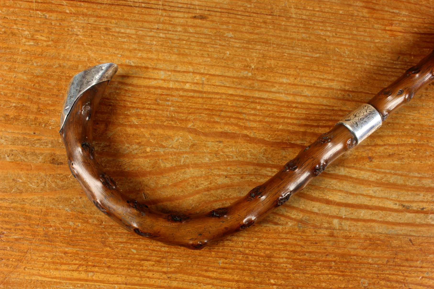 Condition: Very good usable antique condition with light signs of use in keeping with age. Some scratches and bruises to silver and general wear. There is a natural curve to the stick being made of thorn wood. Please see pictures.